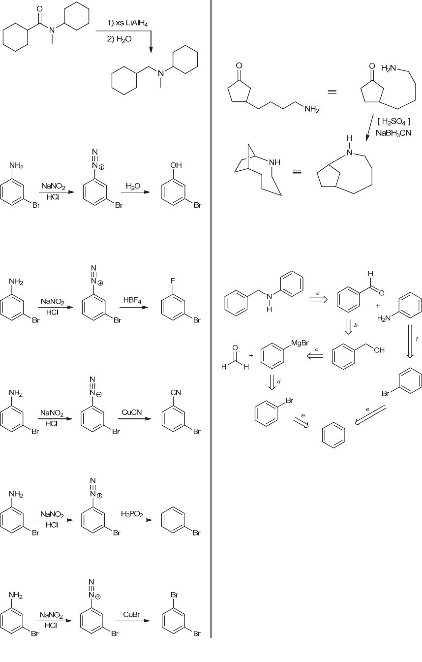 944 CHAPTER 22 22.66. (a) Upon treatment with water, the diazonium group is replaced with a hydroxyl group, giving meta- bromophenol: (b) Upon treatment with HBF4, the diazonium group is replaced with a fluorine atom (via a Schiemann reaction), as shown: (c) Upon treatment with CuCN, the diazonium group is replaced with a cyano group via a Sandmeyer reaction: (d) Upon treatment with H3PO2, the diazonium group is replaced with a hydrogen atom, giving bromobenzene: (e) Upon treatment with CuBr, the diazonium group is replaced with a bromine atom via a Sandmeyer reaction: 22.67. In this case, the carbonyl group and the amino group are tethered together (both functional groups are present in one compound), so we expect an intramolecular reductive amination to occur, thereby forming a new ring to give a bicyclic product, as shown: 22.68. (a) There are certainly many acceptable solutions to this problem. One such solution derives from the following retrosynthetic analysis. An explanation of each of the steps (a-f) follows. a. The product is a secondary amine, which can be made from benzaldehyde and aniline via a reductive amination. b. Benzaldehyde can be made from benzyl alcohol via oxidation (with PCC or with DMP or via a Swern oxidation). c. Benzyl alcohol can be made from phenyl magnesium bromide and formaldehyde, via a Grignard reaction. d. Phenyl magnesium bromide can be made from bromobenzene, upon treatment with magnesium. e. Bromobenzene can be made from benzene via an electrophilic aromatic substitution reaction. f. Aniline can be made from bromobenzene via elimination-addition. www.MyEbookNiche.eCrater.com