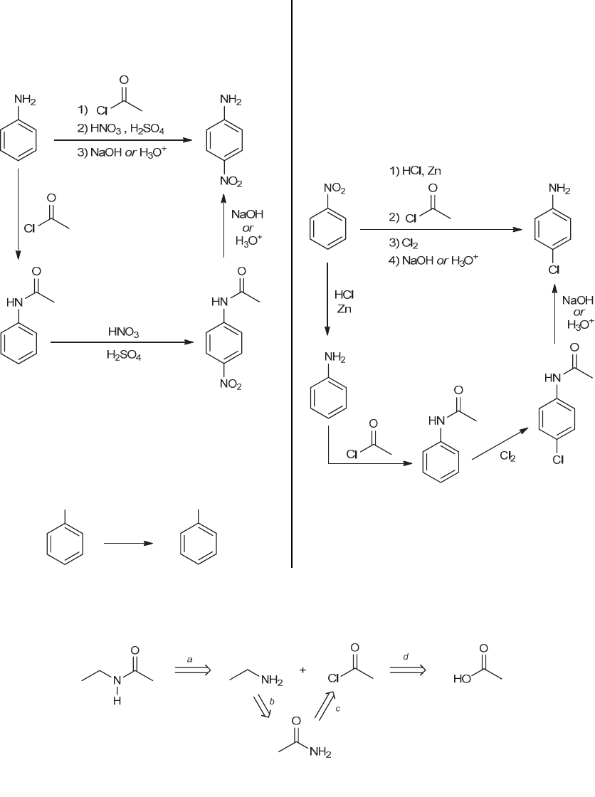 924 CHAPTER 22 22.20. Acetylation of the amino group allows for direct nitration of the ring (in the para position). After nitration is complete, the acetyl group can be removed in aqueous basic or acidic conditions: 22.21. Direct chlorination of nitrobenzene would result in a meta-disubstituted product (because the nitro group is meta-directing). So we must first reduce the nitro group into an amino group, thereby converting a meta director into an ortho-para director: NH2NO2 Monochlorination of aniline (in the para position) will then give the product. Unfortunately, aniline will not efficiently undergo monochlorination (the ring is too highly activated to install just one chlorine atom). However, the strongly activating effect of the amino group can be temporarily diminished via acetylation. Then, after monochlorination has been performed, the acetyl group can be removed in aqueous basic or acidic conditions. The entire synthesis is shown here: 22.22. There are certainly many acceptable solutions to this problem. One such solution derives from the following retrosynthetic analysis. An explanation of each of the steps (a-d) follows. a. The product can be made from ethyl amine and acetyl chloride, via a nucleophilic acyl substitution reaction. b. Ethyl amine can be made from acetamide via reduction with LiAlH4, followed by water work-up. c. Acetamide can be made from acetyl chloride, via a nucleophilic acyl substitution reaction. d. Acetyl chloride can be made from acetic acid upon treatment with thionyl chloride. Now let’s draw the forward scheme. Acetic acid is treated with thionyl chloride to give acetyl chloride. One equivalent of acetyl chloride is converted into ethyl amine (via aminolysis, followed by reduction), which is then treated with another equivalent of acetyl chloride to give the product: www.MyEbookNiche.eCrater.com