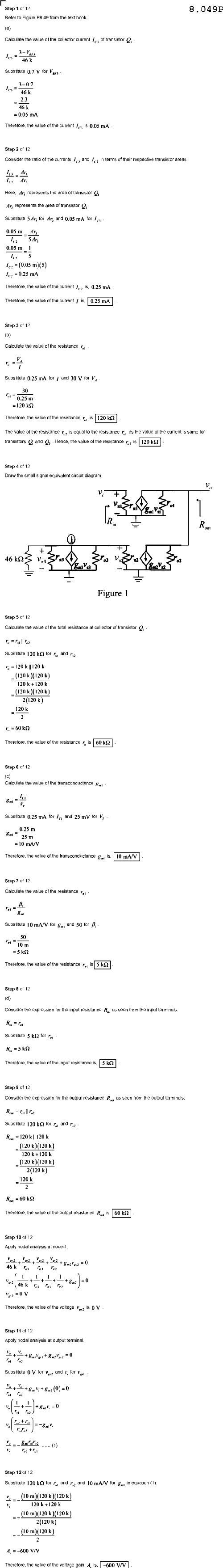 8.049P Refer Figure P8.49 from the text book (a) Calculate the of the collector current of transistor Substitute 3-0.7 2.3 =0.05 mA Therefore the value current 0.05 mA Consider ratio of currents and of their respective transistor areas Here, Ar, represents area Ar, represents area transistor Substitute for Ar, and 0.05 mA for 0.05 m Ar, 0.05 m Therefore the value of the current 0.25 mA Therefore the value current 0.25 mA @ Calculate value of the resistance Substitute 0.25 mA for and 30 30 0.25 m Therefore the value resistance The value of the resistance resistance as the value of the current transistors and Hence the value of the resistance Draw small signal equivalent circuit diagram + of + & Figure Calculate the value o the total resistance collector transistor Substitute and 2(120k) Therefore the value resistance Step 6 of 12 (c) Calculate alue transconductance Substitute 0.25 mA for and mV 0.25 m 25 m the transconductance 10 mA/V Step 7 of 12 Calculate value resistance Substitute and 50 Therefore the value of resistance (d) Consider expression for the input resistance R. input terminals Substitute Therefore the value input Conside expression for the output resistance from the Substitute 2(120k) Therefore value of output resistance Apply nodal analysis =0 the the voltage Apply analysis Substitute of Substitute and and 10 mA/V for (1). 2(120k) Therefore voltage -600 V/V