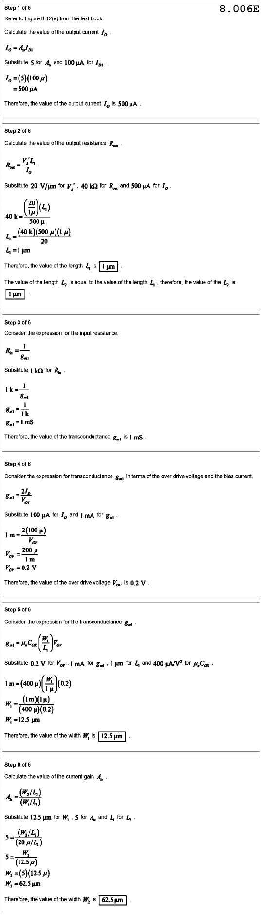 Step of 6 8.006E Refer to Figure 8.12(a) from the text book. Calculate the value of the output current I₀ Substitute 5 for and 100 for Therefore, the value of the output current is 500 Step of 6 Calculate the value of the output resistance Substitute 20 V/µm for 40 for and 500 for 40 k = 20 500 4 = 20 4 µm Therefore, the value of the length 4 is 1 The value of the length 4 is equal to the value of the length 4 therefore, the value of the is 1 µm Step of 6 Consider the expression for the input resistance. Substitute kΩ for 1 1k 8ml 1 k 8ml mS Therefore, the value of the transconductance 8ml is mS Step of 6 Consider the expression for transconductance 8ml in terms of the over drive voltage and the bias current. Substitute 100 for and 1 mA for 1 m 200 m 0.2 V Therefore, the value of the over drive voltage is 0.2 V Step of 6 Consider the expression for the transconductance = Substitute 0.2 V for mA for 8ml 1 µm for 4 and 400 for = 12.5 µm Therefore, the value of the width is 12.5 µm Step of 6 Calculate the value of the current gain = Substitute 12.5 µm for 5 for and 4 for 5 5 W₂ Therefore, the value of the width is 62.5 µm