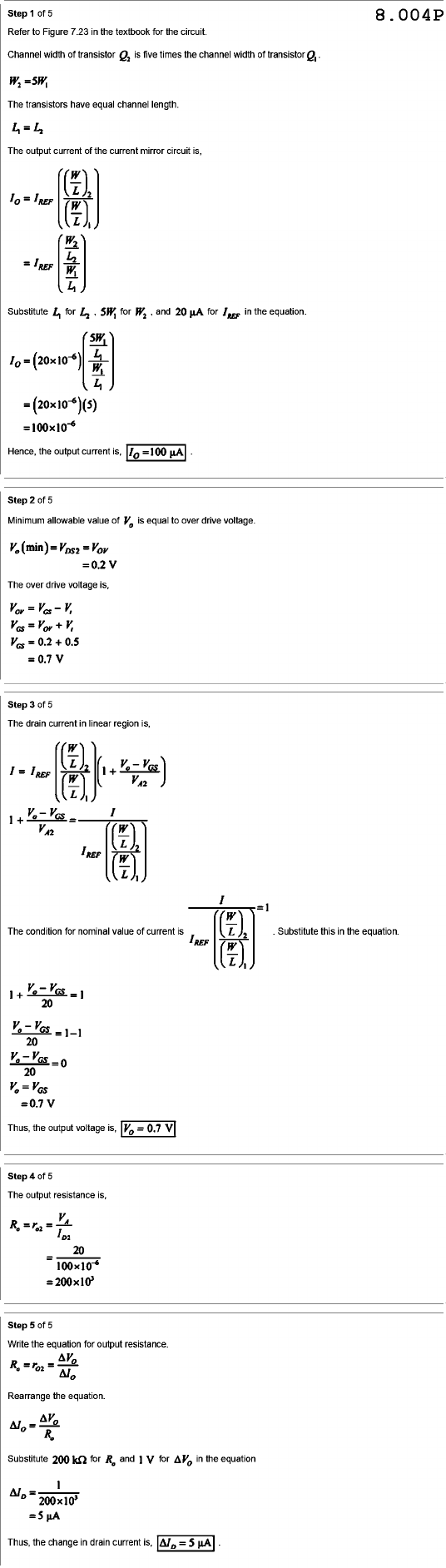 Step of 5 8.004P Refer to Figure 7.23 in the textbook for the Channel width of transistor is five times the channel width of transistor The transistors have equal channel length. 4=4 The output current of the current mirror circuit is, W Substitute 4 for for and 20 for in the equation. 5W, =100x10⁻⁶ Hence, the output current is, Step of 5 Minimum allowable value of is equal to over drive voltage. The over drive voltage is, = 0.7 V Step of 5 The drain current in linear region is, I W I The condition for nominal value of current is Substitute this in the equation. 20 20 20 =0.7 V Thus, the output voltage is, Step of 5 The output resistance is, 20 = Step of 5 Write the equation for output resistance. Rearrange the equation. Substitute 200 kΩ for R. and 1 V for in the equation 1 Thus, the change in drain current is,