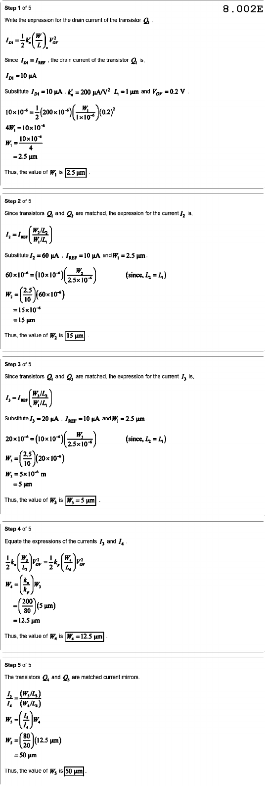 Step of 5 8.002E Write the expression for the drain current of the transistor Since = the drain current of the transistor is, = 10 µA Substitute = 10 = 200 4 = µm and = 0.2 V = 2.5 µm Thus, the value of W₁ is Step 2 of 5 Since transistors and are matched, the expression for the current is, I₂ Substitute I₂ = 60 , = 10 and W₁ = 2.5 W₂ = = 15 µm Thus, the value of is Step 3 of 5 Since transistors and are matched, the expression for the current is, = Substitute = 20 = 10 and = 2.5 (since, L₂ = 4) = m = 5 µm Thus, the value of W₃ is Step 4 of 5 Equate the expressions of the currents I₃ and 2 = 2 = = = 12.5 µm Thus, the value of is Step 5 of 5 The transistors and are matched current mirrors. = = = µm) = 50 µm Thus, the value of is 50 µm