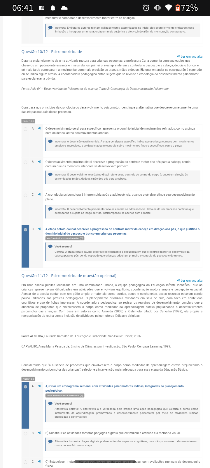 06:41 72% mensurar e comparar 0 desenvolvimento motor entre as crianças. Embora os autores tenham utilizado testes padronizados no eles posteriormente criticaram essa limitação e incorporaram uma abordagem mais subjetiva e afetiva, indo da mensuração comparativa Questão 10/12 Psicomotricidade Ler em VOZ alta Durante 0 planejamento de uma atividade motora para crianças pequenas, a professora Carla comenta com sua equipe que observou um padrão interessante em seus alunos: primeiro, eles aprenderam a controlar 0 pescoço e a cabeça, depois 0 tronco, e so mais tarde começaram a movimentar com mais precisão os braços, mãos e Ela quer entender se esse padrão é esperado ou se indica algum atraso. A coordenadora então sugere que se revisite a cronologia do desenvolvimento psicomotor para esclarecer a Fonte: Aula 04 Desenvolvimento Psicomotor da criança; Tema 2: Cronologia do Desenvolvimento Psicomotor Com base nos principios da cronologia do desenvolvimento psicomotor, identifique a alternativa que descreve corretamente uma das etapas naturais desse processo. Nota: 10.0 A 0 desenvolvimento geral para especifico representa 0 dominio inicial de movimentos refinados, como a pinça com os dedos, antes dos movimentos amplos. Incorreta A descrição A etapa geral para especifico indica que a criança começa com movimentos amplos e imprecisos, e depois adquire controle sobre movimentos finos e especificos, como a pinça. B 0 desenvolvimento próximo-distal descreve a progressão do controle motor dos pés para a cabeça, sendo comum que os membros inferiores se desenvolvam primeiro. Incorreta 0 desenvolvimento próximo-distal refere-se ao controle do centro do corpo (tronco) em direção extremidades (mãos, dedos), e não dos para a C A cronologia psicomotora é interrompida após a quando cérebro atinge seu desenvolvimento pleno. Incorreta 0 desenvolvimento psicomotor não se encerra na Trata-se de um processo continuo que acompanha sujeito ao longo da vida, interrompendo-se apenas com a D 40 A etapa céfalo-caudal descreve a progressão do controle motor da cabeça em direção aos pés, que justifica inicial do pescoço e tronco em crianças pequenas. Você essa alternativa (D) acertou! Correta A etapa céfalo-caudal descreve corretamente a em que controle motor se desenvolve da cabeça para os pés, sendo esperado que crianças adquiram primeiro controle do pescoço e do tronco. Questão 11/12 Psicomotricidade (questão opcional) Ler em alta Em uma escola pública localizada em uma comunidade urbana, a equipe da Educação Infantil identificou que as crianças apresentavam dificuldades em atividades que envolviam equilibrio, coordenação motora ampla e percepção espacial. Apesar de a escola contar com um amplo e materiais como cordas, cones e colchonetes, esses recursos estavam sendo pouco utilizados nas 0 planejamento priorizava atividades em sala de aula, com foco em conteúdos cognitivos e uso de fichas impressas. A coordenadora ao revisar os registros de desenvolvimento, concluiu que a de propostas que envolvessem 0 corpo como mediador da aprendizagem estava prejudicando desenvolvimento psicomotor das crianças. Com base em autores como Almeida (2006) e Kishimoto, citado por Carvalho (1999), ela a reorganização da rotina com a inclusão de atividades psicomotoras ludicas e dirigidas. Fonte ALMEIDA, Laurinda Ramalho Educação e Ludicidade Paulo: Cortez, 2006. CARVALHO, Anna Maria Pessoa de. Ensino de Ciencias por Investigação. Paulo: Cengage Learning, 1999. Considerando que "a ausência de propostas que envolvessem 0 corpo como mediador da aprendizagem estava prejudicando 0 desenvolvimento psicomotor das crianças", selecione a intervenção mais adequada para essa etapa da Educação Nota: 10.0 A A) Criar um cronograma semanal com atividades psicomotoras lúdicas, integradas ao planejamento pedagógico. essa alternativa (A) Você acertou! Alternativa correta: A alternativa a verdadeira pois propõe uma ação pedagógica que valoriza corpo como instrumento de aprendizagem, promovendo desenvolvimento psicomotor por meio de atividades údicas planejadas e sistematicas B B) Substituir as atividades motoras por jogos digitais que estimulem a atenção e a visual. Alternativa Incorreta: Jogos digitais podem estimular aspectos cognitivos, mas não promovem desenvolvimento motor necessário nessa etapa. C C) Estabelecer meta com avaliações mensais de desempenho