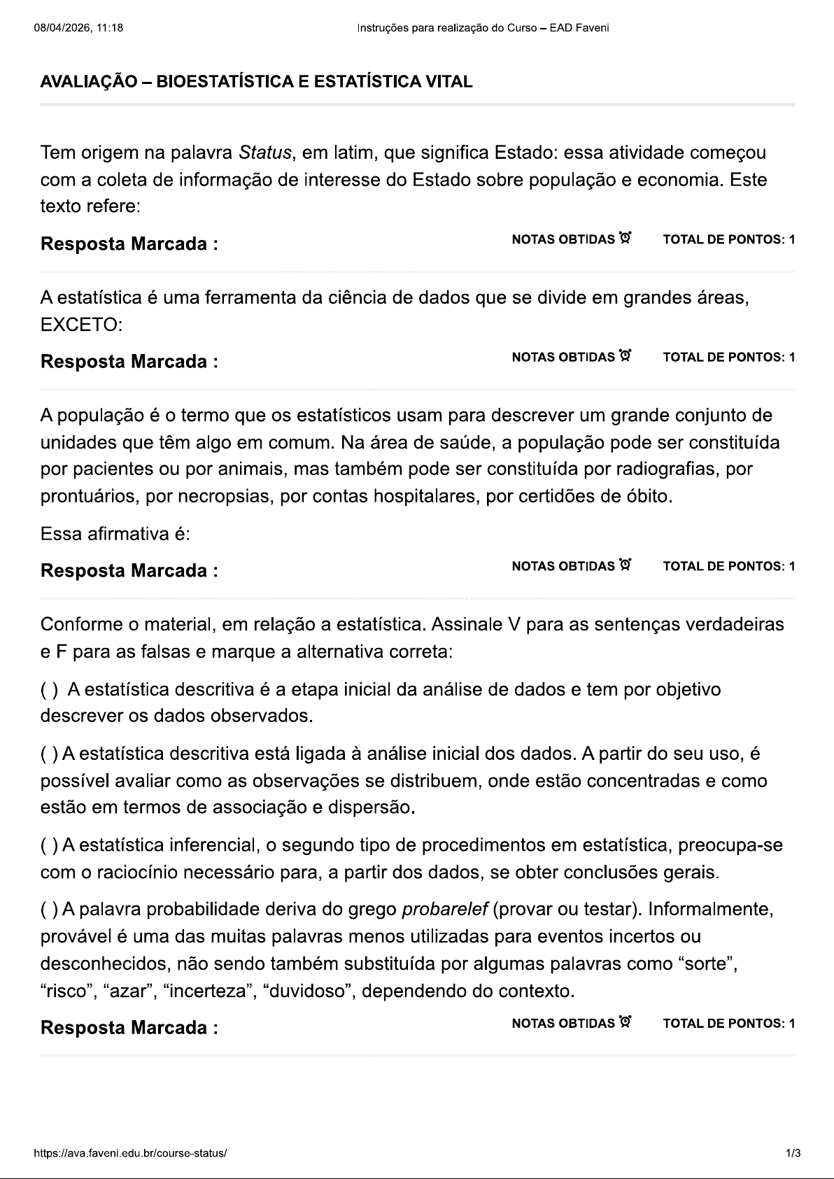 08/04/2026, 11:18 Instruções para realização do Curso EAD Faveni AVALIAÇÃO BIOESTATÍSTICA E ESTATÍSTICA VITAL Tem origem na palavra Status, em latim, que significa Estado: essa atividade começou com a coleta de informação de interesse do Estado sobre população e economia. Este texto refere: Resposta Marcada : NOTAS OBTIDAS TOTAL DE PONTOS: 1 A estatística é uma ferramenta da ciência de dados que se divide em grandes áreas, EXCETO: Resposta Marcada : NOTAS OBTIDAS TOTAL DE PONTOS: 1 A população é termo que os estatísticos usam para descrever um grande conjunto de unidades que têm algo em comum. Na área de saúde, a população pode ser constituída por pacientes ou por animais, mas também pode ser constituída por radiografias, por prontuários, por necropsias, por contas hospitalares, por certidões de óbito. Essa afirmativa é: Resposta Marcada : NOTAS OBTIDAS TOTAL DE PONTOS: 1 Conforme material, em relação a estatística. Assinale V para as sentenças verdadeiras e F para as falsas e marque a alternativa correta: A estatística descritiva é a etapa inicial da análise de dados e tem por objetivo descrever os dados observados. A estatística descritiva está ligada à análise inicial dos dados. A partir do seu uso, é possível avaliar como as observações se distribuem, onde estão concentradas e como estão em termos de associação e dispersão. A estatística inferencial, o segundo tipo de procedimentos em estatística, preocupa-se com raciocínio necessário para, a partir dos dados, se obter conclusões gerais. A palavra probabilidade deriva do grego probarelef (provar ou testar). Informalmente, provável é uma das muitas palavras menos utilizadas para eventos incertos ou desconhecidos, não sendo também substituída por algumas palavras como "sorte", "risco", "azar", "incerteza", "duvidoso", dependendo do contexto. Resposta Marcada : NOTAS OBTIDAS TOTAL DE PONTOS: 1 1/308/04/2026, 11:18 Instruções para realização do Curso EAD Faveni A se refere ao mais amplo de análise, como, por exemplo, todos entre 50 e 60 anos com diabetes do Resposta Marcada : NOTAS OBTIDAS TOTAL DE PONTOS: 1 A população pode ser finita ou infinita. Marque a alternativa correta sobre a população finita. Resposta Marcada : NOTAS OBTIDAS TOTAL DE PONTOS: 1 Os elementos que constituirão a amostra são escolhidos por sorteio. Enumere a segunda coluna de acordo com a primeira e marque a alternativa correta: 1 Amostra aleatória simples 2 Amostra aleatória estratificada 3 Amostra sistemática É constituída por n unidades retiradas da população segundo um sistema preestabelecido. É obtida por sorteio de uma população constituída por unidades homogêneas para a variável que irá ser estudada. É usada quando a população é constituída por unidades heterogêneas para a variável que se quer estudar. Resposta Marcada : NOTAS OBTIDAS TOTAL DE PONTOS: 1 É realizada no local da ocorrência. pesquisador faz uma visita ou envia um instrumento de consulta para obter a informação. Estamos referindo: Resposta Marcada : NOTAS OBTIDAS TOTAL DE PONTOS: 1 Em relação à coleta de dados, maque a altenativa incorreta: Resposta Marcada : NOTAS OBTIDAS TOTAL DE PONTOS: 1 Ela é um encontro entre duas pessoas em que uma delas obtém informações a respeito de determinado assunto por meio de uma conversação de natureza profissional. Esse texto refere: Resposta Marcada : NOTAS OBTIDAS TOTAL DE PONTOS: 1 Nota atribuída manualmente https://ava.faveni.edu.br/course-status/ 2/308/04/2026, 11:18 Instruções para realização do Curso - EAD Faveni Total 10 3/3