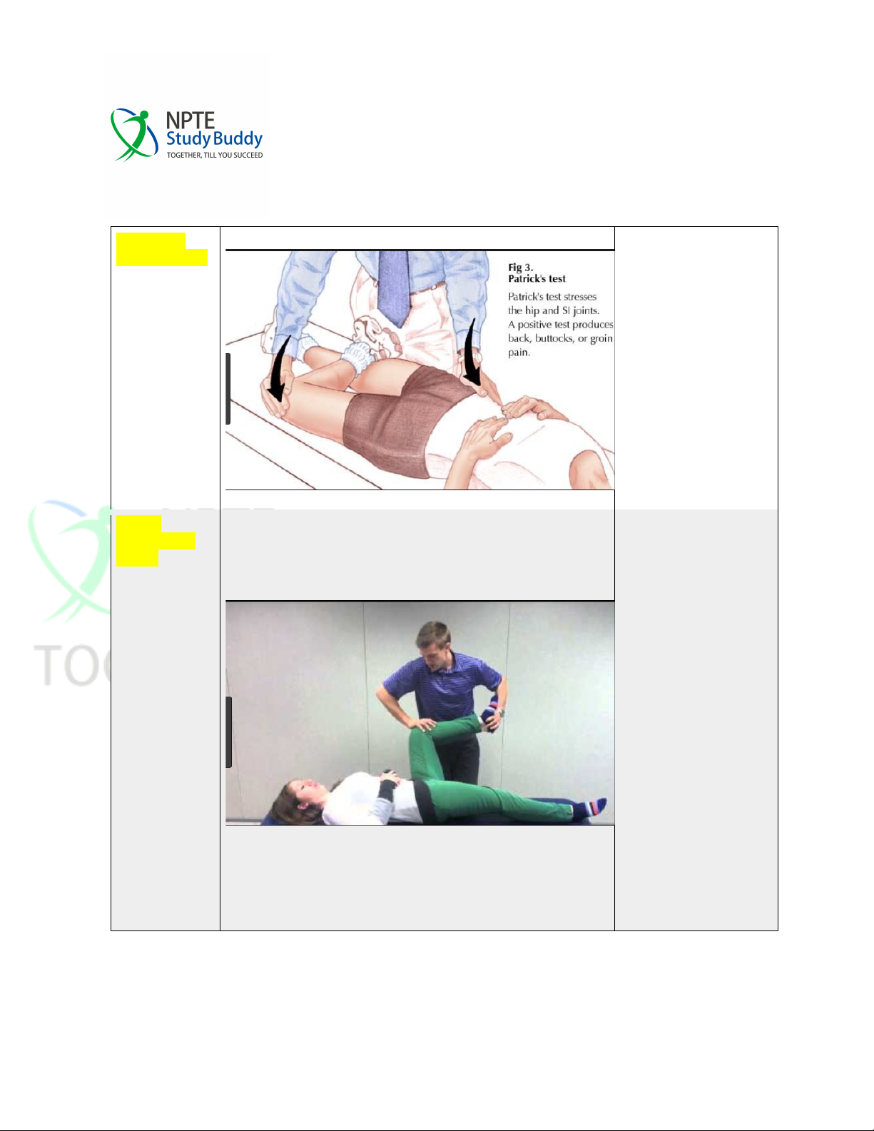 SPECIAL TESTS STUDYBUDDYMATERIAL VISIT US AT WWW.NPTESTUDYBUDDY.COM PATRICKS (FABER TEST) Supine - flex,abd and ER >>ankle rests in opp knee >>>>lower test leg down toward table surface Identifies dysfunction of hip such as mobility restriction Positive Involved knee unable to assume relax position Reproduction of painful symptoms GRIND (SCOURING TEST ) Identifies DJD of hip Supine —-hip 90 flexion ——knee max flex—-provide compressive load to femur via knee joint —-thereby loading the hip joint May reproduce pain within hip and refer pain to knee or elsewhere SPECIAL TESTS STUDYBUDDYMATERIAL VISIT US AT WWW.NPTESTUDYBUDDY.COM OBERS TEST Identifies tightness of ITB/TFL Side lying —- lower limb flexed at hip and knee—-passively extend and abduct hip with knee flexed to 90 degree Modified OBERS —-starts with legs extended and rest is same as above Positive if upper limb not able to go below horizontal SPECIAL TESTS STUDYBUDDYMATERIAL VISIT US AT WWW.NPTESTUDYBUDDY.COM ELY’S TEST Identifies tightness of rectus femurs Prone —- with knee flexed —-observe hip of testing limb Positive if hip of testing limb flexes SPECIAL TESTS STUDYBUDDYMATERIAL VISIT US AT WWW.NPTESTUDYBUDDY.COM 90 - 90 HAMSTRING TEST Identifies tightness of hamstring Supine with hip and knee in 90 flexion ——passively extend knee until barrier encountered Positive if knee lacks 10 degree extension SPECIAL TESTS STUDYBUDDYMATERIAL VISIT US AT WWW.NPTESTUDYBUDDY.COM PIRIFORMIS TEST Identifies piriformis syndrome Supine — foot of test leg placed passively lateral to the opp knee ——test hip is adducted ——observe position of testing knee relative to opposite knee Positive - testing kneee if unable to pass over the resting knee and / or reproduction of pain in the buttock, and / or along the sciatic nerve distribution LEG LENGTH TEST Identifies true LLD Supine - pelvis balanced aligned with trunk and LL Measure distance from ASIS to medial /lateral malleolus Diff in length identifies - true LLD This test determines whether the LLD is true/functional SPECIAL TESTS STUDYBUDDYMATERIAL VISIT US AT WWW.NPTESTUDYBUDDY.COM CRAIGS TEST Identifies abnormal femoral ante torsion angle Prone ——knee flexed to 90 deg palpate Greater trochanter —-slowly move hip through IR AND ER when GREATER TROCHANTER feels more lateral ,stop and measure the angle of leg relative to a line perpendicular to the table surface Finds anteverted /retroverted hip Normal angle - 8-15 hip IR 15 - ANTEVERTED HIP SPECIAL TESTS STUDYBUDDYMATERIAL VISIT US AT WWW.NPTESTUDYBUDDY.COM FADDIR/FADIR TEST Identifies 1.anterior superior impingement 2.iliopsoas tendinopathy 3.anterior labral tears supine >>>>>FADIR Reproduction of pain with or without click HIP IMPINGEMEN T PINCER CAM COMBINED SPECIAL TESTS STUDYBUDDYMATERIAL VISIT US AT WWW.NPTESTUDYBUDDY.COM KNEE SPECIAL TESTS COLLATERAL LIGAMENT INSTABILITY TEST For medial and lateral stability identifies ligament laxity or restriction Supine —-entire LL supported and stabilized and knee placed in 20 - 30 flexion. Valgus stress tests - medial collateral ligament Varus force - lateral collateral ligament Valgus at 30 with pain Valgus at 30 deg with laxity Primary finding is laxity but pain may be noted as well SPECIAL TESTS STUDYBUDDYMATERIAL VISIT US AT WWW.NPTESTUDYBUDDY.COM LACHMAN STRRES TEST Indicates integrity of ACL Supine —- test knee flexed 20-30 deg —— stabilize femur and passively glide tibia anterior Excessive anterior glide of tibia SPECIAL TESTS STUDYBUDDYMATERIAL VISIT US AT WWW.NPTESTUDYBUDDY.COM POSTERIOR SAG TEST Indicates integrity of PCL Supine —- hip flex to 45 degree and knee flex to 90 deg See whether tibia sags posteriorly in this position Positive - sag of tibia relative to femur SPECIAL TESTS STUDYBUDDYMATERIAL VISIT US AT WWW.NPTESTUDYBUDDY.COM POSTERIOR DRAWER TEST indicates integrity of PCL Same position as for sag test mentioned above Passively glide tibia posteriorly Positive - excess posterior glide SPECIAL TESTS STUDYBUDDYMATERIAL VISIT US AT WWW.NPTESTUDYBUDDY.COM REVERSE LACHMAN Indicates integrity of PCL PRONE with knees flexed to 30 deg Stabilise femur —- passively try to glide tibia posterior Positive - ligament laxity MC MURRAY TEST Identifies meniscal tears Supine —— teting knee in max flexion ——passively IR and extend the knee >>>>tests lateral meniscus Same procedure as above with external rotation test medial meniscus Positive - reproduction of click and / or pain in the knee joint SPECIAL TESTS STUDYBUDDYMATERIAL VISIT US AT WWW.NPTESTUDYBUDDY.COM APLEYS TEST Helps differentiate between meniscal tears and ligamentous lesions Prone >> testing knee flexed to 90 deg ——stabilise patients thigh to the table with your knee——passively distract the knee joint and then slowly rotate tibia internally and externally Next apply compressive load to the knee joint ——slowly rotate tibia internally and externally MENISCAL DYSFUNCTION - pain or decreased motion during compression LIGAMENTOUS DYSFUNCTION - pain or increased motion during distraction SPECIAL TESTS STUDYBUDDYMATERIAL VISIT US AT WWW.NPTESTUDYBUDDY.COM HUGHTONS PLICA TEST Identifies dysfunction of plica Supine and testing knee is flexed with tibia internally rotated Passively glide patella medially , while palpating medial femoral condyle Feel for popping as you passively flex and extend the knee Positive - pain or popping noted during the test PATELLAR APPREHENSI ON TEST Indicates past history of patellar dislocation Supine —-patella passively glided laterally Patient does not allow or does not like patella to move laterally to stimulate sublimation or dislocation SPECIAL TESTS STUDYBUDDYMATERIAL VISIT US AT WWW.NPTESTUDYBUDDY.COM CLARKES SIGN Patellar grinding test Indicates patellofemoral dislocation Supine —— knee extension resting on the table ——push posterior on superior pole of patella —ask patient to perform active contraction of quadriceps muscle 