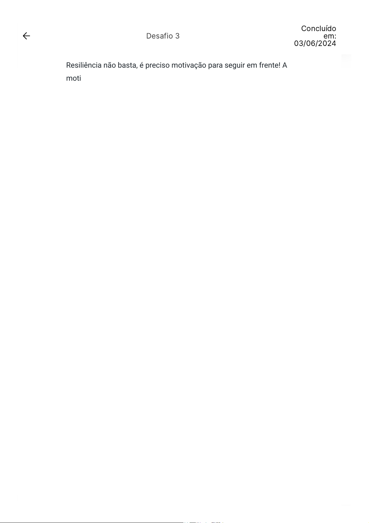 Letras - Língua Portuguesa - Licenciatur... M Olá MARIA ARAUJO Desafio 3 Concluído em: 03/06/2024 Resiliência não basta, é preciso motivação para seguir em frente! A motivação é a força que está por trás de nossas ações. Essa força tem origem em nossos desejos, nossas necessidades fundamentais, necessidades psicológicas e recompensas buscadas. Explicando melhor, nossos desejos representam anseios pessoais, nossas necessidades refletem elementos essenciais para o nosso bem-estar, e as recompensas são os incentivos que buscamos. Ainda que de forma não consciente, a relação entre todos esses aspectos influencia nossas escolhas e nosso comportamento. Mas sabemos que na vida concreta é muito difícil equilibrar todos os pratos que compõem a motivação. Por exemplo, às vezes conquistamos o emprego que nos oferece boa remuneração, garantindo necessidades fundamentais, mas não traz motivação relacionada às nossas necessidades psicológicas. Ou vivemos situação contrária: somos motivados psicologicamente em uma função, mas não recebemos a remuneração que garante a segurança financeira. Nem sempre podemos ter tudo o que queremos e precisamos! Por isso, entender como esses fatores exercem pressão em nossa vida é essencial para ter a motivação direcionada para o crescimento e a realização pessoal. Quando nos conhecemos, podemos fazer escolhas mais acertadas, com mais chances de sustentarmos no longo prazo e com mais qualidade de vida. É hora de entender a sua motivação! Ir para o mapa 04/06/2024, 00:23 Sala de Aula | Estacio https://estudante.estacio.br/formacao-socioemocional/6617c69d57ebcb8a029500c0/2/660ec36d585f6a9aa3253680?p1=1&p2=1&p3=1 1/1 https://stecine.azureedge.net/repositorio/00212hu/46863/pages/conectar/desafio03/mapa.html