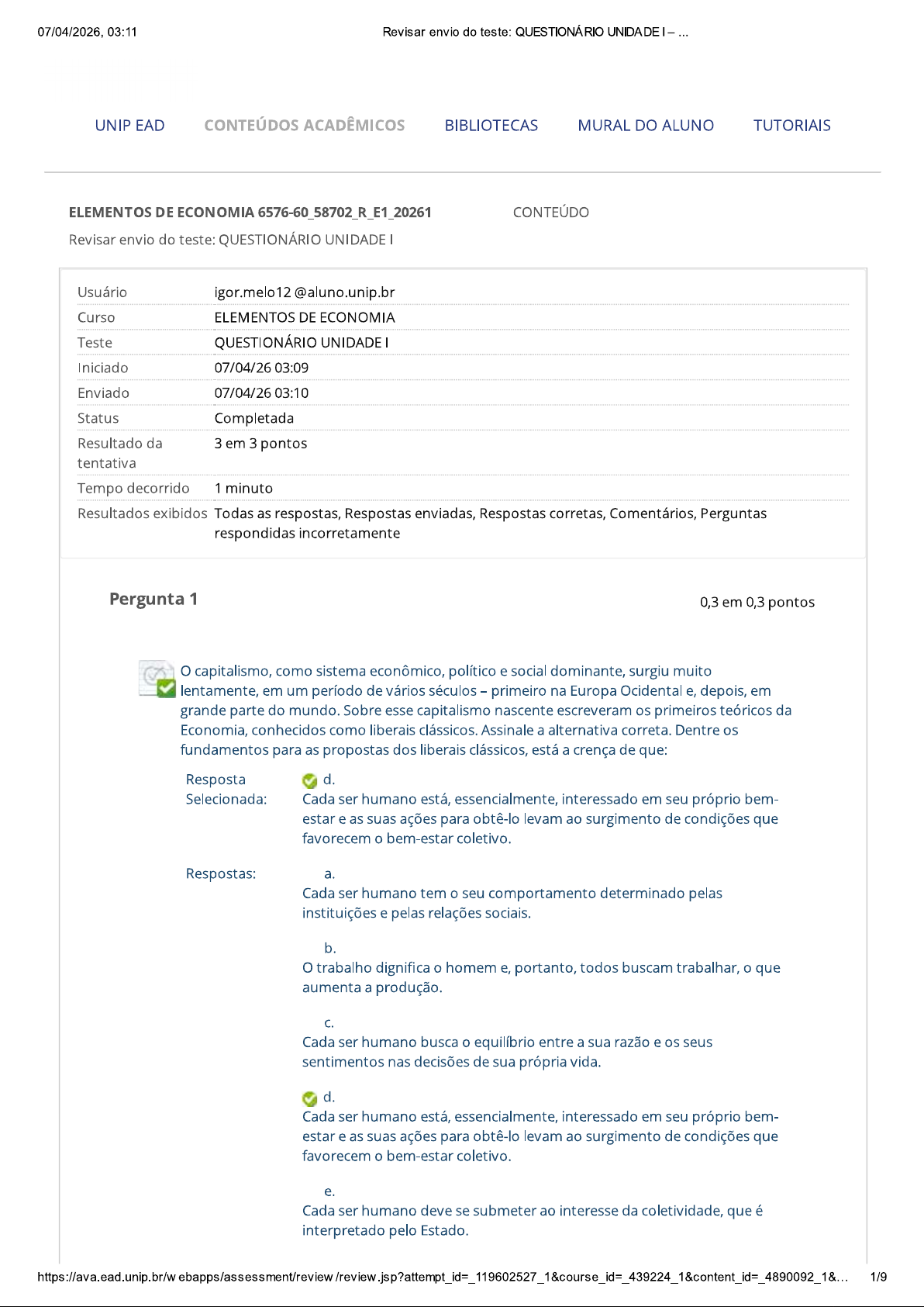 07/04/2026, 03:11 Revisar envio do teste: QUESTIONÁRIO UNIDADE UNIP EAD CONTEÚDOS ACADÊMICOS BIBLIOTECAS MURAL DO ALUNO TUTORIAIS ELEMENTOS DE ECONOMIA CONTEÚDO Revisar envio do teste: QUESTIONÁRIO UNIDADE Usuário igor.melo12@aluno.unip.br Curso ELEMENTOS DE ECONOMIA Teste QUESTIONÁRIO UNIDADE Iniciado 07/04/26 03:09 Enviado 07/04/26 03:10 Status Completada Resultado da 3 em 3 pontos tentativa Tempo decorrido 1 minuto Resultados exibidos Todas as respostas, Respostas enviadas, Respostas corretas, Comentários, Perguntas respondidas incorretamente Pergunta 1 0,3 em 0,3 pontos capitalismo, como sistema econômico, político e social dominante, surgiu muito lentamente, em um período de vários séculos primeiro na Europa Ocidental e, depois, em grande parte do mundo. Sobre esse capitalismo nascente escreveram os primeiros teóricos da Economia, conhecidos como liberais clássicos. Assinale a alternativa correta. Dentre os fundamentos para as propostas dos liberais clássicos, está a crença de que: Resposta d. Selecionada: Cada ser humano está, essencialmente, interessado em seu próprio bem- estar e as suas ações para obtê-lo levam ao surgimento de condições que favorecem bem-estar coletivo. Respostas: a. Cada ser humano tem seu comportamento determinado pelas instituições e pelas relações sociais. b. trabalho dignifica homem e, portanto, todos buscam trabalhar, que aumenta a produção. C. Cada ser humano busca equilíbrio entre a sua razão e os seus sentimentos nas decisões de sua própria vida. d. Cada ser humano está, essencialmente, interessado em seu próprio bem- estar e as suas ações para obtê-lo levam ao surgimento de condições que favorecem bem-estar coletivo. e. Cada ser humano deve se submeter ao interesse da coletividade, que é interpretado pelo Estado. 1/907/04/2026, 03:11 Revisar envio do teste: QUESTIONÁRIO UNIDADE Comentário Alternativa: D da resposta: Comentário: a alternativa "d" é a que corresponde ao enunciado. autointeresse, egoísmo que move homem para as trocas, faz com, que cada indivíduo, de forma isolada, busque melhor para si e, assim, melhor para a coletividade será uma decorrência. Isto faz parte dos fundamentos da escola clássica, notadamente de Adam Smith. Pergunta 2 0,3 em 0,3 pontos Leia atentamente ao trecho proposto: "O conceito de necessidade humana é concreto, neutro e subjetivo; porém, para não se omitir da questão, definir-se-á a 'necessidade humana' como qualquer manifestação de desejo que envolva a escolha de um bem econômico capaz de contribuir para a sobrevivência ou para a realização social do indivíduo. Assim sendo, ao economista interessa a existência das necessidades humanas a serem satisfeitas com bens econômicos, e não a validade filosófica das necessidades. [...] fato concreto é que, no mundo de hoje, todos desejam e pensam que necessitam de geladeiras, esgotos, carros, televisão, rádios, educação, cinemas, livros, roupas, cigarros, relógios. As ilimitadas necessidades já se expandem para fora da esfera biológica da sobrevivência". (SILVA, C.R.L. da; LUIZ, S. Economia e mercados: introdução à economia. ed. São Paulo: Saraiva, 2010, p. 6-7). A partir da leitura do trecho proposto, é possível: I. Perceber que se trata de uma das primeiras investigações da Ciência Econômica, ou seja, da questão relacionada ao atendimento às necessidades humanas; II. Dizer que as necessidades humanas são ilimitadas, surgindo, então, problema econômico fundamental; III. Entender que as necessidades humanas renovam-se com tempo em função da criação de novos desejos. Considerado isso, é possível afirmar que: Resposta Selecionada: Estão corretas al, a e a III. e. Respostas: a. Apenas a está correta. b. Apenas a está correta. Estão corretas apenas a e a II. d. Estão corretas apenas a e a III. Estão corretas al, a e a III. e. Comentário Alternativa: E da resposta: Comentário: uma das primeiras investigações da Ciência Econômica reside no fato de que as sociedades necessitam satisfazer as suas necessidades humanas, não só com uso de bens livres, mas também com uso de bens econômicos, que corrobora com a afirmativa I.A afirmativa também está correta, pois atendimento às necessidades humanas envolve ilimitadas necessidades, que configura problema econômico fundamental. A afirmativa III também está correta, pois consumo humano não é apenas por necessidade, mas também por desejo e, portanto, são renováveis ao longo do tempo. 2/907/04/2026, 03:11 Revisar envio do teste: QUESTIONÁRIO UNIDADE Pergunta 3 0,3 em 0,3 pontos Observe a seguinte definição de bens econômicos e bens livres: "Tudo aquilo que tem utilidade, com ou sem valor econômico. ar, por exemplo, é um bem livre, mas minério de ferro é um bem econômico, porque é escasso e depende do trabalho humano para ser obtido. Os bens econômicos se dividem em cinco grupos principais. São eles: bens de capital ou de produção (máquinas e equipamentos); bens de consumo (brinquedos, um par de sapatos aqueles que podem ser comprados pelas pessoas depois de um processo de produção ou industrialização); bens de consumo durável (máquina de lavar roupa, imóvel que só são trocados após períodos longos de uso); bens de consumo semidurável (carro, roupa os que precisam ser trocados periodicamente); bens de consumo não durável (alimentos)". Disponível em: Acesso em: 23 jan. 2019. Consideremos, agora, que as necessidades humanas fundamentais são muito maiores do que somente as biológicas, como dormir, respirar etc. Nesse sentido, podemos admitir que as necessidades humanas fundamentais: I. Dependem, por completo, da produção de bens econômicos pela respectiva sociedade; II. Nunca demandam bens econômicos para a sua satisfação; III. Podem ser, muitas vezes, resolvidas com a própria disponibilidade de bens livres na natureza. Com base nessas opções, podemos considerar que: Resposta Selecionada