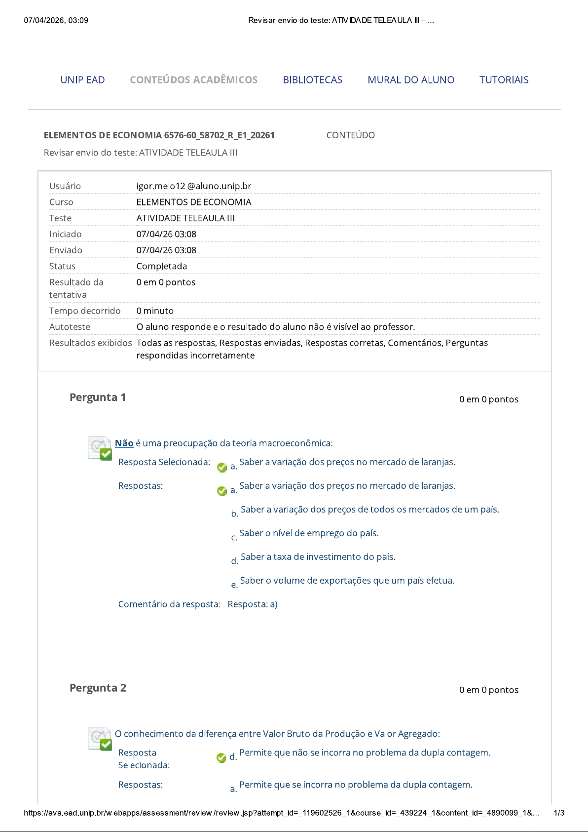 07/04/2026, 03:09 Revisar envio do teste: ATIVIDADE TELEAULA III UNIP EAD CONTEÚDOS ACADÊMICOS BIBLIOTECAS MURAL DO ALUNO TUTORIAIS ELEMENTOS DE ECONOMIA CONTEÚDO Revisar envio do teste: ATIVIDADE TELEAULA III Usuário igor.melo12 @aluno.unip.br Curso ELEMENTOS DE ECONOMIA Teste ATIVIDADE TELEAULA III Iniciado 07/04/26 03:08 Enviado 07/04/26 03:08 Status Completada Resultado da 0 em 0 pontos tentativa Tempo decorrido 0 minuto Autoteste aluno responde e resultado do aluno não é visível ao professor. Resultados exibidos Todas as respostas, Respostas enviadas, Respostas corretas, Comentários, Perguntas respondidas incorretamente Pergunta 1 0 em 0 pontos Não é uma preocupação da teoria macroeconômica: Resposta Selecionada: Saber a variação dos preços no mercado de laranjas. a. Respostas: Saber a variação dos preços no mercado de laranjas. a. b. Saber a variação dos preços de todos os mercados de um país. Saber nível de emprego do país. d. Saber a taxa de investimento do país. Saber volume de exportações que um país efetua. e. Comentário da resposta: Resposta: a) Pergunta 2 0 em 0 pontos conhecimento da diferença entre Valor Bruto da Produção e Valor Agregado: Resposta d. Permite que não se incorra no problema da dupla contagem. Selecionada: Respostas: Permite que se incorra no problema da dupla contagem. a. 1/307/04/2026, 03:09 Revisar envio do teste: ATIVIDADE TELEAULA III b. Permite conhecer produto nacional pelo método da renda. Permite conhecer produto nacional pelo método do dispêndio. d. Permite que não se incorra no problema da dupla contagem. e. Permite observar que PIB é igual ao PNB. Comentário da resposta: Resposta: d) Pergunta 3 0 em 0 pontos Não é um instrumento de política monetária: Resposta Selecionada: Imposto inflacionário. a. Respostas: Imposto inflacionário. a. b. Recolhimento compulsório. Administração da taxa de juros. d. Mercado aberto. Selecionar crédito. e. Comentário da resposta: Resposta: a) Pergunta 4 0 em 0 pontos Ocorrerá inflação em um país quando: governo aumentar seus gastos. II. Banco Central diminuir a taxa de recolhimento compulsório. III. A taxa de câmbio for administrada de forma a incentivar exportações. IV. Houver escassez de um fator de produção. Está correto apenas que se afirma em: 2/307/04/2026, 03:09 Revisar envio do teste: ATIVIDADE TELEAULA III Resposta Selecionada: d. I, II, III e IV. Respostas: a. le II. b. e III. C. e III. d. I, II, III e IV. e. IV. Comentário da resposta: Resposta: d) Terça-feira, 7 de Abril de 2026 03h08min57s GMT-03:00 OK 3/3