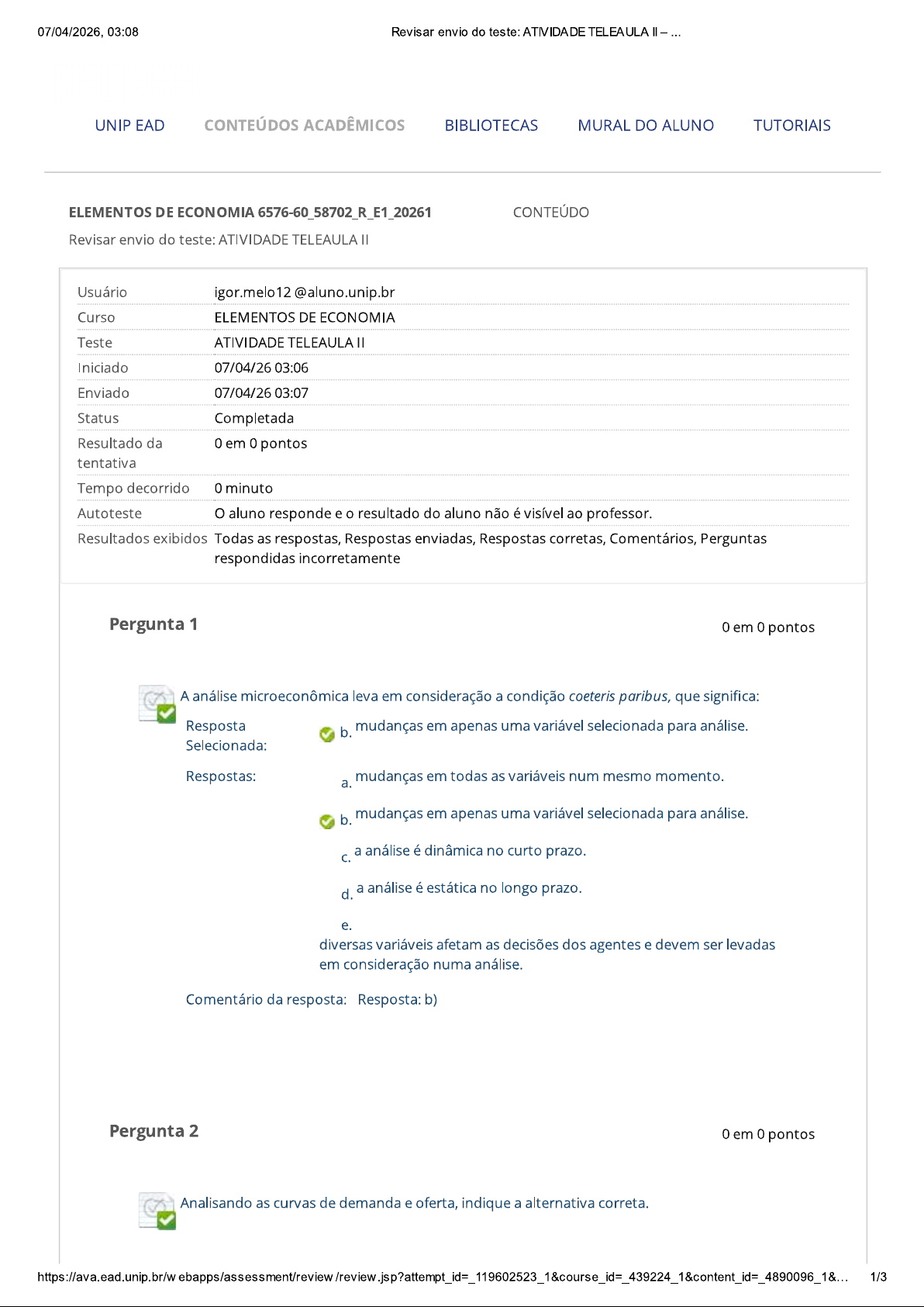 07/04/2026, 03:08 Revisar envio do teste: ATIVIDADE TELEAULA UNIP EAD CONTEÚDOS ACADÊMICOS BIBLIOTECAS MURAL DO ALUNO TUTORIAIS ELEMENTOS DE ECONOMIA CONTEÚDO Revisar envio do teste: ATIVIDADE TELEAULA Usuário igor.melo12@aluno.unip.br Curso ELEMENTOS DE ECONOMIA Teste ATIVIDADE TELEAULA Iniciado 07/04/26 03:06 Enviado 07/04/26 03:07 Status Completada Resultado da 0 em 0 pontos tentativa Tempo decorrido 0 minuto Autoteste aluno responde e resultado do aluno não é visível ao professor. Resultados exibidos Todas as respostas, Respostas enviadas, Respostas corretas, Comentários, Perguntas respondidas incorretamente Pergunta 1 0 em 0 pontos A análise microeconômica leva em consideração a condição coeteris paribus, que significa: Resposta b. mudanças em apenas uma variável selecionada para análise. Selecionada: Respostas: mudanças em todas as variáveis num mesmo momento. a. b. mudanças em apenas uma variável selecionada para análise. a análise é dinâmica no curto prazo. d. a análise é estática no longo prazo. e. diversas variáveis afetam as decisões dos agentes e devem ser levadas em consideração numa análise. Comentário da resposta: Resposta: b) Pergunta 2 0 em 0 pontos Analisando as curvas de demanda e oferta, indique a alternativa correta. 1/307/04/2026, 03:08 Revisar envio do teste: ATIVIDADE TELEAULA Resposta a. Selecionada: A curva de demanda mostra uma relação inversa entre preços e quantidades. Respostas: a. A curva de demanda mostra uma relação inversa entre preços e quantidades. b. A curva de demanda mostra uma relação direta entre preços e quantidades. Qualquer ponto acima do equilíbrio de mercado, teremos escassez de mercadorias. d. Qualquer ponto abaixo do equilíbrio de mercado, teremos excesso de produção. e. A curva de oferta refere-se às quantidades efetivamente vendidas por uma empresa e não sua intenção de venda. Comentário da resposta: Resposta: a) Pergunta 3 0 em 0 pontos Pela teoria da firma, agente tipo empresa é maximizador de resultados quando: Resposta consegue aumentar a distância entre receitas e despesas. a. Selecionada: Respostas: consegue aumentar a distância entre receitas e despesas. a. b. diminui suas despesas. C. sempre adquire bens de produção ao custo mais baixo. d. aumenta a receita de vendas independentemente dos custos de produção. e. preço de venda é maior do que custo de produção. Comentário da resposta: Resposta: a) Pergunta 4 0 em 0 pontos Postos de combustível onde consumidor abastece seu automóvel são classificados como mercado de: 2/307/04/2026, 03:08 Revisar envio do teste: ATIVIDADE TELEAULA Resposta Selecionada: d. concorrência monopolística. Respostas: a. concorrência perfeita. b. monopólio. oligopólio. d. concorrência monopolística. e. tanto oligopólio quanto monopólio. Comentário da resposta: Resposta: d) Terça-feira, 7 de Abril de 2026 03h07min44s GMT-03:00 OK 3/3