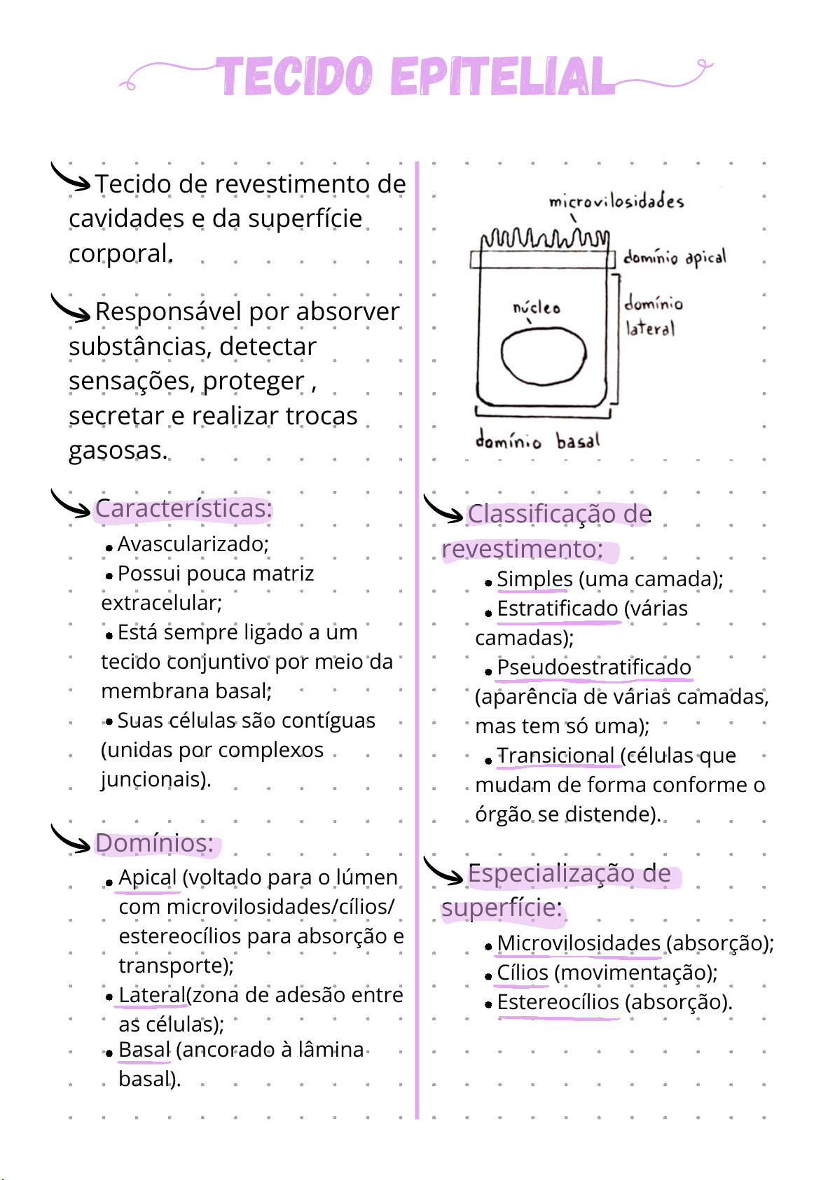 Avascularizado; Possui pouca matriz extracelular; Está sempre ligado a um tecido conjuntivo por meio da membrana basal; Suas células são contíguas (unidas por complexos juncionais). Responsável por absorver substâncias, detectar sensações, proteger , secretar e realizar trocas gasosas. Características: Domínios: Apical (voltado para o lúmen com microvilosidades/cílios/ estereocílios para absorção e transporte); Lateral(zona de adesão entre as células); Basal (ancorado à lâmina basal). Classificação de revestimento: Simples (uma camada); Estratificado (várias camadas); Pseudoestratificado (aparência de várias camadas, mas tem só uma); Transicional (células que mudam de forma conforme o órgão se distende). Especialização de superfície: Microvilosidades (absorção); Cílios (movimentação); Estereocílios (absorção). Tecido Epitelial Tecido de revestimento de cavidades e da superfície corporal. Oclusão (selam o espaço intercelular, impedindo a passagem de substâncias); Adesão (une as células, conferindo adesão e resistência mecânica); Comunicante (canais que permitem passagem direta de íons e pequemas moléculas entre células). Junções celulares: Epitélio glandular: As glândulas surgem pela proliferação do epitélio; Glândula endócrina (perde contato com o epitélio, produzindo e secretando hormônios na corrente sanguínea, sem utilizar ductos); Glândula exócrina (não perde contato com o epitélio, produzindo e secretando substâncias para fora do corpo ou em cavidades internas através de ductos); Glândula mista (libera substâncias tanto por ductos quanto diretamente na corrente sanguínea). Tipos celulares: Cúbico (formato cúbico e núcleo esférico central); Cilíndrico (formato alongado com núcleo geralmente elíptico próximo à base); Pavimentoso (formato achatado e delgado com núcleo alongado). Tecido Epitelial Tecido Epitelial Tecido de revestimento de cavidades e da superfície corporal. Responsável por absorver substâncias, detectar sensações, proteger , secretar e realizar trocas gasosas. Características: Domínios: Especialização de superfície: Classificação de revestimento: Tecido Epitelial Tipos celulares: Junções celulares: Epitélio glandular: