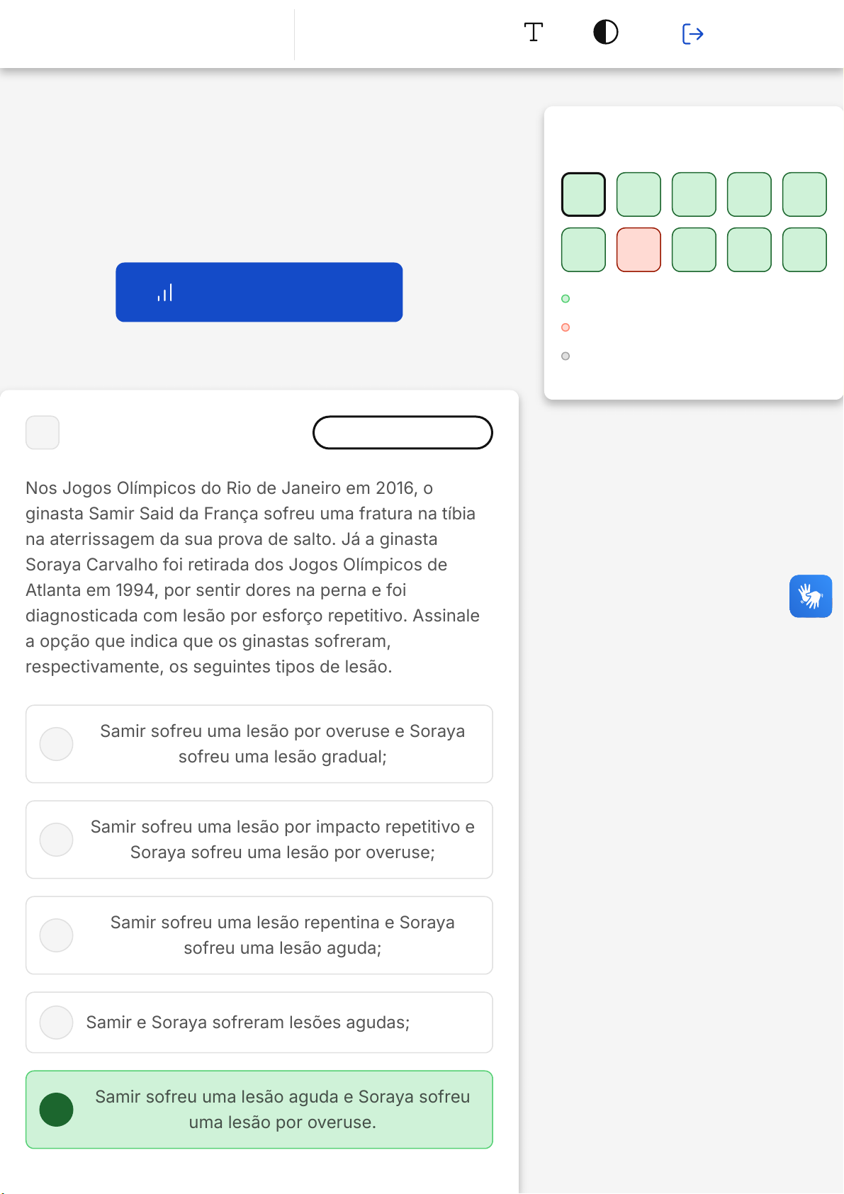 Você acertou 9 de 10 questões Verifique o seu desempenho e continue treinando! Você pode refazer o exercício quantas vezes quiser. Verificar Desempenho A B C D E 1 Marcar para revisão Nos Jogos Olímpicos do Rio de Janeiro em 2016, o ginasta Samir Said da França sofreu uma fratura na tíbia na aterrissagem da sua prova de salto. Já a ginasta Soraya Carvalho foi retirada dos Jogos Olímpicos de Atlanta em 1994, por sentir dores na perna e foi diagnosticada com lesão por esforço repetitivo. Assinale a opção que indica que os ginastas sofreram, respectivamente, os seguintes tipos de lesão. Samir sofreu uma lesão por overuse e Soraya sofreu uma lesão gradual; Samir sofreu uma lesão por impacto repetitivo e Soraya sofreu uma lesão por overuse; Samir sofreu uma lesão repentina e Soraya sofreu uma lesão aguda; Samir e Soraya sofreram lesões agudas; Samir sofreu uma lesão aguda e Soraya sofreu uma lesão por overuse. Questão 1 de 10 Corretas (9) Incorretas (1) Em branco (0) 1 2 3 4 5 6 7 8 9 10 Lista de exercícios Segurança Na… Sair Resposta correta Parabéns, você selecionou a alternativa correta. Confira o gabarito comentado! Gabarito Comentado As lesões sofridas pelos ginastas Samir Said e Soraya Carvalho são exemplos de lesões agudas e por overuse, respectivamente. A lesão aguda, também conhecida como lesão repentina, ocorre devido a um evento único e inesperado, como foi o caso de Samir, que fraturou a tíbia durante a aterrissagem de sua prova de salto. Por outro lado, a lesão por overuse, também chamada de lesão gradual, é causada por esforço repetitivo e ocorre de forma gradativa, como aconteceu com Soraya, que sentiu dores na perna devido ao esforço repetitivo e foi diagnosticada com essa lesão. 2 Marcar para revisão Seguir uma progressão pedagógica adequada ao nível dos alunos é essencial no ensino e aprendizagem dos conteúdos da Ginástica Artística no que diz respeito à segurança. Um dos fundamentos básicos da Ginástica Artística é a parada de mãos. Para ensinar este fundamento aos seus alunos, um professor utilizou o método progressivo durante três aulas e obteve os seguintes resultados: I- O aluno A executou o fundamento parada de mãos completo na primeira aula com boa execução; II- O aluno B executou algumas progressões pedagógicas, mas não conseguiu chegar até a parada de mãos ao final das três aulas; III- O aluno C executou a parada de mãos no terceiro dia de aula, porém sua execução tinha muitos erros. Analisando os resultados obtidos pelo professor, marque a alternativa correta. A B C D E O aluno A e o aluno C possuíam os pré- requisitos técnicos e físicos para realizar a parada de mãos, mas o aluno C pode ter evoluído muito rapidamente; O aluno B nunca vai executar uma parada de mãos, porque em comparação com o aluno A seu resultado em três aulas foi bem inferior; O aluno A deixou de executar etapas anteriores importantes e não respeitou o método progressivo, enquanto o aluno B tinha o mesmo potencial que o aluno A mas respeitou a progressão pedagógica; O aluno C deveria voltar a praticar as etapas anteriores para fixá-las melhor, enquanto o aluno B deveria ter evoluído mais rapidamente; O método progressivo foi respeitado com os três alunos; Resposta correta Parabéns, você selecionou a alternativa correta. Confira o gabarito comentado! Gabarito Comentado A alternativa correta é a A. O aluno A conseguiu executar a parada de mãos na primeira aula, o que indica que ele possuía os pré-requisitos técnicos e físicos necessários para realizar o movimento. Por outro lado, o aluno C, apesar de ter conseguido executar a parada de mãos no terceiro dia de aula, apresentou muitos erros em sua execução. Isso sugere que ele pode ter avançado muito rapidamente nas etapas da progressão pedagógica, sem ter dominado completamente cada uma delas. Isso reforça a importância de seguir uma progressão pedagógica adequada ao nível dos alunos, garantindo que eles dominem cada etapa antes de A B C avançar para a próxima, a fim de garantir a segurança e a eficácia do aprendizado. 3 Marcar para revisão É natural que o aluno que vai tentar executar um fundamento da Ginástica Artística (GA) pela primeira vez, se preocupe com o risco de acidentes e lesões. Para minimizar esse risco, além de preparar o aluno física, técnica e mentalmente para esse momento, o professor pode lançar mão da ajuda, que é uma estratégia muito utilizada na GA. Com relação ao recurso da ajuda, assinale a opção correta. A ajuda consiste na manipulação do aluno durante o exercício, e o professor deve seguir à risca as formas de ajuda para evitar lesões. Essa ajuda deve sempre ser fornecida em duplas, mesmo para os professores mais experientes, pois os alunos têm diferentes corpos (peso, altura etc.). A ajuda pode ser utilizada para crianças, mas deve ser evitada com atletas mais experientes para não causar dependência do auxílio físico nem psicológico. O professor deve ajudar somente nos exercícios mais difíceis. O professor deve treinar a sua habilidade de fornecer ajuda, e fazê-lo somente se necessário. Para aumentar sua autoconfiança em dar o auxílio manual ele pode iniciar em duplas e depois auxiliar sozinho. D E O condicionamento físico do professor para fornecer ajuda não é importante, se ele já tiver experiência suficiente para se proteger de um possível acidente. O professor deve fornecer ajuda mesmo que os exercícios já estejam dominados como forma de prevenção. Deve posicionar-se sempre ao lado dos alunos para execução de qualquer fundamento. Resposta correta Parabéns, você selecionou a alternativa correta. Confira o gabarito comentado! Gabarito Comentado A habilidade de fornecer ajuda é algo que o professor deve treinar e utilizar apenas quando necessário. Isso evita a dependência do aluno e aumenta a autoconfiança dele para realizar o exercício. No caso de prof