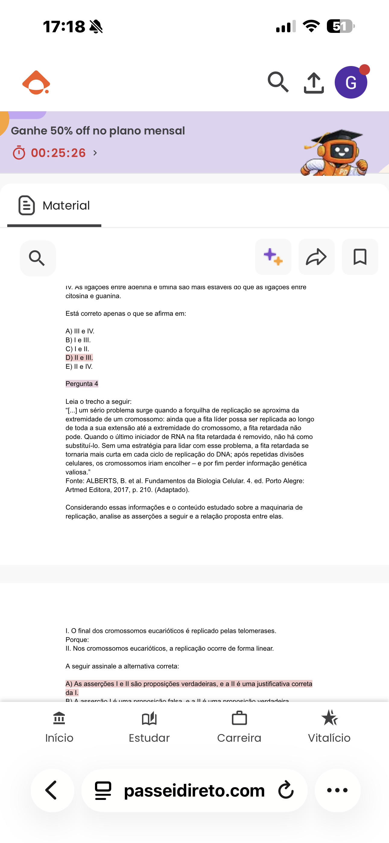 17:18 5 G Ganhe 50% off no plano mensal 00:25:26 > Material IV. AS entre agenina e timina sao mais estaveis ao que as entre citosina e guanina. Está correto apenas que se afirma em: A) III IV. B) III. C) II. D) III. E) IV. Pergunta 4 Leia trecho a seguir: "[...] um sério problema surge quando a forquilha de replicação se aproxima da extremidade de um cromossomo: ainda que a fita líder possa ser replicada ao longo de toda a sua extensão até a extremidade do cromossomo, a fita retardada não pode. Quando último iniciador de RNA na fita retardada é removido, não há como substituí-lo. Sem uma estratégia para lidar com esse problema, a fita retardada se tornaria mais curta em cada ciclo de replicação do DNA; após repetidas divisões celulares, cromossomos iriam encolher e por fim perder informação genética valiosa." Fonte: ALBERTS, B. et al. Fundamentos da Biologia Celular. 4. ed. Porto Alegre: Artmed Editora, 2017, 210. (Adaptado). Considerando essas informações e conteúdo estudado sobre a maquinaria de replicação, analise as asserções a seguir e a relação proposta entre I. o final dos cromossomos eucarióticos é replicado pelas telomerases. Porque: II. Nos cromossomos eucarióticos, a replicação ocorre de forma linear. A seguir assinale a alternativa correta: A) As asserções e II são proposições verdadeiras, e a II é uma justificativa correta da e a II é Início Estudar Carreira Vitalício passeidireto.com