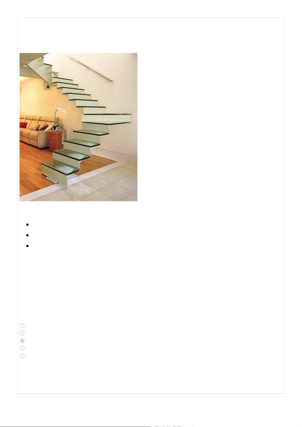 A escada apresentada abaixo, projeto da arquiteta Fernanda Machado, possui estrutura de ferro parafusada nas extremidades e degraus de vidro laminado de 8 mm. Considere as dimensões abaixo. Pé direito= 2,70 m. Espessura da laje= 0,10 m. Largura do degrau= 0,30 m (piso). O número de degraus e a altura do espelho são Alternativas: A: 15 degraus; altura do espelho= 0,16 m B: 15 degraus; altura do espelho= 0,20 m C: 16 degraus; altura do espelho= 0,175 m D: 16 degraus; altura do espelho= 0,19 m E: 18 degraus; altura do espelho= 0,175m Resposta do aluno: C Justificativa(s) do aluno: 01/04/2026, 11:54 UNIP - Universidade Paulista : DisciplinaOnline - Sistemas de conteúdo online para Alunos. https://online.unip.br/Imprimir/ImprimirExercicio 1/2 01/04/2026, 11:54 UNIP - Universidade Paulista : DisciplinaOnline - Sistemas de conteúdo online para Alunos. https://online.unip.br/Imprimir/ImprimirExercicio 2/2