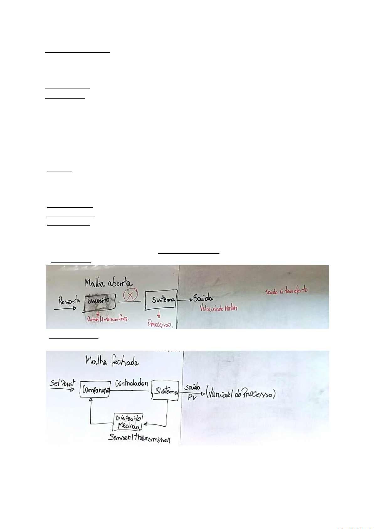 Processos industriais O processo industrial é o conjunto organizado de operações realizadas dentro de uma fábrica com o objetivo de transformar matérias primas. Todo processo industrial possui duas condições fundamentais . Estado inicial - é a condição do sistema antes que ocorre qualquer transformação. . Estado final - é a condição obtida após reaizaçao das operações do processo. Os processos industriais precisam ser controlados e monitorados porque pequenas variações podem gerar. . Desperdício de matéria prima. . Perda da qualidade. . Risco de acidentes. . Aumento de gastos. Por isso surge a necessidade de sistemas de controle e automação. Sistema - segundo o IEEE, “ uma combinação de componentes que atuam em conjunto para executar uma função. Esse sistema possui elementos interligados que trabalham para atingir um objetivo comum. Todo sistema geralmente apresenta: Entrada (Input) - informações ou materiais que entram no sistema. Processamento - etapa que ocorre transformação. Saída (Output) - resultado final produzido pelo sistema. Um processo industrial é considerado um subsistema, pois faz parte de um sistema produtivo maior. Malhas de Controle: . Malha aberta - sistema não verifica se o resultado final foi realmente alcançado. . Malha Fechada. - sistema mede a saída, compara com a entrada desejada e corrige o erro automaticamente para manter estabilidade. Sistema de Controle. Um Sistema de Controle é definido como um conjunto de componentes que atuam para manter uma variável dentro de um valor desejado, compensando perturbações externas. Para que isso ocorra, cinco elementos fundamentais trabalham em um ciclo fechado (Malha Fechada). 1. Variável de Processo (PV) ou de Controle É a grandeza física que se deseja monitorar e manter estável. Na instrumentação industrial, as mais comuns são: * Temperatura (medida em °C). * Pressão (medida em bar, PSI ou Pa). * Vazão (fluxo de líquidos ou gases). * Nível (quantidade de material em reservatórios). 2. Setpoint (SP) / Valor de Referência É o valor ideal ou desejado para a variável de controle, definido pelo operador ou pelo sistema de gestão. * Exemplo: Em uma turbina a vapor, o Setpoint pode ser uma temperatura constante de 360°C para garantir a eficiência energética. 3. Sensor (Elemento de Medição) É o dispositivo que "sente" o estado atual da variável e a converte em um sinal (geralmente elétrico). * Transdutores: Convertem a grandeza física em sinal. * Transmissores: Envia esse sinal para o controlador, muitas vezes padronizado em 4-20 mA. * Exemplos: Termopares, PT100 (temperatura), sensores ultrassônicos (nível). 4. Controlador (O Cérebro) Sua função é puramente lógica e matemática. Ele recebe o sinal do sensor, compara-o com o Setpoint e calcula o Erro (Erro = SP - PV). * Ação: Com base no erro, ele decide qual comando enviar ao atuador para corrigir o processo. * Hardware: O dispositivo mais utilizado na indústria é o CLP (Controlador Lógico Programável). 5. Atuador (O Músculo) É o elemento que recebe o sinal do controlador e executa a ação física necessária para alterar o processo e eliminar o erro. * Exemplos: Motores, bombas, resistências elétricas. * Elemento Final de Controle: Frequentemente é uma Válvula de Controle ou uma Solenoide que abre ou fecha para regular a entrada de matéria-prima ou energia. Dinâmica e Estrutura de Controle. Os processos indústrias são na maioria dinâmicos onde as variáveis mudam constantemente, por isso os sistemas de controle precisam reagir rapidamente as mudanças para manter o processo estável. Enquanto os sistemas estáticos possuem saídas que dependem apenas das entradas atuas, os sistemas dinâmicos possuem “memória” ou comportamento variável no tempo/eventos, sendo o foco da automação industrial. # Sistemas quanto á Medição. Sistemas Contínuos: Variáveis medidas permanentemente ao longo do tempo. Sistemas Amostrados: Variáveis medidas em intervalo de tempos específicos (comum em sistemas digitais). . Sinal Analógico vs Digital O sinal Analógico é a representação direta da grandeza, mas sofre com ruídos e degradação. O sinal digital, embora sofra com a quantizaçao (precisão limitada pelo número de bits) oferece imunidade a ruídos e uma capacidade de processamento e armazenamento infinitamente superior. # Sistemas quanto á Controle O controle é a aplicações de ações pré-planejadas para que o objeto atinga objetivos específicos. . Sistema de Variáveis Contínuas - SVC: Controlam Grandezas Físicas. O foco é manter uma variável física cravada em um valor de referência. . Sistema de Eventos Discretos - SED: Controlam Sequência de Operações. Buscam garantir que etapa ocorram na ordem corretas. O controle de processo em SED iniciou-se com a utilização dos relés . contatores e temporizados constituem a base dos projetos de controles de processos de manufatura. Comando: botoeiras , chaves Atuação : válvulas, solenoides, contadores Destacar: potenciômetros, taco membros Monitoração: lâmpadas, buzinas Realização: circuitos elétricos. CLP. Automação Industrial A automação industrial é a área da engenharia que estuda e aplica tecnologias capazes de substituir ou reduzir a intervenção humana em processos produtivos. A automação permite que máquinas executem tarefas de forma automática seguindo regras previamente programadas. Além disso ela possibilita coleta de dados precisa, o que permite melhorar continuamente o processo produtivo . A automacao surgiu principalmente devido a necessidade de aumentar eficiência e competitividade industrial . Arquitetura da automação. A arquitetura industrial é organizada em camadas estruturais que integram desde o chão de fábrica até a gestão. . Nível de campo é onde estão os dispositivos diretamente conectados ao processo. Sensores/ válvulas/ motores/ atuadores Esses dispositivos interagem d