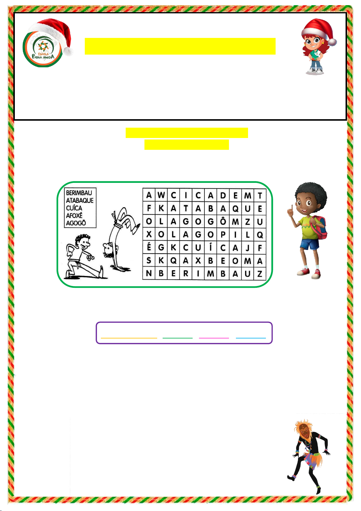 1 PROVA DA 4ª UNIDADE 1° ANO DISCIPLINA DE ARTE (1°) Encontre no caça-palavras, os nomes de instrumentos musicais de origem africana. (2°) Na arte africana, o que quer dizer que um objeto é “funcional”? Complete as lacunas com as palavras do quadro. “Na arte africana, os _____________ são feitos para serem _______________ no dia a dia ou em festas importantes. Muitos desses objetos lembram os ______________________ e mostram o quanto os povos africanos respeitam o que é______________. Por isso, é uma arte que representa coisas importantes para eles.” (3°) As máscaras africanas são usadas para quê? Circule a resposta correta. a) Danças. b) Brincadeiras. c) Dormir. ESCOLA PÁTRIA UNIDA Muito Amor, História e Aprendizado Aluno (a): _____________________________________________________________________________________ Série/Ano: __________________ ( ) A ( ) B DATA: _____/_____/2025. PROFESSORA: _____________________ DISCIPLINA: _________________ CONCEITO: (_____) NOTA: (______) antepassados - usados - objetos - sagrado (4°) Escreva (C) para CERTO e (E) para ERRADO. As máscaras africanas podem ser feitas de barro, marfim e metal, mas o material mais usado é a madeira. Elas são feitas com muito cuidado e respeito, pois têm um significado especial. A arte africana é recente, pois a África é um continente considerado novo. O Egito fica na África e foi uma das civilizações mais importantes desse continente. A pintura corporal tem como a única finalidade embelezar o corpo. (5°) Associe as imagens abaixo aos nomes apresentados no quadro. (6°) Qual é a imagem que representa um dos acessórios utilizada na arte indígena? Marque a resposta. (7°) A arte indígena está ligada ao modo de vida e aos rituais de sua comunidade. O que os indígenas podem fazer usando a arte? a) Brincar de videogame. b) Enfeitar objetos e participar de rituais. c) Dirigir carros. d) Dormir. (8°) Escreva (V) para verdadeiro e (F) para falso. As arte indígena está sempre relacionada aos seus rituais. Os povos indígenas tem um adorno usado na cabeça que é o chapéu. O cocar é um adorno utilizado em alguns rituais na comunidade indígena. Os povos indígenas usam a arte da pintura em seu corpo. (9°) A maior fonte de inspiração para os desenhos indígenas são: a) As pessoas. c) As plantas. b) Os objetos. d) Os animais. (10°) Qual das imagens abaixo NÃO representa um padrão gráfico? Fone: (81) 98551-0756 Instagram: escolapatriaunida2004 E - mail: patriaunida2004@gmail.com Rua: Bonito, Nº 315, Mangueira CEP: 50820-020 mailto:patriaunida2004@gmail.com mailto:patriaunida2004@gmail.com