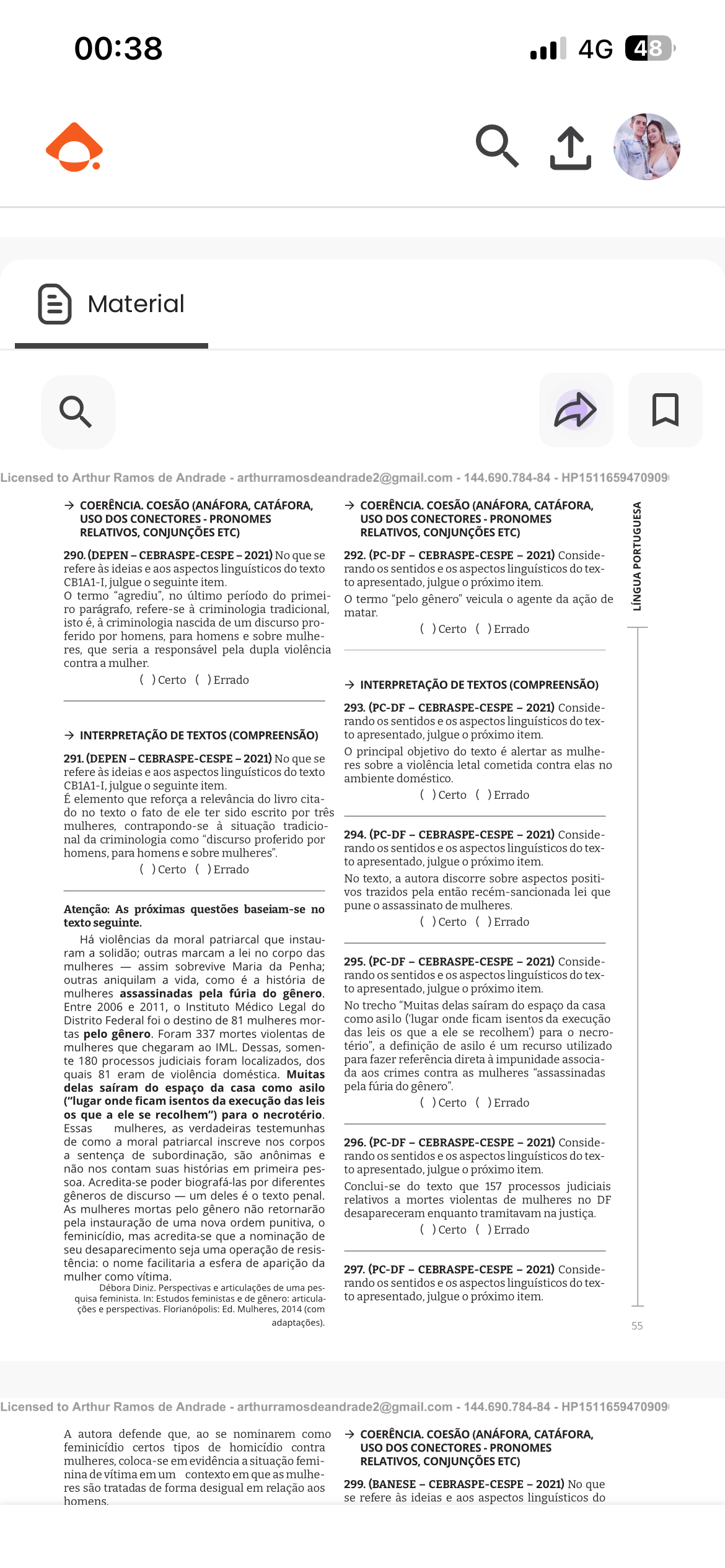 00:38 4G 48 Material Licensed to Arthur Ramos de Andrade 144.690.784-84 HP1511659470909 COERÊNCIA. COESÃO (ANÁFORA, CATÁFORA, COERÊNCIA. COESÃO (ANÁFORA, CATÁFORA, USO DOS CONECTORES PRONOMES USO DOS CONECTORES PRONOMES RELATIVOS, CONJUNÇÕES ETC) RELATIVOS, CONJUNÇÕES ETC) 290. (DEPEN CEBRASPE-CESPE 2021) No que se 292. (PC-DF CEBRASPE-CESPE 2021) Conside- refere às ideias e aos aspectos linguísticos do texto rando os sentidos e os aspectos linguísticos do tex- CB1A1-I, julgue seguinte item. to apresentado, julgue próximo item. LÍNGUA PORTUGUESA termo "agrediu", no último período do primei- termo "pelo gênero" veicula agente da ação de ro parágrafo, refere-se à criminologia tradicional, matar. isto é, à criminologia nascida de um discurso pro- Certo Errado ferido por homens, para homens e sobre mulhe- res, que seria a responsável pela dupla violência contra a mulher. Certo ( ) Errado INTERPRETAÇÃO DE TEXTOS (COMPREENSÃO) 293. (PC-DF CEBRASPE-CESPE 2021) Conside- rando os sentidos e os aspectos linguísticos do tex- INTERPRETAÇÃO DE TEXTOS (COMPREENSÃO) to apresentado, julgue próximo item. 291. (DEPEN CEBRASPE-CESPE - 2021) No que se principal objetivo do texto é alertar as mulhe- res sobre a violência letal cometida contra elas no refere às ideias e aos aspectos linguísticos do texto ambiente doméstico. CB1A1-I. julgue seguinte item. É elemento que reforça a relevância do livro cita- ( ) Certo Errado do no texto fato de ele ter sido escrito por três mulheres, contrapondo-se à situação tradicio- nal da criminologia como "discurso proferido por 294. (PC-DF CEBRASPE-CESPE 2021) Conside- homens, para homens e sobre mulheres". rando os sentidos e os aspectos linguísticos do tex- to apresentado, julgue próximo item. Certo ( ) Errado No texto, a autora discorre sobre aspectos positi- vos trazidos pela então recém-sancionada lei que Atenção: As próximas questões baseiam-se no pune assassinato de mulheres. texto seguinte. ( ) Certo ( ) Errado Há violências da moral patriarcal que instau- ram a solidão; outras marcam a lei no corpo das mulheres assim sobrevive Maria da Penha; 295. (PC-DF CEBRASPE-CESPE 2021) Conside- outras aniquilam a vida, como é a história de rando os sentidos e os aspectos linguísticos do tex- mulheres assassinadas pela fúria do gênero. to apresentado, julgue próximo item. Entre 2006 e 2011, Instituto Médico Legal do No trecho "Muitas delas saíram do espaço da casa Distrito Federal foi destino de 81 mulheres mor- como asilo onde ficam isentos da execução tas pelo gênero. Foram 337 mortes violentas de das leis os que a ele se recolhem') para necro- mulheres que chegaram ao IML. Dessas, somen- tério", a definição de asilo é um recurso utilizado te 180 processos judiciais foram localizados, dos para fazer referência direta à impunidade associa- quais 81 eram de violência doméstica. Muitas da aos crimes contra as mulheres "assassinadas delas saíram do espaço da casa como asilo pela fúria do gênero". ("lugar onde ficam isentos da execução das leis Certo ( ) Errado os que a ele se recolhem") para necrotério. Essas mulheres, as verdadeiras testemunhas de como a moral patriarcal inscreve nos corpos 296. (PC-DF CEBRASPE-CESPE - 2021) Conside- a sentença de subordinação, são anônimas e rando os sentidos e os aspectos linguísticos do tex- não nos contam suas histórias em primeira pes- to apresentado, julgue próximo item. soa. Acredita-se poder biografá-las por diferentes Conclui-se do texto que 157 processos judiciais gêneros de discurso um deles é texto penal. relativos a mortes violentas de mulheres no DF As mulheres mortas pelo gênero não retornarão desapareceram enquanto tramitavam na justiça. pela instauração de uma nova ordem punitiva, Certo Errado feminicídio, mas acredita-se que a nominação de seu desaparecimento seja uma operação de resis- tência: nome facilitaria a esfera de aparição da 297. (PC-DF CEBRASPE-CESPE 2021) Conside- mulher como vítima. Débora Diniz. Perspectivas e articulações de uma pes- rando os sentidos e os aspectos linguísticos do tex- quisa feminista. In: Estudos feministas e de gênero: articula- to apresentado, julgue próximo item. ções e perspectivas. Florianópolis: Ed. Mulheres, 2014 (com adaptações). 55 Licensed to Arthur Ramos de Andrade arthurramosdeandrade2@gmail.com 144.690.784-84 HP1511659470909 A autora defende que, ao se nominarem como COERÊNCIA. COESÃO (ANÁFORA, CATÁFORA, feminicídio certos tipos de homicídio contra USO DOS CONECTORES PRONOMES mulheres, coloca-se em evidência a situação femi- RELATIVOS, CONJUNÇÕES ETC) nina de vítima em um contexto em que as mulhe- res são tratadas de forma desigual em relação aos 299. (BANESE CEBRASPE-CESPE 2021) No que homens. se refere às ideias e aos aspectos linguísticos do