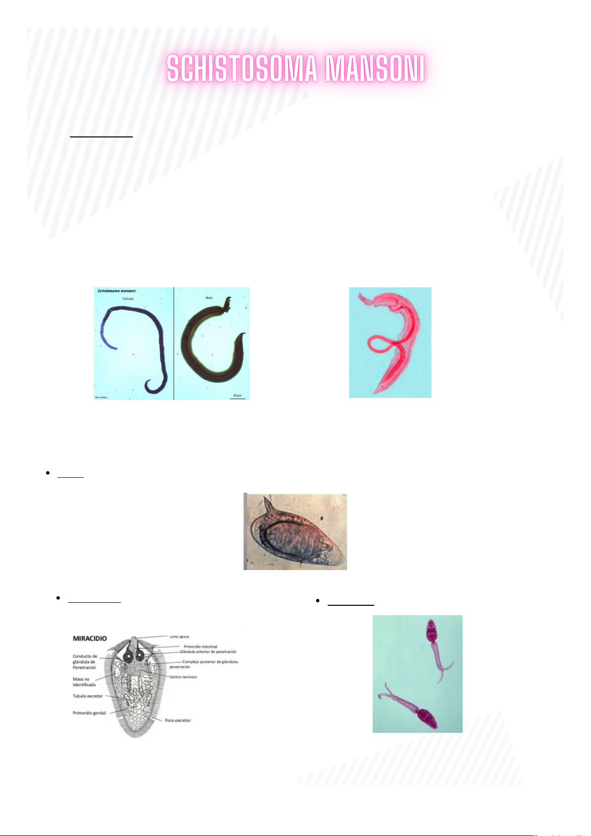 Acad. Enf. Gabriele Vieira Teles Esquistosomose MORFOLOGIA: Os Platelmintos são achatados dorsoventralmente, possuem simetria bilateral, podem ou não ter tubo digestivo, não apresentam o aparelho circulatório e respiratório, mas têm o sistema excretor presente. É dividido em três classes: Turbelaria, Trematoda e Cestoda. Os pertencentes à classe Trematoda possuem o corpo não segmentado e achatado, ventosas, são heteroxenos (possuem mais de um hospedeiro, os caramujos como HI-S. mansoni), são hermafroditas em sua maioria (com exceção do Schistosoma mansoni, que têm macho e fêmea) e diferentes formas evolutivas. O Schistosoma mansoni é um parasita trematódeo, causador da esquistossomose (comumente chamada de: xistase, barriga d’água ou mal do caramujo). O órgão de fixação são ventosas. O macho tem cerca de 1 cm, na porção anterior estão as ventosas oral e ventral (acetábulo). Enquanto na porção posterior existe o canal ginecóforo (onde a fêmea é prendida), possuem também esôfago, ceco e 7 a 9 massa testiculares. A fêmea é maior que o macho, tendo cerca de 1,5 cm, possui ventosas oral e ventral, vulva, útero e ovário. Fêmea Macho Fêmea no canal ginecóforo do macho Ovo: Possui um formato oval, não têm opérculo, na parte mais larga têm um espículo voltado para trás. No Ovo maduro, é possível visualizar um miracídio pela transparência da casca. Miracídio: é recoberto com cílios, glândulas adesivas e de penetração. Cercária: corpo e cauda bifurcada Acad. Enf. Gabriele Vieira Teles CICLO BIOLÓGICO: Heteroxêmico Habitam nos vasos sanguíneos do sistema porta hepático (fígado e intestino delgado humano) e os ramos terminais da veia mesentérica inferior. HABITAT: TRANSMISSÃO: Ocorre quando as cercárias penetram pelos pés e pernas em contato com água contaminada. Elas possuem maior atividade entre 10 a 16 horas, quando há luz e calor intensos. Os locais mais frequentes são valas de irrigação de horta, açudes e córregos frequentados por lavadeiras e crianças. O ciclo biológico tem envolvimento das seguintes formas evolutivas: miracídios, esporocistos, cercárias, esquistossômulos e vermes adultos. Para os humanos, a forma infectante é a cercária de cauda bifurcada. O hospedeiro definitivo é o homem, os hospedeiros intermediários são os moluscos do gênero Oncomelania (caramujos). Após a eliminação com as fezes, os ovos eclodem na água e liberam os miracídios,que se desenvolvem nos moluscos (hospedeiro intermediário), se transformam em esporocistos e podem originar centenas de cercárias. Após a liberação das cercárias, ao encontrar os pés ou pernas do hospedeiro definitivo, penetram na pele humana, perdem as caudas e tornam-se esquistossômulos, que migrarão até os pulmões e, posteriormente, para o sistema portovascular. Se transformam em sua forma adulta, quando começam a migrar contra o fluxo sanguíneo portal para as vênulas mesentéricas dos intestinos delgado e grosso. Após o acasalamento, onde a fêmea se adere de maneira permanente no canal ginecóforo do macho, a fêmea grávida deposita ovos no espaço intravascular de pequenos vasos tributários. Por meio das secreções enzimáticas liberadas pelos ovos, eles conseguem atravessar a parede venosa e alcançar o lúmen do tubo intestinal. Metade dos ovos fica retida no intestino ou em outros órgãos, para os quais são levados através do fluxo sanguíneo. Então sendo liberados nas fezes. Os ovos da submucosa que chegam a luz intestinal causam:r eação inflamatória, pressão dos ovos postos atrás, liberação de enzimas proteolíticas dentro do miracídio, adelgaçamento da parede do vaso pela distensão com a presença do casal, perfuração da parede venular já debilitada pelos fatores acima e auxiliada pela descamação epitelial provocada pelo bolo fecal. Acad. Enf. Gabriele Vieira Teles É dependente da cepa do parasito (virulência), carga parasitária adquirida, idade (mais comuns em jovens), estado nutricional e resposta imunitária do indivíduo. Cercária: pode causar uma dermatite cercariana (rocesso imunoinflamatório) ou dermatite do nadador prurido, erupção urticariforme e em nas primeira 24 horas: eritema, edema, pequenas pápulas e dor. Esses sintomas são mais intensos em reinfecções. Esquistossômulos: demoram três dias para chegar aos pulmões, vão do pulmão ao sistema porta por duas vias, a principal é através da: Via sanguínea → Arteríolas e capilares pulmonares→Veia Porta →Coração esquerdo→Aorta até rede capilar terminal→ Sistema Porta Intra-hepático. Causam linfadenia generalizada, febre, aumento do baço e sintomas pulmonares. Viram vermes adultos, machos e fêmeas, e migram acasalados para a Veia mesentérica inferior, onde colocaram os ovos. Vermes adultos: Os vivos permanecem sem produzir lesões, entretanto, os mortos causam lesões extensas e circunscritas. Ocorre a espoliação devido ao alto metabolismo, de ferro e glicose. Ovos: Geram um grande número de hemorragias, edemas da submucosa e fenômenos degenerativos pequenos e superficiais, que são geralmente reparadas. No fígado podem permanecer e causar alterações importantes, como uma reação granulomatosa (granuloma). PATOGENIA: SINTOMATOLOGIA: A doença gera um quadro clínico assintomático (10 a 35 dias após infecção), na fase aguda (50 a 120 dias após infecção) : febre, mal estar , sudorese, calafrios, anorexia, tosse, fenômenos alérgicos, diarreia (sangue), hepatoesplenomegalia discreta e discreta alteração da função hepática, linfadenia, leucocitose, aumento das globulinas. Alguns casos são letais. Pode causar lesões a distância que são geradas por antígenos e complexos antígeno- anticorpo. Os sintomas gerais são: diarreia, fadiga,febre, dores abdominais,constipação, perda de peso, hepatomegalia, esplenomegalia, podendo ocorrer complicações hepáticas como cirrose e hipertensão portal nos caso