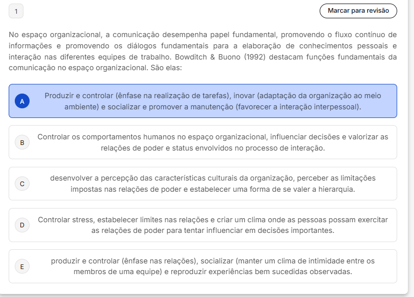 1 Marcar para revisão No espaço organizacional, a comunicação desempenha papel fundamental, promovendo O fluxo de informações e promovendo diálogos fundamentais para a elaboração de conhecimentos pessoais e interação nas diferentes equipes de trabalho. Bowditch & Buono (1992) destacam funções fundamentais da comunicação no espaço organizacional. São elas: Produzir e controlar (ênfase na realização de tarefas), inovar (adaptação da organização ao meio A ambiente) e socializar e promover a manutenção (favorecer a interação interpessoal). Controlar comportamentos humanos no espaço organizacional, influenciar decisões e valorizar as B relações de poder e status envolvidos no processo de interação. desenvolver a percepção das características culturais da organização, perceber as limitações C impostas nas relações de poder e estabelecer uma forma de se valer a hierarquia. Controlar stress, estabelecer limites nas relações e criar um clima onde as pessoas possam exercitar D as relações de poder para tentar influenciar em decisões importantes. produzir e controlar (ênfase nas relações), socializar (manter um clima de intimidade entre E membros de uma equipe) e reproduzir experiências bem sucedidas observadas.