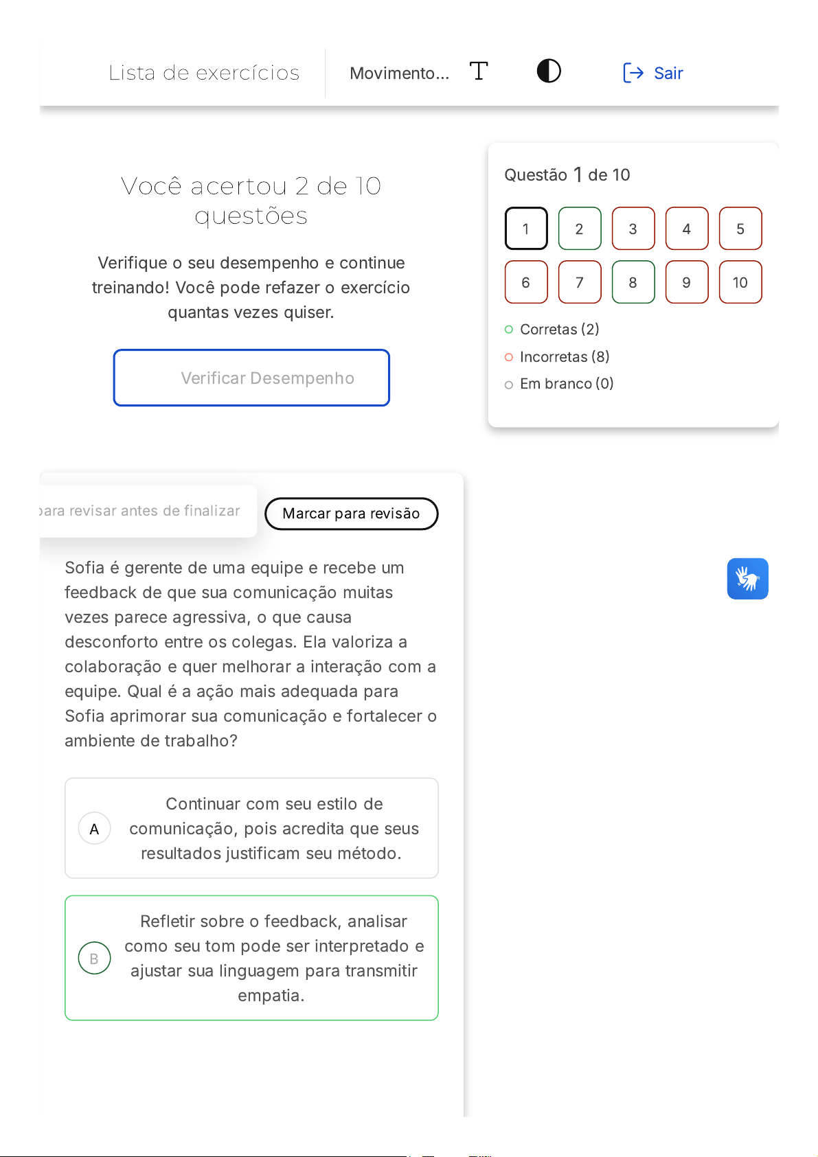 24/03/2026 16:15 https://estacio.saladeavaliacoes.com.br/exercicio/69c2e29f5f43b01fd98b16ba/gabarito/ https://estacio.saladeavaliacoes.com.br/exercicio/69c2e29f5f43b01fd98b16ba/gabarito/ 1/18 Você acertou 2 de 10 questões Verifique o seu desempenho e continue treinando! Você pode refazer o exercício quantas vezes quiser. Verificar Desempenho A B 1 Marcar para revisãopara revisar antes de finalizar Sofia é gerente de uma equipe e recebe um feedback de que sua comunicação muitas vezes parece agressiva, o que causa desconforto entre os colegas. Ela valoriza a colaboração e quer melhorar a interação com a equipe. Qual é a ação mais adequada para Sofia aprimorar sua comunicação e fortalecer o ambiente de trabalho? Continuar com seu estilo de comunicação, pois acredita que seus resultados justificam seu método. Refletir sobre o feedback, analisar como seu tom pode ser interpretado e ajustar sua linguagem para transmitir empatia. Questão 1 de 10 Corretas �2� Incorretas �8� Em branco �0� 1 2 3 4 5 6 7 8 9 10 Lista de exercícios Movimento… Sair 24/03/2026 16:15 https://estacio.saladeavaliacoes.com.br/exercicio/69c2e29f5f43b01fd98b16ba/gabarito/ https://estacio.saladeavaliacoes.com.br/exercicio/69c2e29f5f43b01fd98b16ba/gabarito/ 2/18 C D E Apenas reduzir o tempo de comunicação com a equipe, para evitar possíveis mal-entendidos. Desconsiderar o feedback e focar apenas na produtividade da equipe, pois acredita que os resultados são o mais importante. Solicitar que os colegas adaptem sua maneira de receber críticas para que se ajustem a seu estilo. Resposta incorreta Opa! A alternativa correta é a letra B. Confira o gabarito comentado! Gabarito Comentado Analisar e adaptar a forma de se comunicar ao feedback recebido permite que Sofia fortaleça sua inteligência emocional e promova um ambiente mais acolhedor. A empatia é essencial para criar conexões e desenvolver uma comunicação eficaz com a equipe. 2 Marcar para revisão A Psicanálise, iniciada por Freud, revolucionou o entendimento da psicologia humana. Este movimento destacou-se pelo estudo do inconsciente e dos processos mentais não observáveis diretamente. Seu impacto foi significativo na forma como a psique é compreendida e abordada em terapias. 24/03/2026 16:15 https://estacio.saladeavaliacoes.com.br/exercicio/69c2e29f5f43b01fd98b16ba/gabarito/ https://estacio.saladeavaliacoes.com.br/exercicio/69c2e29f5f43b01fd98b16ba/gabarito/ 3/18 A B C D E Qual conceito é central para a Psicanálise, conforme descrito por Freud? Condição pré-consciente. Reforço positivo. Inconsciente. Campo fenomenológico. Condicionamento clássico. Resposta correta Parabéns, você selecionou a alternativa correta. Confira o gabarito comentado! Gabarito Comentado A Psicanálise, fundada por Sigmund Freud, é conhecida por enfatizar o papel do inconsciente na determinação do comportamento e pensamento humano. Enquanto outros conceitos como condição pré-consciente, reforço positivo, campo fenomenológico e condicionamento clássico pertencem a diferentes escolas ou teorias psicológicas, é o inconsciente que está no cerne da Psicanálise. 3 Marcar para revisão 24/03/2026 16:15 https://estacio.saladeavaliacoes.com.br/exercicio/69c2e29f5f43b01fd98b16ba/gabarito/ https://estacio.saladeavaliacoes.com.br/exercicio/69c2e29f5f43b01fd98b16ba/gabarito/ 4/18 A B C D E �CESPE / CEBRASPE/2017 - adaptada) De acordo com as contribuições freudianas, o sujeito seria determinado por seu inconsciente. Sobre o aparelho psíquico, analise as asserções I e II. I. O aparelho psíquico seria constituído por três instâncias: id, ego e superego. PORQUE II. O ego é o responsável pela mediação entre as moções advindas do id, as exigências do superego e a realidade externa. Marque a alternativa que apresenta a relação correta entre as asserções I e II. As asserções I e II são verdadeiras e a asserção II é uma justificativa para a asserção I. As asserções I e II são verdadeiras, mas a asserção II não é uma justificativa para a asserção I. A asserção I é verdadeira e a asserção II é falsa. A asserção I é falsa e a asserção II é verdadeira. As asserções I e II são falsas. Resposta incorreta Opa! A alternativa correta é a letra B. Confira o gabarito comentado! Gabarito Comentado As asserções I e II são ambas verdadeiras. A primeira asserção afirma que o aparelho 24/03/2026 16:15 https://estacio.saladeavaliacoes.com.br/exercicio/69c2e29f5f43b01fd98b16ba/gabarito/ https://estacio.saladeavaliacoes.com.br/exercicio/69c2e29f5f43b01fd98b16ba/gabarito/ 5/18 A B C psíquico é composto por três instâncias: id, ego e superego, o que está correto de acordo com a teoria freudiana. A segunda asserção afirma que o ego é responsável pela mediação entre as moções advindas do id, as exigências do superego e a realidade externa, o que também está correto. No entanto, a asserção II não justifica a asserção I, pois a função do ego não explica a constituição do aparelho psíquico. Portanto, a alternativa correta é a B� "As asserções I e II são verdadeiras, mas a asserção II não é uma justificativa para a asserção I". 4 Marcar para revisão A teoria da Gestalt, desenvolvida por psicólogos como Max Wertheimer, enfatiza a percepção do todo como mais significativa do que a soma de suas partes. Esta abordagem revolucionou o entendimento da percepção e da cognição humana, destacando a importância das relações e configurações na psicologia. Qual é o princípio fundamental da Gestalt? Reforço negativo. Percepção do todo. Inconsciente. 24/03/2026 16:15 https://estacio.saladeavaliacoes.com.br/exercicio/69c2e29f5f43b01fd98b16ba/gabarito/ https://estacio.saladeavaliacoes.com.br/exercicio/69c2e29f5f43b01fd98b16ba/gabarito/ 6/18 D E Condição pré-consciente. Comportamento observável. Resposta incorreta Opa! A alternativa correta é a letra B. Confira o gabarito c