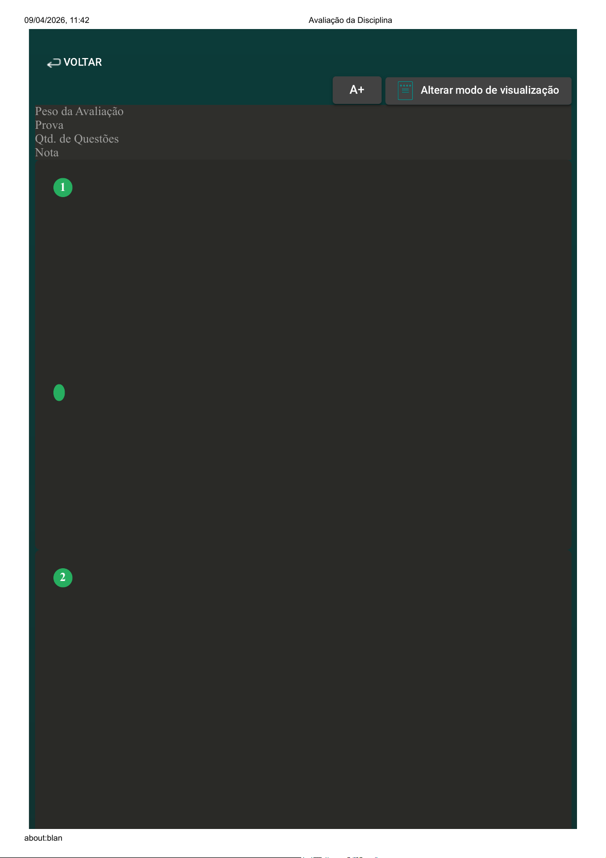 Prova Impressa GABARITO | Avaliação da Disciplina (Cod.:645375) Peso da Avaliação 10,00 Prova 112015572 Qtd. de Questões 20 Nota 8,00 A comissão de formação e regulamentação do conselho nacional da ABPp, determina qual é o perfil profissional desejado do psicopedagogo. Sobre esse perfil, assinale a alternativa correta: A É o profissional habilitado para atuar com os processos de aprendizagem nas instituições de ensino, clínicas e hospitais, emitindo laudos psiquiátricos. B Trata-se do profissional habilitado para atuar com os processos de aprendizagem junto aos indivíduos, grupos, instituições de ensino e comunidade. C É um especialista em diagnósticos relacionados com os problemas de aprendizagem. D É o indivíduo pós-graduado, em nível de especialização, que atua diretamente na aprendizagem humana. Para Nádia Aparecida Bossa, a psicopedagogia nasceu de uma necessidade de contribuir na busca de soluções para a difícil questão do problema da aprendizagem. BOSSA, N. A. A psicopedagogia no Brasil: contribuições a partir da prática. Porto Alegre: Artes Médicas, 1994 (adaptado). Diante disso e com base na visão da citada autora sobre o assunto, assinale a alternativa que descreve corretamente as três conotações do termo psicopedagogia: VOLTAR A+Aumentar, FonteAlterar modo de visualização 1 2 09/04/2026, 11:42 Avaliação da Disciplina about:blank 1/15 A Como um estudo, um campo de investigação do problema de aprendizagem e um saber compartilhado. B Como uma área de estudo, uma prática e um campo de investigação sobre o fracasso escolar. C Como uma prática, um campo de investigação do ato de aprender e um saber científico. D Como uma prática, um campo de análise diagnóstica e um saber técnico. A psicopedagogia ganha força ao demostrar que suas ações são eficazes no combate dos mais variados problemas de aprendizagem em todo território nacional. Sabendo disso, analise a seguinte asserção-razão: A essência da prática psicopedagógica possui uma característica humanística marcante. PORQUE Sua atuação está pautada principalmente num olhar mais amplo e inclusivo dos processos de ensino e aprendizagem. Assinale a alternativa que apresenta a resposta correta: A A primeira afirmação é verdadeira, e a segunda afirmação é falsa. B As duas afirmações são verdadeiras, porém não mantêm relação entre si. C As duas afirmações são verdadeiras, e a segunda é uma justificativa da primeira. D A primeira afirmação é falsa, e a segunda afirmação é verdadeira. 3 09/04/2026, 11:42 Avaliação da Disciplina about:blank 2/15 O psicopedagogo deve agir eticamente e proceder com lealdade e boa-fé em suas relações profissionais, bem como em todos os atos de seu ofício. Sobre a ética, na perspectiva de Dalai Lama, assinale a alternativa correta: A É a capacidade de se indignar perante as crueldades. B É a norma positivada, presente em vários códigos. C É o fundamento mais importante do indivíduo perfeito, que exerce sua virtude somente para si mesmo. D É base de toda virtude, bem como o solo onde todas as ações virtuosas se apoiam e enraízam. Diversas áreas de estudos contribuem para a formação dos conhecimentos necessários ao profissional psicopedagogo em sua trajetória. Sobre o objeto de estudo dessas diferentes áreas do conhecimento, analise e associe os itens que seguem: I – Psicologia. II – Psicolinguística. III – Neurologia. IV – Filosofia. ( ) Tratamento das doenças que atingem o sistema nervoso central e periférico. ( ) Estados e processos mentais. ( ) Processo de aquisição da linguagem e processamento linguístico. ( ) Natureza das coisas e suas relações entre si. 4 5 09/04/2026, 11:42 Avaliação da Disciplina about:blank 3/15 Assinale a alternativa que apresenta a sequência correta de respostas: A III – I – II – IV. B III – II – I – IV. C II – I – III – IV. D II – III – I – IV. A subjetividade não é inata ao indivíduo, mas construída por meio da apropriação do material do mundo social e cultural. Sabendo disso, analise as sentenças que seguem: I – A subjetividade é uma síntese singular e individual que cada sujeito constrói conforme desenvolve e vivencia as experiências. II – A subjetividade é única e iguala os indivíduos na medida em que seus elementos são experimentados. III – A subjetividade iguala os indivíduos, transformando diferentes valores em padrões de conduta e pensamento. IV – A subjetividade é um mundo de ideias, significados e emoções, construído internamente pelo indivíduo a partir de suas relações sociais, experiências e carga biológica. Assinale a alternativa que apresenta a resposta correta: A As sentenças I, II, III e IV estão corretas. B As sentenças II, III e IV estão corretas. C As sentenças I, III e IV estão corretas. 6 09/04/2026, 11:42 Avaliação da Disciplina about:blank 4/15 D As sentenças I, II e IV estão corretas. A psicopedagogia no âmbito escolar desempenha um papel importante contribuindo com os processos educacionais relacionados ao ensino e aprendizagem. Nesse sentido, assinale V para verdadeiro e F para falso nas afirmações que seguem: ( ) O psicopedagogo deve reconhecer o professor e sua cultura, o professor no imaginário do aluno e o aluno no imaginário do professor. ( ) O psicopedagogo deve realizar uma análise contextual somente quando solicitado pela secretaria regional de educação. ( ) O psicopedagogo deve motivar e movimentar o psicodinamismo no universo escolar. ( ) O psicopedagogo deve considerar todos os fatores que podem estar atrapalhando a aprendizagem. Assinale a alternativa que apresenta a sequência correta de respostas: A V – F – V – V. B V – V – V – F. C V – V – V – V. D V – F – V – F. 7 09/04/2026, 11:42 Avaliação da Disciplina about:blank 5/15 No campo da psicopedagogia, a figura de um sujeito íntegro deve ser mantida em todas a