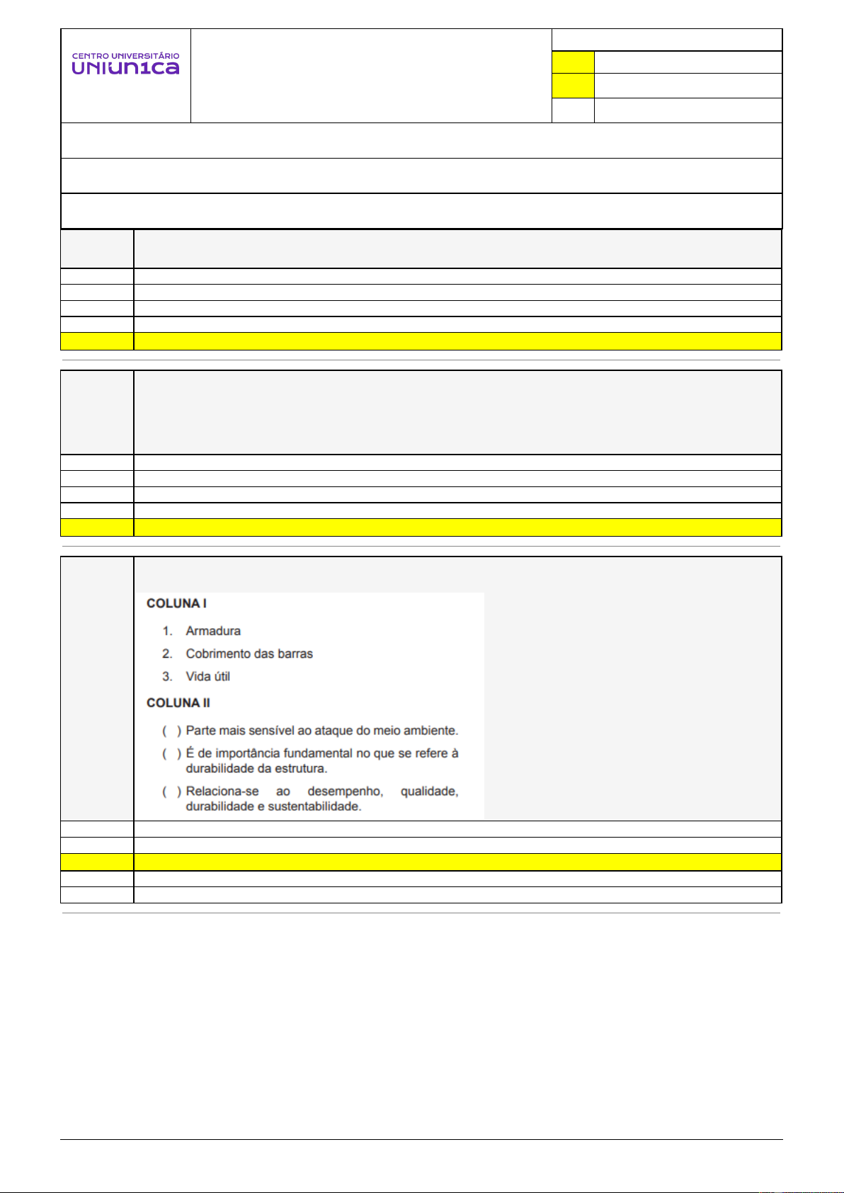 Pincel Atômico - 09/04/2026 14:28:09 1/3 KALITA FERREIRA SANTOS Avaliação Online (SALA EAD) - Todos Capitulos/Referencias Atividade finalizada em 20/08/2025 09:17:34 (4379614 / 1) LEGENDA Resposta correta na questão # Resposta correta - Questão Anulada X Resposta selecionada pelo Aluno Disciplina: CONCRETO ARMADO II [240481] - Avaliação com 10 questões, com o peso total de 50,00 pontos [capítulos - Todos] Turma: Graduação: Engenharia Civil - Grupo: AGOSTO/2021 - EC/AGO/21 [24493] Aluno(a): 91344610 - KALITA FERREIRA SANTOS - Respondeu 7 questões corretas, obtendo um total de 35,00 pontos como nota [357182_92019] Questão 001 A taxa mínima e máxima absolutas de armadura longitudinal a ser adicionada em pilares de concreto armado é, respectivamente: 0,8% e 4,0% da seção do pilar 0,8% e 8,0% da seção do pilar. 0,4% e 6,0% da seção do pilar. 0,6% e 4,0% da seção do pilar. X 0,4% e 8,0% da seção do pilar. [357182_92032] Questão 002 Em relação à análise da arquitetura, concepção estrutural, lançamento estrutural e pré-dimensionamento das estruturas, considere as afirmações a seguir e assinale com V para verdadeiro e com F para falso. ( ) O pré-dimensionamento das estruturas independe do material a ser adotado, pois nesta etapa o modo de ruptura do material não é avaliado. ( ) As vigas metálicas tendem a possuir menores seções que as vigas de concreto armado. ( ) Durante a etapa de análise da arquitetura e concepção estrutural, o projetista estrutural utiliza atualmente avançados softwares que podem realizar essas atividades mais rapidamente. ( ) A área mínima da seção transversal dos pilares em concreto armado é de 360 cm².Assinale a alternativa que apresenta a sequência correta. V – F – V - V V – F – V - F. V – F – F - V. V – V – V - F. X F – V – F - V. [357182_80870] Questão 003 A durabilidade das estruturas de concreto armado depende de vários fatores. A esse respeito, numere a COLUNA II de acordo com a COLUNA I, relacionando os fatores apresentados a seus efeitos sobre a durabilidade das estruturas de concreto armado. 1 3 2 2 1 3 X 1 2 3 3 2 1 2 3 1 Pincel Atômico - 09/04/2026 14:28:09 2/3 [357182_92015] Questão 004 Sobre a resistência do concreto à compressão, podemos considerar as alternativas abaixo: I - A principal característica do concreto é sua resistência à flexão composta, a qual é determinada pelo ensaio de corpos de prova submetidos à compressão centrada. II - Independentemente do tipo de ensaio ou de solicitação, diversos fatores influenciam na resistência do concreto endurecido, dos quais os principais são a relação entre as quantidades de cimento, agregados e água (chamada de traço) e a idade do concreto. III - O calculista de concreto, quando indica um concreto de qualidade de 25 MPa, quer dizer que ele está querendo um concreto que se rompa a tensões inferiores a 25 Mpa. IV - O teste de compressão do concreto é feito normalmente aos 28 dias, quando já é bem expressivo o valor final de resistência do concreto. Ressalta- se que, após 28 dias, o concreto, no seu processo de cura, não ganha mais resistência. V - O concreto, quando lançado nas fôrmas, não tem resistência. Com o passar das horas e dias começa a ter alguma resistência. O teste padrão para avaliar a resistência do concreto à compressão é moldar com o concreto da obra corpos de prova, levá-los a uma câmara úmida e romper aos 28 dias (tempo padrão de referência), em uma prensa. Considerando as alternativas acima, podemos dizer que: As alternativas II, III e IV estão corretas; As alternativas I e II estão corretas; As alternativas III e IV estão erradas; As alternativas II e III estão corretas; X As alternativas III e V estão erradas; [357182_92060] Questão 005 Os principais motivos para a correta utilização do cobrimento das armaduras em elementos estruturais em concreto armado são: Estética e equilíbrio de forças. X Proteção contra corrosão nas armaduras e adequada transmissão de esforços. Redução em cálculo na área de armadura (As) e proteção contra corrosão. Proteção contra descargas elétricas e adequada transmissão de esforços. Baixo custo e facilidade operacional. [357182_80874] Questão 006 Considerando projetos estruturais de estruturas de concreto armado, analise as assertivas a seguir: I. A resistência à compressão característica do concreto (fck) considerada no projeto é igual à resistência à compressão aos 28 dias. II. O concreto possui baixa resistência à tração e alta resistência à compressão. III. O aço possui alta resistência à tração. Quais estão corretas? X Apenas I e II. I, II e III. Apenas I. Apenas II e III. Apenas I e III. [357182_80860] Questão 007 São consideradas ações diretas sobre as estruturas: retração do concreto X cargas permanentes e cargas variáveis fluência Flambagem efeitos térmicos [357182_92039] Questão 008 As cargas caminham pelas estrutura até chegarem ao solo pela fundação. Nesse caminho, diversos elementos são utilizados. Considerando a forma como as cargas são transmitidas, assinale a alternativa correta: As cargas são acumuladas nas lajes e descem andar a andar até à fundação. Os pilares recebem as cargas das vigas e lajes nos pavimentos, andar a andar, e as descarregam nas fundações. As vigas recebem as cargas dos pilares e as levam até a fundação. As lajes recebem as cargas das vigas e depois as distribuem aos pilares. X Os pilares descarregam suas cargas nas vigas e lajes dos pavimentos, andar a andar, e as levam para as fundações. [357182_80848] Questão 009 A durabilidade de uma estrutura de concreto armado depende da agressividade do meio, da espessura de cobrimento das armaduras e é altamente dependente das características do concreto. Em razão do exposto, pode-se afirmar que, em regiões de forte agressividade do meio: Não há relação entre durabilidade, resistênci