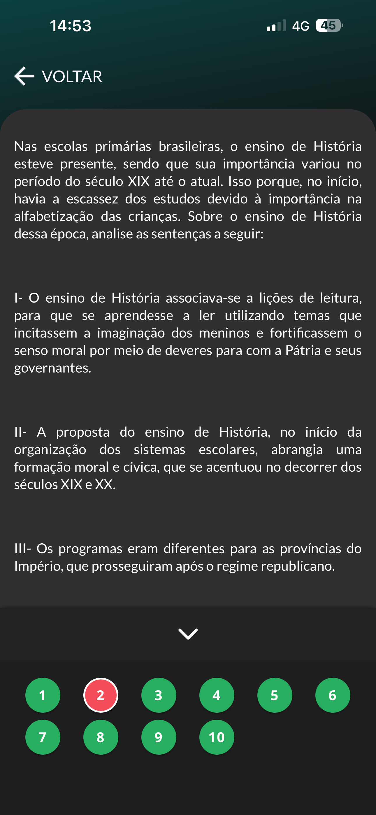 14:53 4G 45 VOLTAR Nas escolas primárias brasileiras, ensino de História esteve presente, sendo que sua importância variou no período do século XIX até atual. Isso porque, no início, havia a escassez dos estudos devido à importância na alfabetização das crianças. Sobre ensino de História dessa época, analise as sentenças a seguir: I- ensino de História associava-se a lições de leitura, para que se aprendesse a ler utilizando temas que incitassem a imaginação dos meninos e fortificassem senso moral por meio de deveres para com a Pátria e seus governantes. II- A proposta do ensino de História, no início da organização dos sistemas escolares, abrangia uma formação moral e cívica, que se acentuou no decorrer dos séculos XIX e III- Os programas eram diferentes para as províncias do Império, que prosseguiram após regime republicano. 1 2 3 4 5 6 7 8 9 10