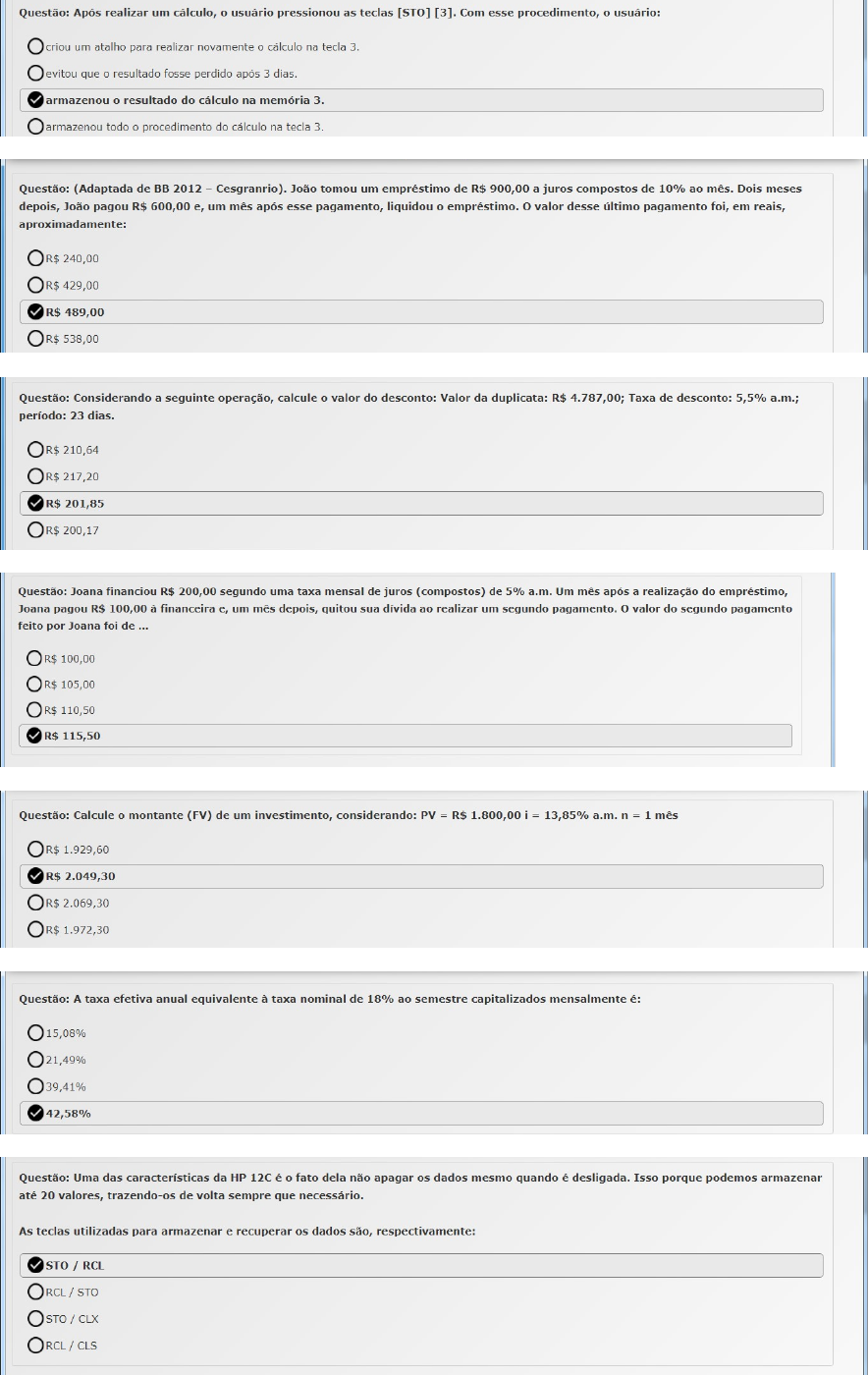 Questão: realizar um cálculo, 0 pressionou as teclas [STO] [3]. Com esse procedimento, 0 criou um atalho para realizar novamente 0 na tecla 3. evitou que resultado fosse perdido 3 dias. armazenou 0 resultado do cálculo na 3. armazenou todo procedimento do cálculo na tecla 3. Questão: (Adaptada de 2012 Cesgranrio). João tomou um empréstimo de R$ 900,00 a juros compostos de 10% ao mês. Dois meses depois, João pagou R$ 600,00 e, um mês após esse pagamento, liquidou 0 empréstimo. 0 valor desse último pagamento foi, em reais, aproximadamente: R$ 240,00 R$ 429,00 R$ 489,00 R$ 538,00 Questão: Considerando a seguinte operação, calcule 0 valor do desconto: Valor da duplicata: R$ 4.787,00; Taxa de desconto: 5,5% a.m.; período: 23 dias. R$ 210,64 R$ 217,20 R$ 201,85 R$ 200,17 Questão: Joana financiou R$ 200,00 segundo uma taxa mensal de juros (compostos) de 5% a.m. Um mês após a realização do empréstimo, Joana pagou R$ 100,00 a financeira um mês depois, quitou sua divida ao realizar um segundo pagamento. 0 valor do segundo pagamento feito por Joana foi de R$ 100,00 R$ 105,00 R$ 110,50 R$ 115,50 Questão: Calcule 0 montante (FV) de um investimento, considerando: PV R$ 1.800,00 - 13,85% a.m. n = 1 mês R$ 1.929,60 R$ 2.049,30 R$ 2.069,30 R$ 1.972,30 Questão: A taxa efetiva anual equivalente taxa nominal de 18% ao semestre capitalizados mensalmente é: 15,08% 21,49% 39,41% 42,58% Questão: Uma das características da HP 12C é 0 fato dela não apagar dados mesmo quando é desligada. Isso porque podemos armazenar ate 20 valores, trazendo-os de volta sempre que necessário. As teclas utilizadas para armazenar recuperar os dados são, respectivamente: STO RCL RCL STO STO CLX