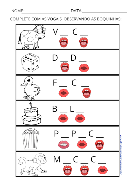 NOME: DATA: COMPLETE COM AS VOGAIS, OBSERVANDO AS BOQUINHAS: V C D D F C B L P P C www.atividadesdiversificadas.com.br