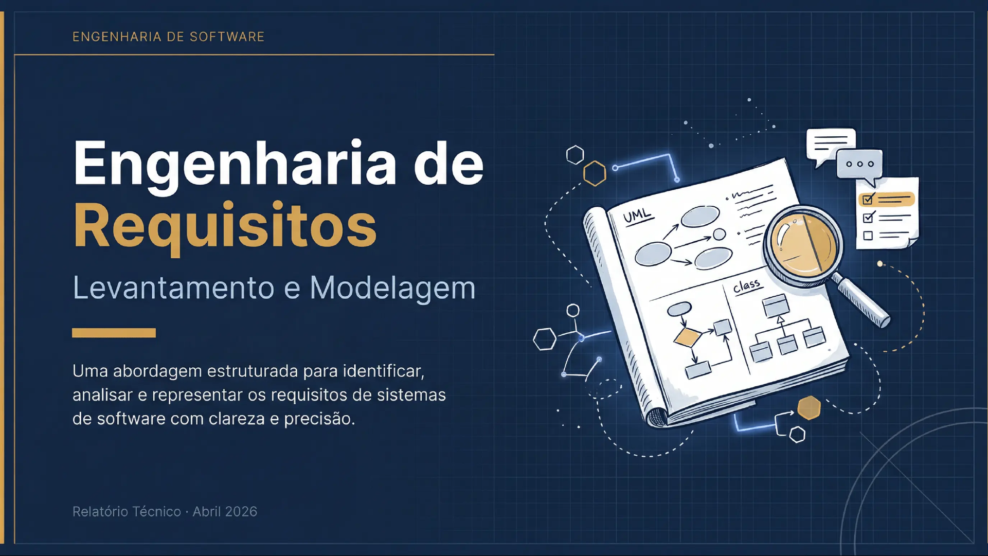 ENGENHARIA DE SOFTWARE Engenharia de Requisitos UML Levantamento e Modelagem class Uma abordagem estruturada para identificar, analisar e representar os requisitos de sistemas de software com clareza e precisão. Relatório Técnico Abril 2026PROCESSO Processo de Engenharia de Requisitos Sete fases interligadas que guiam desenvolvimento de sistemas 01 03 05 07 Concepção Elaboração Especificação Gestão Identificação dos 02 Refinamento e 04 Transformação em 06 Controle contínuo stakeholders e visão eliminação de requisitos técnicos de mudanças e geral do sistema ambiguidades do sistema rastreabilidade Elicitação Negociação Validação Coleta de requisitos Resolução de Aprovação e funcionais e não conflitos entre alinhamento com funcionais stakeholders necessidades reais "A Gestão permeia todas as fases - é fio condutor do ciclo de vida dos requisitos."Classificação e Tipos de Requisitos Os quatro pilares que moldam funções e qualidade do sistema FUNCIONAIS NÃO FUNCIONAIS que sistema faz Como sistema deve ser Descrevem comportamentos e funções Atributos de qualidade: desempenho, específicas. Ex: adicionar itens ao segurança, confiabilidade, eficiência e carrinho em um e-commerce. robustez. DE DOMÍNIO SUBCONSCIENTES Regras do ambiente que vai sem dizer TIPOS DE REQUISITOS Regulamentações, normas da indústria Expectativas implícitas baseadas em e práticas de negócio. Ex: padrões convenções. Ex: interface de usuário contábeis internacionais. intuitiva e responsiva. Engenharia de Requisitos Levantamento e ModelagemELICITAÇÃO DE REQUISITOS Técnicas Tradicionais de Levantamento Abordagens essenciais para coletar informações e identificar necessidades dos stakeholders Entrevistas Questionários Brainstorming Workshops Observação Facilitados Conversas individuais ou Formulários distribuídos Geração livre de ideias Imersão no ambiente do em grupo para coletar para coletar dados em grupo, sem críticas, Sessões colaborativas usuário para identificar informações subjetivas quantitativos e para explorar requisitos com stakeholders para requisitos não e detalhadas qualitativos em escala criativos definir e priorizar articulados ou implícitos requisitos em conjunto A combinação de múltiplas técnicas garante cobertura abrangente e reduz risco de requisitos omitidos.ELICITAÇÃO Técnicas Visuais e Analíticas Prototipagem Análise de Documentos Mind Mapping Abordagens para refinar e validar requisitos Versões preliminares para Revisão de manuais e Organização visual de de forma visual e estruturada. coletar feedback visual relatórios para identificar ideias e requisitos por rapidamente requisitos existentes categorias 05 / 09 05 / 09 Role-playing Análise de Interface Casos de Uso Encenação de cenários Identificação de requisitos Descrição das interações para explorar requisitos sob nas interações entre entre usuário e sistema diferentes perspectivas sistemas para atingir objetivos "A combinação de múltiplas técnicas visuais garante cobertura abrangente dos requisitos."MODELAGEM DE REQUISITOS Diagramas UML Essenciais Especificar Visualizar Documentar Casos de Uso 83,3% de uso Atividades 66,7% de uso Classes 100% de uso Identifica requisitos funcionais sob a Visualiza fluxo de trabalho de Estrutura as relações entre classes, perspectiva do usuário final. Promove processos e histórias de usuário. atributos e métodos do sistema. compreensão compartilhada do Identifica áreas de melhoria e pontos Essencial para design e comportamento do sistema. de decisão. modelagem de dados. " "A UML, utilizada de forma pragmática, aprimora significativamente a comunicação entre equipes e stakeholders." Fonte: Visual Paradigm; Silva e Costa, 202407 / 09 MODELAGEM ÁGIL Modelagem em Contextos Ágeis Colaboração e leveza em vez de documentação exaustiva Modelagem Tradicional Modelagem Ágil Como usuário, Sprint Ento Dado que eu quero... Quando. 71,4% Então.. das empresas ágeis não utilizam UML Silva e Costa, 2024 Diagramas extensos e rígidos Histórias de Usuário centradas no valor Ciclos longos antes de qualquer feedback BDD com exemplos concretos de comportamento Modelagem Iterativa Colaboração Contínua Just-in-Time ModelingGESTÃO DE REQUISITOS 08 Ferramentas e Gestão de Requisitos Centralizar, rastrear e controlar mudanças com precisão Centralização Rastreabilidade Gestão de Mudanças Todas as informações de requisitos Cada requisito conectado à sua Controle de escopo com análise de reunidas em um único repositório origem, aos testes e às entregas, impacto técnico e financeiro antes acessível à equipe inteira. garantindo visibilidade total. de aprovar qualquer alteração. A escolha da ferramenta certa reduz riscos, melhora a comunicação entre equipes e assegura a qualidade do produto final.CONCLUSÃO Melhores Práticas UML A integração estratégica de técnicas de elicitação, abordagens de modelagem e ferramentas de gestão é que transforma requisitos em soluções reais Combine Técnicas Modele com Propósito Gerencie Continuamente reduzindo riscos, alinhando expectativas e Nenhuma técnica isolada Escolha UML quando a clareza Rastreabilidade e gestão de assegurando qualidade em cada entrega. captura todos os requisitos. estrutural importa. Use Histórias mudanças não são opcionais. Use entrevistas, prototipagem de Usuário quando a velocidade Elas protegem 0 escopo e e observação em conjunto. e colaboração são prioridade. valor do produto final. Requisitos bem definidos são a fundação de todo software de qualidade. Engenharia de Requisitos Levantamento e Modelagem 2026