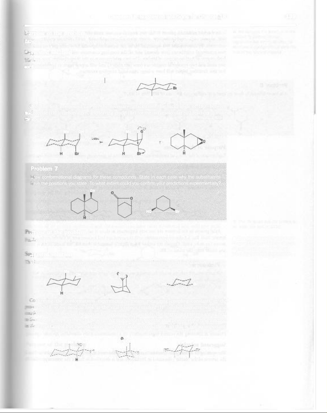 Chapter 18 Suggested solutions for Chapter 18 139 Purpose of the problem Exploration of the relationship between conformation of important trans-decalins and mechanism. Suggested solution mechanism is easy and the conformations of trans-decalins are fixed, so we can start with the Me Me Br H Br H Only the first compound can get the necessary 'attack from the back' angle of 180° between deophile (O⁻), carbon atom, and leaving group (Br) for the intramolecular SN2 reaction to make epoxide. Me oH Me H Br H Br Problem 7 Draw conformational diagrams for these compounds. State in each case why the substituents have the positions you state. To what extent could you confirm your predictions experimentally? oH 0 0 Br H Purpose of the problem exploration of conformation and establishing the link with NMR spectra. This problem uses material from Chapter 19. If you find it too difficult, we suggest you come back to it solution when you have read that chapter. The first two molecules have no choice about their conformation but the third does. Me Br H Confirming the conformations experimentally means measuring coupling constants in the NMR we need to look at the vital protons (marked 'H' on the diagrams below) and whether they can be seen in the spectrum. Fortunately, the interesting protons are all next functional groups so they can be seen. We probably can't see the axial proton at the ring junction the first example but trans-decalins must have axial protons there, so that is not so important. 0 Me 0 Ho Br H He H H H