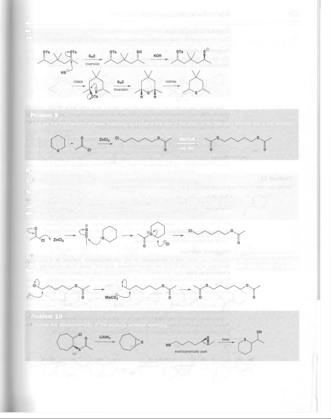 Chapter 17 Suggested solutions for Chapter 17 133 eochemistry right when twisting the molecule round to draw it as a ring. The product is a single but is not chiral. OTs OTs OTs SH OTs S SN2 KoH inversion HS rotate SN2 redraw inversion S S S OTs H H Problem 9 What are the mechanisms of these reactions, and what is the role of the ZnCl₂ in the first step and the Nal in the second? 0 ZnCl₂ CI 0 MeCO₂K 0 0 o CI 0 cat. Nal 0 0 Purpose of the problem Exploration of the roles of two different kinds of catalysts in substitution reactions. Suggested solution The ZnCl₂ acts as a Lewis acid and can be used either to remove chloride from MeCOCl or to mplex with its carbonyl oxygen atom, in either case making it a better electrophile so that it can tack the unreactive oxygen atom of the cyclic ether. Ring cleavage by chloride follows. + :0 0 CI 0 CI ZnCl₂ :0 CI 0 You can read more about this in The second reaction is an SN2 displacement of a reasonable leaving group (chloride) by a rather B. S. Furniss et al., Vogel's textbook eak nucleophile (acetate). The reaction is very slow unless catalysed by iodide - a better of organic chemistry (5th edn), cleophile than acetate and a better leaving group than chloride. It is a nucleophilic catalyst. Longmans, Harlow, 1989, p. 492. CI 0 0 0 0 MeCO₂ 0 0 0 Problem 10 Describe the stereochemistry of the products of these reactions. OH CI 0 0 base S S HS S enantiomerically pure