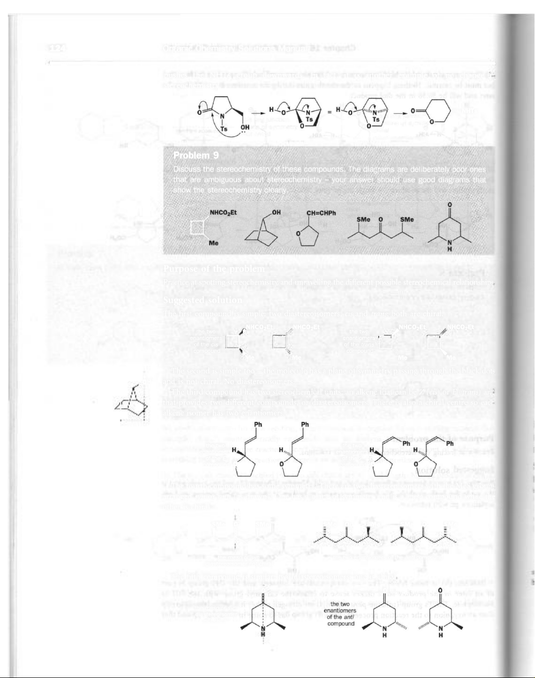 124 Organic Chemistry Solutions Manual pushes the NHTs group downwards. In fact, it is another example of no change in stereochemistry. H H N = N 0 N Ts Ts 0 0 0 Ts Problem 9 Discuss the stereochemistry of these compounds. The diagrams are deliberately poor ones that are ambiguous about stereochemistry - your answer should use good diagrams that show the stereochemistry clearly. NHCO₂Et oH CH=CHPh SMe 0 SMe 0 Me N H Purpose of the problem Practice at spotting stereochemistry and unravelling the different possible stereochemical Suggested solution The first compound is simple: two diastereoisomers, cis and trans; both are chiral. the two the two / NHCO₂Et enantiomers enantiomers of the cis of the trans compound compound Me Me Me Me The second is simple too - the molecule has a plane of symmetry passing through the black dots and is not chiral. No diastereoisomers. The third compound has two stereochemical units: an alkene that can be Z (cis) or E (trans) and that provides two different compounds, or diastereoisomers. There is also a chiral centre so each alkene isomer has two enantiomers. Ph Ph the two the two Ph Ph enantiomers H H enantiomers H H of the E of the Z compound 0 0 compound 0 0 The fourth compound has some symmetry. There are two diastereoisomers with the MeS groups arranged syn or anti (as drawn). One has a plane of symmetry and is a meso compound while the other is chiral. SMe 0 SMe SMe 0 SMe SMe 0 SMe the meso or syn the two enantiomers of the anti compound diastereoisomer not chiral The fifth compound is similar: two diastereoisomers; one is 0 0 0 the two the meso or syn enantiomers diastereoisomer of the anti not chiral compound N N N H H H