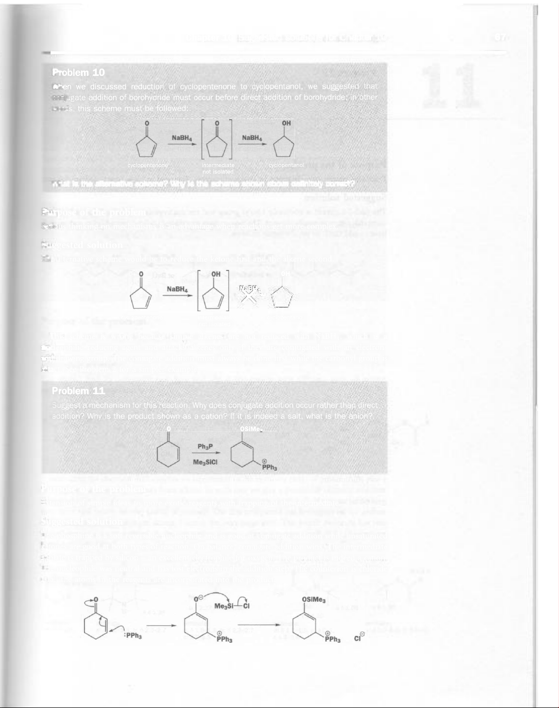 Chapter 10 Suggested solutions for Chapter 10 67 Problem 10 en we discussed reduction of cyclopentenone to cyclopentanol, we suggested that ugate addition of borohydride must occur before direct addition of borohydride; in other this scheme must be followed: 0 0 OH NaBH₄ NaBH₄ cyclopentenone intermediate cyclopentanol not isolated What is the alternative scheme? Why is the scheme shown above definitely correct? Purpose of the problem Serious thinking on mechanisms is an advantage when reactions get more complex. Suggested solution The alternative scheme would be to reduce the ketone first and the alkene second. 0 oH OH NaBH₄ NaBH4 cyclopentenone intermediate cyclopentanol not isolated This scheme is wrong because simple alkenes are not reduced with NaBH₄, which is a cleophilic reducing agent and attacks alkenes only if they are conjugated with an electron- thdrawing group. The conjugate addition must always be done first while the carbonyl group is See Problem 2 for a simpler example. Problem 11 Suggest a mechanism for this reaction. Why does conjugate addition occur rather than direct addition? Why is the product shown as a cation? If it is indeed a salt, what is the anion? 0 OSiMe₃ Ph₃P PPh₃ Purpose of the problem Extension of simple ideas to more exotic reagents with trapping of the intermediate. Suggested solution The phosphine is a soft reversible nucleophile and is good at conjugate addition while unsaturated ketones are good at both types of reaction. On balance, conjugate addition wins. The intermediate enolate is trapped by silicon - an excellent electrophile for oxygen. The product is indeed a cation. The nucleophile was neutral and has lost electrons in the addition step. The counterion is chloride ES all the atoms in the reagents are incorporated into the product. 0 0 CI :PPh₃ PPh₃ PPh₃ CI