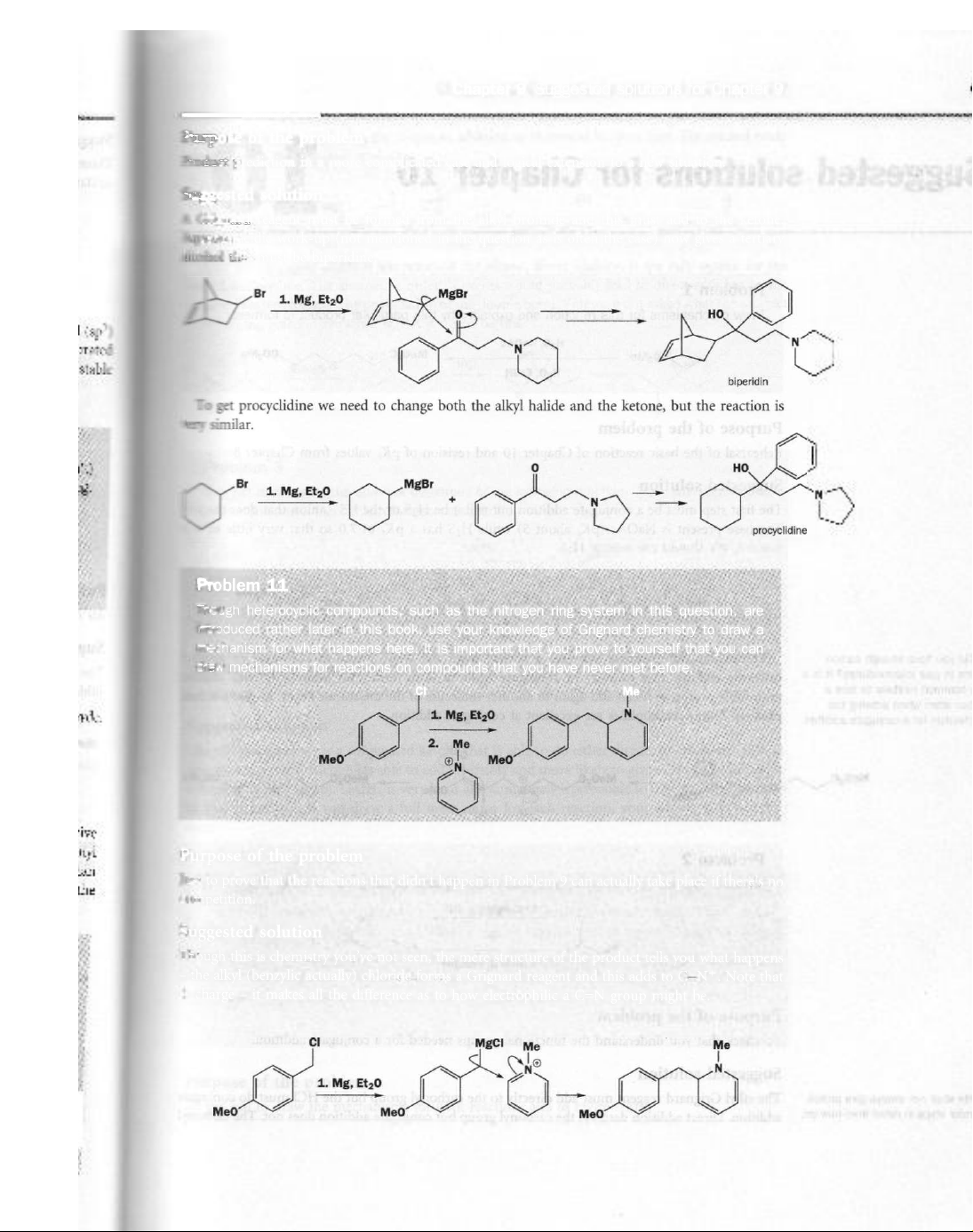 Chapter 9 Suggested solutions for Chapter 9 Purpose of the problem Product prediction in a more complicated case and logical extension to a new situation. agested solution reagent must be formed from the alkyl bromide and this must add to the ketone. acidic work-up (not mentioned in the question as is often the case) now gives a tertiary that must be biperidine. Br 1. Mg, MgBr 0 N N stable biperidin To get procyclidine we need to change both the alkyl halide and the ketone, but the reaction is similar. 0 Br MgBr 1. Mg, + N N procyclidine Problem 11 Though heterocyclic compounds, such as the nitrogen ring system in this question, are troduced rather later in this book, use your knowledge of Grignard chemistry to draw a for what happens here. It is important that you prove to yourself that you can mechanisms for reactions on compounds that you have never met before. CI Me 1. Mg, N 2. Me MeO + MeO N Purpose of the problem to prove that the reactions that didn't happen in Problem 9 can actually take place if there's no competition. Suggested solution Though this is chemistry you've not seen, the mere structure of the product tells you what happens - the alkyl (benzylic actually) chloride forms a Grignard reagent and this adds to Note that + charge - it makes all the difference as to how electrophilic a C=N group might be. CI Me Me N N 1. Mg, MeO MeO MeO