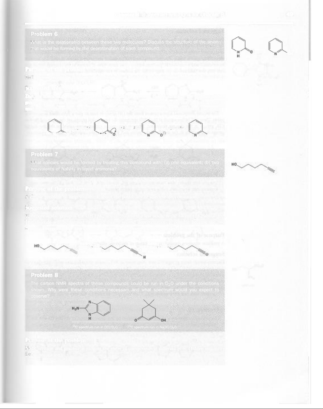 Chapter 8 Suggested solutions for Chapter 8 49 Problem 6 What is the relationship between these two molecules? Discuss the structure of the anion that would be formed by the deprotonation of each compound. N 0 N OH H Purpose of the problem To help you recognize that conjugation may be at the back of some related structures. Suggested solution They are tautomers. They differ only in the position of a proton. Each is an acid - the first has an NH roup as part of an amide and the second has an OH group. Deprotonation may at first appear to produce two different anions but they are actually the same because of delocalization of the anion. N 0 N N D N H Problem 7 What species would be formed by treating this compound with: (a) one equivalent; (b) two equivalents of NaNH₂ in liquid ammonia? Purpose of the problem simple problem to help you think about the possibility of selective deprotonation. Suggested solution The more acidic group is the OH about 16) and the less acidic is the alkyne about 35). The alkoxide will be formed first, and then a second deprotonation is possible because the two negative charges are far apart in the dianion and will not significantly destabilize each other. NaNH₂ NaNH₂ 0 Problem 8 The carbon NMR spectra of these compounds could be run in D₂O under the conditions shown. Why were these conditions necessary and what spectrum would you expect to observe? N N H 0 OH spectrum run in DCI/D₂O spectrum run in NaOD/D₂O Purpose of the problem NMR revision and practice at judging the states of compounds at different pHs. Hidden symmetry from conjugation.