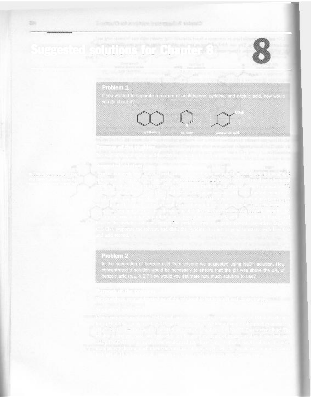 Suggested solutions for Chapter 8 Problem 1 If you wanted to separate a mixture of naphthalene, pyridine, and p-toluic acid, how would you go about it? CO₂H N naphthalene pyridine para-toluic acid Purpose of the problem Revision of simple acidity and basicity in a practical situation. Suggested solution This is a contrived problem - Pyridine is a weak base 5.5) and can be dissolved in aqueous acid. p-Toluic acid is a weak acid you cannot usually separate about 4.5) and can be dissolved in aqueous base. Naphthalene is neither an acid nor a base and three compounds in this way. remains insoluble in water at any pH. So, dissolve the mixture in an organic solvent immiscible with water (say ether, Et₂O, or CH₂Cl₂) and extract with aqueous acid (pH 6) which will extract the p-toluic acid as its anion. You now have three solutions. Evaporate the organic solution of naphthalene and recrystallize it to get pure naphthalene. Acidify the basic solution of p-toluic acid to precipitate the free acid and recrystallize it. Finally, add base to the pyridine solution, extract the pyridine with an organic solvent, (say ether, or CH₂Cl₂), evaporate the solvent, and distil the pyridine. It is just as good to extract with base first and acid second. Problem 2 In the separation of benzoic acid from toluene we suggested using NaOH solution. How concentrated a solution would bei necessary to ensure that the pH was above the of benzoic acid 4.2)? How would you estimate how much solution to use? Purpose of the problem You can check your understanding of the relationship between pH and concentration. Suggested solution Even a very weak solution of NaOH will have a pH > 4.2. By the calculation on p. 184 of the chapter, for a pH of 5 we should need [H₃O⁺] = 10⁻⁵ mol dm⁻¹. We know that the ionic product of water is [H₃O⁺] [OH⁻] = and so for pH 5 we need 10⁻⁵ mol dm⁻¹ of NaOH. This is very dilute! The trouble is that you need one hydroxide ion for every molecule of benzoic acid so if you had, say, 1.22 g PhCO₂H (= 0.01 equiv.) you would need 1000 litres (dm⁻¹) of your NaOH solution. It makes more sense to have a much more concentrated solution, say, 0.1M. This would give an unnecessarily high pH of 13 but you would need only 100 ml (cm³) to extract your benzoic acid.