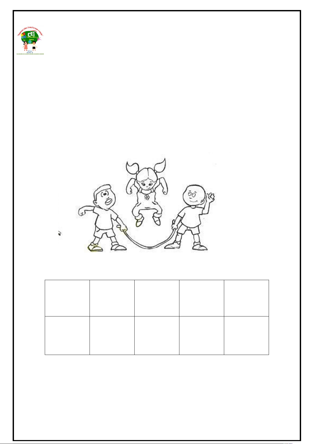 CEI FRANCISCA ALVES TAVARES NOME__________________________________________________ DEPOIS QUE VOCÊ APRENDEU A PULAR CORDA ESCREVA AS LETRAS DA PALAVRA CORDA NOS QUADRINHOS ABAIXO E PINTE A CENA DAS CRIANÇAS PULANDO CORDA. C O R D A VOCÊ É ESPECIAL! image1.png image2.png