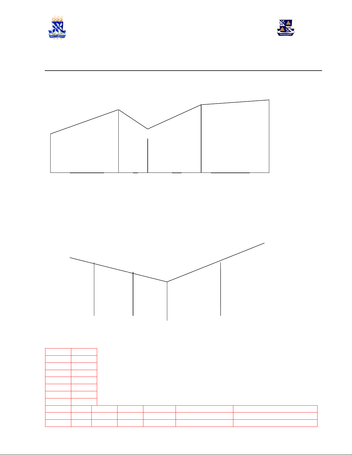 1 Departamento de Transportes - Escola Politécnica - UFBA Disciplina: Projeto de Estradas LISTA 2 - EXERCÍCIOS DE PROJETO VERTICAL 1. Sendo conhecidos os dados constantes do croquis abaixo, calcular as cotas dos PIVs e a rampa desconhecida. A cota da estaca (0+0,00) = 745,23m e na estaca (254+18,00) = 812,87m R: Cota da EST (PIV1) = 761,65m / Cota da EST (PIV2) = 727,18m / Cota da EST (PIV3) = 773,05m / incl. da rampa = 5,2% 2. Com os dados do exercício anterior e, adotando-se os raios R1 = 6.000m, R2 = 4.000m, R3 = 10.000m, calcular as estacas dos PCVs e PTVs. R: EST (PCV1) = 73+17,00 / EST (PTV1) = 90+7,00 EST (PCV2) = 110+14,00 / EST (PTV2) = 130+2,00 EST (PCV3) = 156+17,37 / EST (PTV3) = 171+18,63 3. Dados do trecho de perfil da figura, calcular as cotas do greide (perfil de referência) da estaca 103 à estaca 125. Sabendo-se que: PTV1 = 103+0,00; PCV2 = 109+0,00; PIV2 = 115+0,00 (cota = 542,48) e PTV2 = 121+0,00. ESTACA COTA 103 547,28 104 546,88 105 546,48 106 546,08 107 545,68 108 545,28 109 544,88 ESTACA x 0,02 * x x 2 0,000125 * x2 y = 0,000125 * x2 - 0,02 x COTA = COTA DA ESTACA 109 + y 109 0 0,00 0 0 0 544,88 110 20 0,40 400 0,05 -0,35 544,53 (0+0,00) (82+2,00) (120+8,00) (164+8,00) (254+18,00) PIV2 PIV1 PIV3 1,00% -4,50% 2,20% Curva 1 Curva 2 -2% 4% PTV1 PIV2 PCV2 PTV2 2 111 40 0,80 1600 0,20 -0,60 544,28 112 60 1,20 3600 0,45 -0,75 544,13 113 80 1,60 6400 0,80 -0,80 544,08 114 100 2,00 10000 1,25 -0,75 544,13 115 120 2,40 14400 1,80 -0,60 544,28 116 140 2,80 19600 2,45 -0,35 544,53 117 160 3,20 25600 3,20 0,00 544,88 118 180 3,60 32400 4,05 0,45 545,33 119 200 4,00 40000 5,00 1,00 545,88 120 220 4,40 48400 6,05 1,65 546,53 121 240 4,80 57600 7,20 2,40 547,28 ESTACA COTA 121 547,28 122 548,08 123 548,88 124 549,68 125 550,48 4. Em um perfil de estrada, conhecemos os PIVs e as rampas conforme a figura a seguir. Se adotarmos raios de 6.000,00 m e 8.000,00 m para as curvas 1 e 3, respectivamente, qual é o maior raio que conseguiremos colocar na curva 2? PIV1 = 40+0,00; PIV2 = 56+0,00 e PIV3 = 70+5,00 R: Raio 2 = 5.000,00 m 5. Dado o trecho de perfil da figura abaixo, calcular os raios das duas curvas. PCV1 = 111+4,00 (COTA = 55,656M); PIV1 (COTA = 61,8000M); PIV2 (COTA = 36,488M); PTV2 = 156+8,00 (COTA = 44,720M) R: Raio 1 = 6.400,00 m; Raio 2 = 4.000 m PIV1 PIV2 PIV3 2% -4% 1% -3% 2,4% 4,2% PCV1 PIV1 PTV1=PCV2 PIV2 PTV2 FÓRMULAS: j = ∆i = i2 – i1 L = R * ∆i PCV = PIV – L/2 PTV = PIV + L/2 FÓRMULAS: y = a * x 2 + b * x a = ∆i / 2 * L b = i1