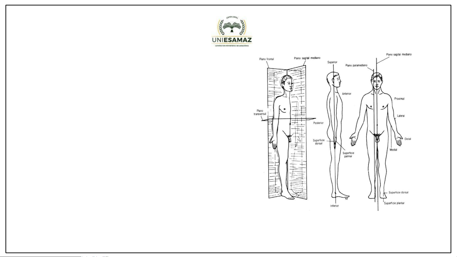 Conceitos Introdutórios de Anatomia Humana Conceitos Introdutórios de Anatomia Humana Ma. Fabiane Ferreira Ma. Carolina Angelim História da Anatomia História da Anatomia No Egito, há registros de conhecimentos anatômicos em papiros médicos, utilizados principalmente na mumificação. (Metwaly, et al., 2021) História da Anatomia História da Anatomia Hipócrates (460-370 a.C.) na Grécia Antiga, descreveu órgãos e suas funções, mas sem a dissecação de corpos humanos. Aristóteles (384-322 a.C.) realizou estudos anatômicos em animais. História da Anatomia História da Anatomia Herófilo - Calcedônia, 335 a.C. — 280 a.C., em Alexandria, foi pioneiro na dissecação humana. Galeno (129-216 d.C.) consolidou o conhecimento anatômico com base em dissecações de animais, influenciando a medicina por séculos. No Renascimento, Andreas Vesalius (1514-1564) revolucionou a anatomia ao corrigir erros de Galeno e publicar De Humani Corporis Fabrica, baseado em dissecações humanas. História da Anatomia História da Anatomia Andreas Vesalius passou a dissecar pessoalmente os corpos, demonstrando as estruturas diretamente para os alunos e corrigindo erros das descrições antigas. Os teatros anatômicos, como o da Universidade de Pádua (1594), se tornaram locais de aprendizado essencial, muitas vezes abertos ao público e até mesmo a autoridades e artistas interessados na anatomia para melhorar suas pinturas e esculturas. (Habbal O., 2017) História da Anatomia História da Anatomia Leonardo da Vinci (1452 – 1519) foi um grande anatomista! Ele chega à anatomia através da pintura. As proporções do corpo humano segundo Vitruvius (1492) A Renascença não vê mais o físico como mero invólucro da alma, mas celebra sua beleza. Dissecção; Anatomia comparada; Modelos artificiais; Computação gráfica; Cadáveres formolizados ou plastinados. Métodos de estudos anatômicos atuais Métodos de estudos anatômicos atuais Conceitos em Anatomia Conceitos em Anatomia Os principais conceitos básicos em Anatomia incluem: Definição de Anatomia – Estudo da estrutura e organização do corpo humano, suas partes e suas relações. Anatomia macroscópica: Estruturas visíveis a olho nu (sistêmica, topográfica e clínica). Anatomia microscópica: Estudo de células e tecidos (histologia). Anatomia do desenvolvimento: Mudanças desde a concepção até a fase adulta (embriologia). Observando o Corpo da Perspectiva Certa Observando o Corpo da Perspectiva Certa Posição anatômica: é a referência padrão utilizada na anatomia para descrever a localização das estruturas do corpo de maneira universal. Nessa posição, o corpo humano é representado da seguinte forma: Cabeça voltada para frente, com olhar direcionado ao horizonte. Indivíduo em pé (posição ortostática). Membros superiores estendidos ao longo do corpo, com as palmas das mãos voltadas para frente. Membros inferiores unidos, com os pés apontando para frente. Todos os termos de posição e direção anatômica (ex.: medial, lateral, proximal, distal) são definidos com base na posição anatômica. Anatomia Superficial e Regiões do Corpo: Regiões principais: cabeça, pescoço, tronco (tórax, abdome, pelve) e membros. Pontos de referência anatômicos (ex.: clavícula, umbigo). Observando o Corpo da Perspectiva Certa Observando o Corpo da Perspectiva Certa Planos anatômicos: Sagital (divide em direita/esquerda), frontal (anterior/posterior) e transversal (superior/inferior). Plano sagital -> Divide o corpo em metades direita e esquerda. Movimentos nesse plano ocorrem para frente e para trás, como flexão e extensão. Plano C o r o n a l -> Divide o corpo em metades anterior e posterior. Movimentos nesse plano ocorrem para os lados, como adução e abdução. Plano transversal -> Divide o corpo em metades superior e inferior. Movimentos nesse plano incluem rotações. Observando o Corpo da Perspectiva Certa Observando o Corpo da Perspectiva Certa Termos de posição e direção: Medial/lateral, proximal/distal, superficial/profundo, superior/inferior anterior/posterior, Observando o Corpo da Perspectiva Certa Observando o Corpo da Perspectiva Certa Termos de posição e direção: Medial/lateral, proximal/distal, superficial/profundo, cranial/caudal anterior/posterior, Observando o Corpo da Perspectiva Certa Observando o Corpo da Perspectiva Certa Intermédio =“entre uma estrutura superficial e uma profunda” Profundo =“mais longe da superfície” Termos de posição e direção: Medial/lateral, proximal/distal, superficial/profundo. Superficial =“mais próximo da superfície” Observando o Corpo da Perspectiva Certa Observando o Corpo da Perspectiva Certa Observando o Corpo da Perspectiva Certa Observando o Corpo da Perspectiva Certa Termos de Orientação Relacionados à Lateralidade: BilateralUnilateral Ipsilateral Contralateral Observando o Corpo da Perspectiva Certa Observando o Corpo da Perspectiva Certa Eixos: Observando o Corpo da Perspectiva Certa Observando o Corpo da Perspectiva Certa Termos de Movimento: extensão e flexão Observando o Corpo da Perspectiva Certa Observando o Corpo da Perspectiva Certa Termos de Movimento: adução e abdução Observando o Corpo da Perspectiva Certa Observando o Corpo da Perspectiva Certa Aplicação na Anatomia Clínica Aplicação na Anatomia Clínica Posição do Paciente: Decúbito dorsal (supino) – Paciente deitado de costas (usado em exames e cirurgias). Decúbito ventral (prono) – Paciente deitado de bruços (usado para exames da coluna). Decúbito lateral – Paciente deitado de lado (usado para punção lombar). Aplicação na Anatomia Clínica Aplicação na Anatomia Clínica Outros exemplos de termos Relacionados a Patologias e Procedimentos: Palpável – Estrutura que pode ser sentida ao toque (ex.: linfonodos aumentados). Ressecção – Remoção cirúrgica de uma estrutura (ex.: ressecção intestinal). Necrose – Morte de um tecido dev