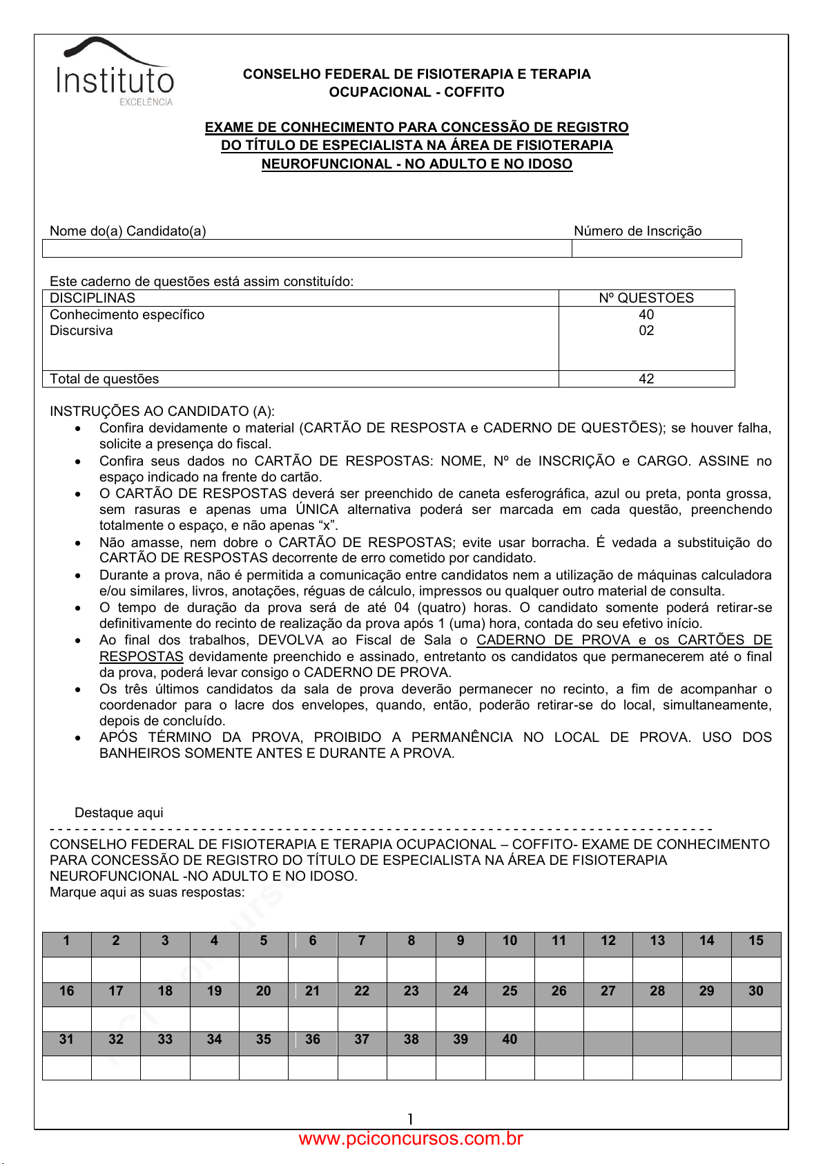 pcimarkpci MDAwMDowMDAwOjAwMDA6MDAwMDowMDAwOmZmZmY6YmFjODo0ZTBl:TW9uLCAyMyBNYXIgMjAyNiAyMDowNTo1OSAtMDMwMA== www.pciconcursos.com.br 1 CONSELHO FEDERAL DE FISIOTERAPIA E TERAPIA OCUPACIONAL - COFFITO EXAME DE CONHECIMENTO PARA CONCESSÃO DE REGISTRO DO TÍTULO DE ESPECIALISTA NA ÁREA DE FISIOTERAPIA NEUROFUNCIONAL - NO ADULTO E NO IDOSO Nome do(a) Candidato(a) Número de Inscrição Este caderno de questões está assim constituído: DISCIPLINAS Nº QUESTOES Conhecimento específico Discursiva 40 02 Total de questões 42 INSTRUÇÕES AO CANDIDATO (A): Confira devidamente o material (CARTÃO DE RESPOSTA e CADERNO DE QUESTÕES); se houver falha, solicite a presença do fiscal. Confira seus dados no CARTÃO DE RESPOSTAS: NOME, Nº de INSCRIÇÃO e CARGO. ASSINE no espaço indicado na frente do cartão. O CARTÃO DE RESPOSTAS deverá ser preenchido de caneta esferográfica, azul ou preta, ponta grossa, sem rasuras e apenas uma ÚNICA alternativa poderá ser marcada em cada questão, preenchendo totalmente o espaço, e não apenas “x”. Não amasse, nem dobre o CARTÃO DE RESPOSTAS; evite usar borracha. É vedada a substituição do CARTÃO DE RESPOSTAS decorrente de erro cometido por candidato. Durante a prova, não é permitida a comunicação entre candidatos nem a utilização de máquinas calculadora e/ou similares, livros, anotações, réguas de cálculo, impressos ou qualquer outro material de consulta. O tempo de duração da prova será de até 04 (quatro) horas. O candidato somente poderá retirar-se definitivamente do recinto de realização da prova após 1 (uma) hora, contada do seu efetivo início. Ao final dos trabalhos, DEVOLVA ao Fiscal de Sala o CADERNO DE PROVA e os CARTÕES DE RESPOSTAS devidamente preenchido e assinado, entretanto os candidatos que permanecerem até o final da prova, poderá levar consigo o CADERNO DE PROVA. Os três últimos candidatos da sala de prova deverão permanecer no recinto, a fim de acompanhar o coordenador para o lacre dos envelopes, quando, então, poderão retirar-se do local, simultaneamente, depois de concluído. APÓS TÉRMINO DA PROVA, PROIBIDO A PERMANÊNCIA NO LOCAL DE PROVA. USO DOS BANHEIROS SOMENTE ANTES E DURANTE A PROVA. Destaque aqui - - - - - - - - - - - - - - - - - - - - - - - - - - - - - - - - - - - - - - - - - - - - - - - - - - - - - - - - - - - - - - - - - - - - - - - - - - - - - - - CONSELHO FEDERAL DE FISIOTERAPIA E TERAPIA OCUPACIONAL – COFFITO- EXAME DE CONHECIMENTO PARA CONCESSÃO DE REGISTRO DO TÍTULO DE ESPECIALISTA NA ÁREA DE FISIOTERAPIA NEUROFUNCIONAL -NO ADULTO E NO IDOSO. Marque aqui as suas respostas: 1 2 3 4 5 6 7 8 9 10 11 12 13 14 15 16 17 18 19 20 21 22 23 24 25 26 27 28 29 30 31 32 33 34 35 36 37 38 39 40 www.pciconcursos.com.br pcimarkpci MDAwMDowMDAwOjAwMDA6MDAwMDowMDAwOmZmZmY6YmFjODo0ZTBl:TW9uLCAyMyBNYXIgMjAyNiAyMDowNTo1OSAtMDMwMA== www.pciconcursos.com.br2 RASCUNHO RASCUNHO www.pciconcursos.com.br pcimarkpci MDAwMDowMDAwOjAwMDA6MDAwMDowMDAwOmZmZmY6YmFjODo0ZTBl:TW9uLCAyMyBNYXIgMjAyNiAyMDowNTo1OSAtMDMwMA== www.pciconcursos.com.br3 CONHECIMENTO ESPECÍFICO 1)“Pacientes com lesões cerebelares ficarão frustados em muitas atividades pela presença da dismetria. Um terapeuta que esteja tentando modificar esta deficiência precisa reconhecer que nenhum procedimento terapêutico eliminará totalmente a dismetria: entretando, antes de os pacientes praticarem atividades funcionais específicas, o terapeuta pode fazer com que eles realizem atividades que diminuirão temporariamente a dismetria.” (Umphred, 2009). Qual das atividades abaixo NÃO gerará tal efeito: a) Facilitação Neuromuscular Proprioceptiva, com padrões de estabilização rítmica ou reversão de estabilizações para as extremidades inferiores; b) Exercícios de Frenkel, podendo ser realizados deitado, sentado ou em pé; c) BiofeedbackEletromiográfico e goniométrico dentro do treino de tarefas específicas; d) Mobilização passiva das extremidades superiores e inferiores, associado à exercícios respiratórios. e)Uso de pesos nas extremidades. 2) Com relação à Síndrome de Guillain-Barrè (SGB), marque V (Verdadeiro) ou F (Falso). () O paciente acometido pela SGB apresenta disfunção, de início agudo, dos nervos periféricos e cranianos; () Fraqueza simétrica rapidamente progressiva, perda de reflexos, diplegia facial, paresia orofaríngea e respiratória, além de déficit sensorial nas mãos e nos pés são sintomas da SGB. () A SGB é a causa mais comum de paralisia generalizada aguda ou subaguda; () Embora a SGB tenha caráter sistêmico, o sistema autonômico quase nunca é afetado. Assinale a alternativa que apresenta a sequência CORRETA. a) V - F - V - V; b) V - V - V - F; c) V - F - F - V; d) F - V - F - V; e)V - V - F - F. 3) Correlacione as colunas considerando os estágios do controle motor e suas características. (1) Mobilidade (2) Estabilidade (3) Mobilidade controlada (4) Habilidade () Capacidade de desempenhar sequências de movimentos coordenados. () Capacidade de manter a estabilidade postural como partes do corpo se movimentam. () Capacidade de manter a estabilidade postural (manutenção do centro de massa corporal dentro dos limites da base de sustentação), enquanto o corpo mantém-se estático. () Capacidade de se mover de uma posição para outra. A sequência CORRETA é: a) 3 – 1 – 2 – 4 b) 4 – 3 – 2 – 1 c)1 – 2 – 4 – 3 d)4 – 1 – 3 – 2; e)1 – 3 – 2 – 4. 4) A Classificação Interacional de Funcionalidade, Incapacidade e Saúde (CIF) pode ser usada como guia para o tratamento fisioterapêutico em pacientes após Traumatismo Crânio-Encefálico (TCE). Correlacione as colunas considerando a técnica usada e seus objetivos aos níveis da CIF. (1) Estrutura/função corporal (2) Atividade () Exercícios de Pilates para fortalecimento e estabilização do core; () Irradiação de força para os MMII com Facilitação Neuromuscular Proprioceptiva com o objetivo de melhora