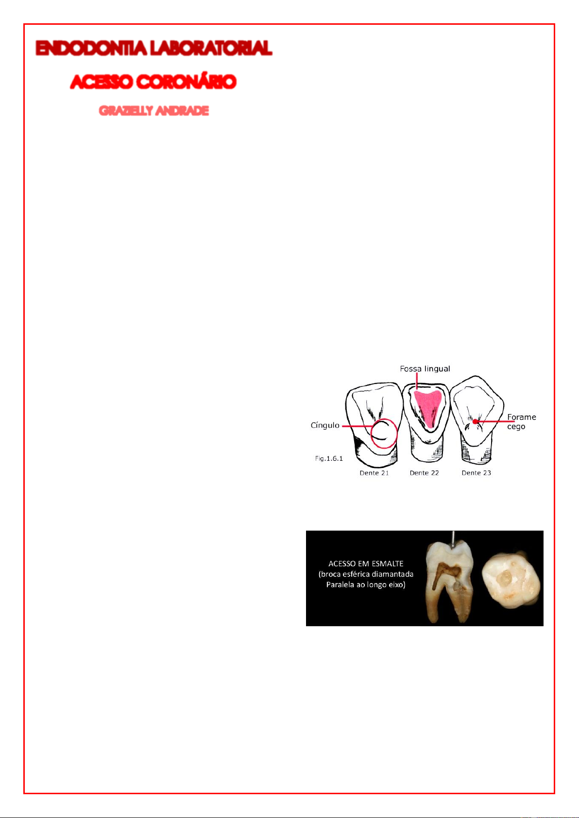 ENDODONTIA LABORATORIAL ACESSO CORONÁRIO GRAZIELLY ANDRADE Também chamado de abertura coronária, cirurgia de acesso, preparo intracoronário, acesso endodôntico; Abertura coronária -> preparo químico- mecânico -> obturação; Etapas do tratamento endodôntico - Radiografia inicial (diagnóstico); - Anestesia; - Abertura coronária; - Isolamento absoluto; - Odontometria; - Preparo químico-mecânico; - Medicação intracanal; - Obturação; - Restauração provisória; Na cavidade pulpar, deve ser realizado a limpeza, antissepsia e a localização dos orifícios dos condutos; Qual a importância da radiografia inicial no acesso coronário? - Diagnóstico; - Visualização de inclinação do dente; - Presença e extensão da lesão cariosa; - Localização dos cornos pulpares; - Calcificação; - Curvaturas; - Espessura de esmalte e dentina; - Presença de perfurações; PONTO DE ELEIÇÃO Ponto inicial que a broca será inserida (direção de trepanação); A broca será esférica diamantada (1012, 1014, 1016), dependendo do tamanho da coroa; Caneta de alta rotação com refrigeração; Manter cuidado com a velocidade e força em direção apical à câmara pulpar; Antes de acessar a câmara pulpar todo tecido cariado deve ser removido (diminuição de contaminação); - Nos incisivos e caninos superiores: face palatina, acima do cíngulo; - Nos incisivos e caninos inferiores: face lingual, acima do cíngulo; - Nos pré molares e molares: face oclusal, próximo do sulco central; Após o ponto de eleição e penetração na câmara pulpar, deve-se realizar a forma de contorno; DIREÇÃO DE TREPANAÇÃO Modo e ângulo que a broca diamantada irá penetrar no dente para que a câmara pulpar possa ser acessada; Nos incisivos e caninos, inicialmente a broca deve estar perpendicular ao longo eixo do dente; Após a delimitação inicial, mudar a direção da broca para o longo eixo do dente (direção de trepanação); Nos molares e pré-molares, a broca deve ser paralela ao longo eixo do dente e próximo ao sulco principal; Após a delimitação da forma de contorno, deve-se colocar a broca em direção à raiz mais volumosa presente; Toda essa etapa, deve-se ser feita sem isolamento absoluto; Pode-se usar TOP DAM (barreira gengival), se necessário for; FORMA DE CONVENIÊNCIA Será a remoção do teto da câmara pulpar, do ombro, até atingir o canal mais volumoso; Broca paralela ao longo eixo do dente e próximo ao sulco principal; Após a delimitação da forma de contorno, colocar a broca em direção à raiz mais volumosa; Usa-se broca de ponta inativa também; A sonda explorador auxilia na localização da câmara pulpar e dos canais radiculares, ele irá percorrer o assoalho da câmara pulpar em busca de orifícios de entrada dos canais radiculares, podendo auxiliar na verificação da inclinação (refinamento) Deve-se lembrar sempre: - Dentes com necessidade de tto endodôntico, raramente estarão com aspectos hígidos; - Deve-se remover toda dentina cariada; - Em caso de restaurações extensas ou coroas deve ser avaliado a necessidade de remoção ou adaptação do acesso; - Dentes já acessados anteriormente: radiografia prévia essencialmente; FORMA DE CONTORNO Determina o contorno final da abertura; Utiliza-se brocas com ponta inativa, de preferência Endo-Z (3082 e 3080 também); Seguir o desenho da forma de contorno preestabelecido; Slides: prof°. Cecília Guerra