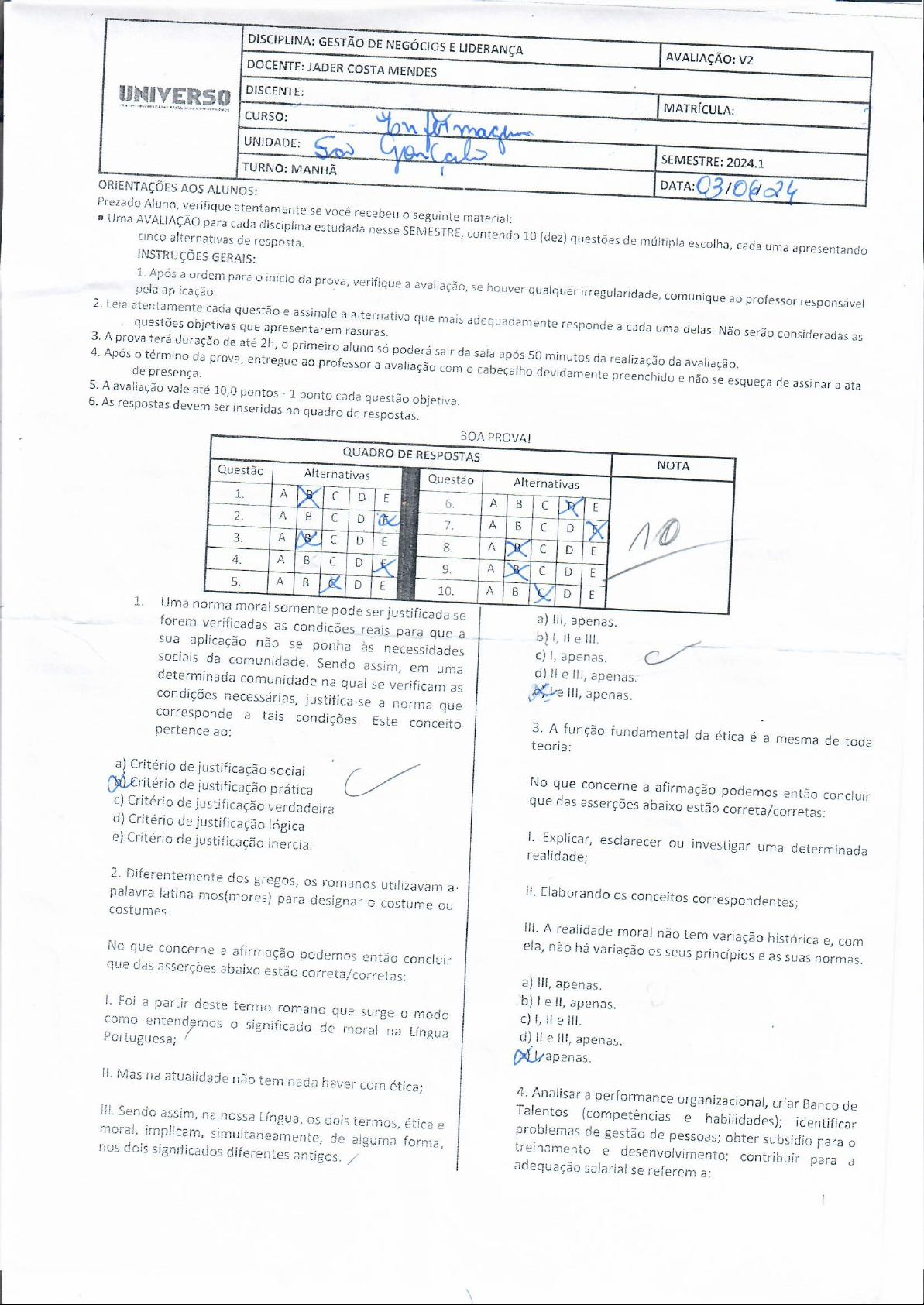 DISCIPLINA: GESTÃO DE NEGÓCIOS E LIDERANÇA AVALIAÇÃO: V2 DOCENTE: JADER COSTA MENDES DISCENTE: MATRÍCULA: UNIVERSO CURSO: UNIDADE: SEMESTRE: 2024.1 TURNO: MANHÃ DATA: 03/06/24 ORIENTAÇÕES AOS ALUNOS: Prezado Aluno, verifique atentamente se você recebeu seguinte material: Uma AVALIAÇÃO para cada disciplina estudada nesse SEMESTRE, contendo 10 (dez) questões de múltipla escolha, cada uma apresentando cinco alternativas de resposta. INSTRUÇÕES GERAIS: 1. Após a ordem para início da prova, verifique a avaliação, se houver qualquer irregularidade, comunique ao professor responsável pela aplicação. 2. Leia atentamente cada questão e assinale a alternativa que mais adequadamente responde a cada uma delas. Não serão consideradas as questões objetivas que apresentarem rasuras. 3. A prova terá duração de até 2h, primeiro aluno só poderá sair da sala após 50 minutos da realização da avaliação. 4. Após término da prova, entregue ao professor a avaliação com cabeçalho devidamente preenchido e não se esqueça de assinar a ata de presença. 5. A avaliação vale até 10,0 pontos 1 ponto cada questão objetiva. 6. As respostas devem ser inseridas no quadro de respostas. BOA PROVA! QUADRO DE RESPOSTAS NOTA Questão Alternativas Questão Alternativas 1. A D E 6. A E 2. A B C D 7. A B D X no 3. A D E 8. A X D E 4. A B D 9. A D E 5. A B D E 10. A B D E 1. Uma norma moral somente pode ser justificada se a) III, apenas. forem verificadas as condições reais para que a b) e III. sua aplicação não se ponha às necessidades c) I, apenas. sociais da comunidade. Sendo assim, em uma d) e III, apenas. determinada comunidade na qual se verificam as III, apenas. condições necessárias, justifica-se a norma que corresponde a tais condições. Este conceito 3. A função fundamental da ética é a mesma de toda pertence ao: teoria: a) Critério de justificação social No que concerne a afirmação podemos então concluir Critério de justificação prática que das asserções abaixo estão correta/corretas: c) Critério de justificação verdadeira d) Critério de justificação lógica Explicar, esclarecer ou investigar uma determinada e) Critério de justificação inercial realidade; 2. Diferentemente dos gregos, os romanos utilizavam II. Elaborando os conceitos correspondentes; palavra latina mos(mores) para designar 0 costume ou costumes. III. A realidade moral não tem variação histórica e, com ela, não há variação os seus princípios e as suas normas. No que concerne a afirmação podemos então concluir que das asserções abaixo estão correta/corretas: a) III, apenas. b) e II, apenas. I. Foi a partir deste termo romano que surge modo c) I, e III. como significado de moral na Língua d) e III, apenas. Portuguesa; apenas. Mas na atualidade não tem nada haver com ética; 4. Analisar a performance organizacional, criar Banco de Talentos (competências e habilidades); identificar III. Sendo assim, na nossa Língua, os dois termos, ética e problemas de gestão de pessoas; obter subsídio para moral, implicam, simultaneamente, de alguma forma, treinamento e desenvolvimento; contribuir para a nos dois significados diferentes antigos. adequação salarial se referem a:a) objetivos de um projeto institucional 8. absenteísmo ou ausentismo são os atrasos ou faltas b) passos de um sistema de gestão de pessoas ao trabalho, é a soma dos períodos em que os c) processos organizacionais colaboradores estão ausentes do trabalho. As principais d) processos informacionais causas podem envolver: objetivos e resultados da avaliação de desempenho No que concerne a afirmação podemos então concluir 5. Com base na definição de moral em Vázquez, que das asserções abaixo estão correta/corretas: podemos dizer que ética é: Doença comprovada ou não comprovada; No que concerne a afirmação podemos então concluir Baixa motivação para trabalhar que das asserções abaixo estão correta/corretas: III. Políticas inadequadas de gestão de pessoas e busca de melhores oportunidades. Parte da filosofia prática que objetiva elaborar uma reflexão sobre os problemas fundamentais da a) I, apenas. moral fundamentado em um estudo metafísico do e III. conjunto de regras da conduta considerada como c) e II, apenas. universalmente válida; d) e III, apenas. e) II, apenas. II. Embora a moral possua um caráter social, individuo tem um papel fundamental, pois a 9. Diversas são as condições ambientais sob as quais se moral exige a interiorização das normas e pode observar a atuação do profissional em seus deveres; respectivos espaços e relações de trabalho. Entre estas, podemos citar: III.É um fato social. a) sociedade secreta e ambiente exposto a) e III, apenas. sócio de uma empresa consorciada ou associada b) e II, apenas. c) demissões e permissões. apenas. d) comissão de qualidade e grupo inconstante. d) III, apenas. e) empresa falida e empresa secreta e) I, e III. 10. O pensamento de São Tomás de Aquino e afirma que: 6. Tipos de entrevistas aplicadas no processo seletivo: No que concerne a afirmação podemos então concluir I. Entrevista semiestruturada, com roteiro e perguntas que das asserções abaixo estão correta/corretas: elaboradas: II. Entrevista de admissão ou admissional 1.0 senso moral, é "sentimento imediato e absoluto da III. Entrevista não estruturada, totalmente aberta, lei reguladora do conhecimento e da ação práticos"; somente com tópicos Define-se "adequada e essencialmente pelo princípio IV. Entrevista preliminar de que é preciso fazer bem e evitar mal"; Afirma que homem é dotado de um senso moral Estão CORRETAS somente as afirmativas: natural, "no sentido de que possui uma infalibilidade resultante da própria natureza da a) Somente as afirmativas e III b) Somente as afirmativas II, III e IV. a) I, apenas. c) Somente as afirmativas e II b) e III, apenas. Somente as afirmativas e III e III. e) Todas as afirmativas estão 