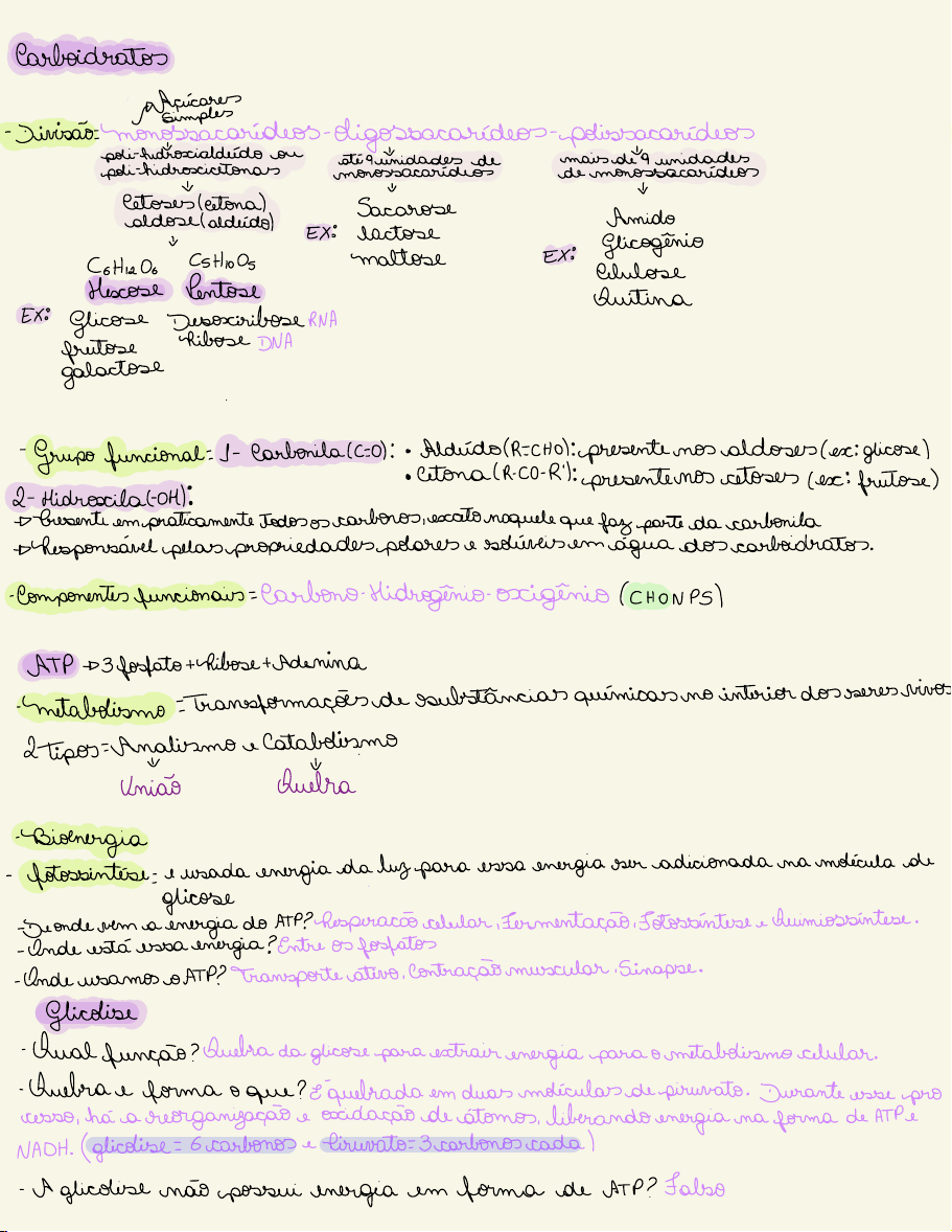 Carboidratos - atcucaressimples - Divisão:Monossacarídeos-oligossacarídeos -polissacarídeos poli-hotrascialdudo ou ↓ poli-hidroscictonas unidadescaridade maismonimidadedos ↓ ↓ ↓ letores extona Sacarose aldose aldudo Amido EX: lactose -- ↓ Glicogenio Cotti20o CsHioOs maltose EX: Clulose Hecose Pentose Quitina Ex: Glicose Desoscirilose RNA Ribose DNAprutosetactose · - Grupo funcional: 1-Carbonila/C=0 : · Aldúdo R=CHA :presentenos aldoses(ex: glicose) · Citona(R-CO-Rl : presentenos cetoses /es: Frutose Giroscitamente todosos carbonos , exatonaquele que fazparte dacarbonita -Responsávelpelaspropriedadespolares e solúveisemaguadoscarboidratos. -Componentes funcionais -CarbonoHidrogênio-Oxigênio (CHONPS) ATP3 fosfato +RiboseAdemina -Metabolismo :Transformaçõesde substâncias químicas no interior dosseresvivos 2Tipos-Analismo e Catabolismo↓ ↓ União Quebra -Bioenergia - fotossíntese e usada energiada luzpara essa energia ser adicionadanamolicula de · -Deonde vemaglicose do ATP?Respiração celular ,Fermentação , Fotossíntese e umiossintese - Onde está essaenergia ?Entre os fosfatos -OndeusamosoATP?Transporteativo, Contraçãomuscular ,Sinapse. Glicolise -Qual função ?Quebra da glicose paraextrairenergiapara ometabolismo celular. -Quebrae forma o que ? Equebrada em duas moléculasdepiruivato . Durante esse pro cesso, háa reorganização e occidação deátomos, liberandoenergiana forma de ATPe NADH . glicolise= G carbonos e Piruvato=carbonoscada - A glicolise não possi inergia em forma de ATPP Falso