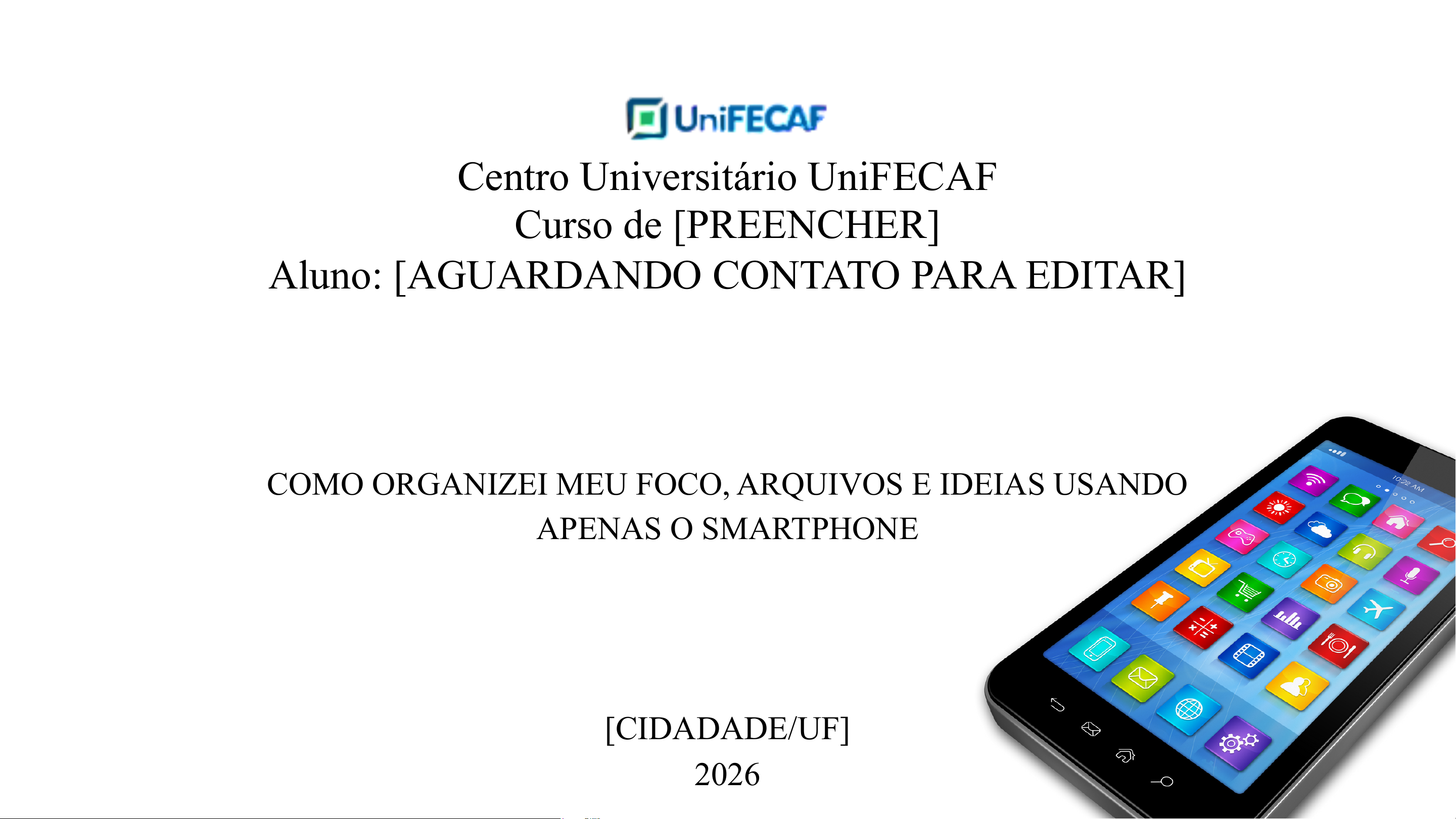 Centro Universitário UniFECAF MEU COMBO DE PRODUTIVIDADE MOBILE Aluno: [AGUARDANDO CONTATO PARA EDITAR] [CIDADADE/UF] 2026 COMO ORGANIZEI MEU FOCO, ARQUIVOS E IDEIAS USANDO APENAS O SMARTPHONE Curso de [PREENCHER] 1⃣ Foco fragmentado: Interrupções constantes por notificações durante os estudos. 2⃣ Desorganização digital: Arquivos espalhados entre Downloads, Drive e notas, sem padrão. 3⃣ Perda de ideias: Dificuldade para registrar ideias rapidamente no dia a dia. DIAGNÓSTICO: ONDE ESTAVA O PROBLEMA? IDENTIFIQUEI TRÊS PROBLEMAS PRINCIPAIS NO MEU DESEMPENHO: SOLUÇÃO 1 — TÉCNICA DE FOCO: POMODORO Para combater o foco fragmentado, utilizei a Técnica Pomodoro, que consiste em ciclos de 25 minutos de foco total, seguidos por 5 minutos de pausa. Essa técnica reduz a fadiga mental, combate a multitarefa e torna o estudo mais sustentável, especialmente no uso mobile. Como apliquei no smartphone: Usei uo próprio cronograma do celular Realizei ciclos de 25 minutos sem interrupções Pausas curtas para descanso mental Eu usei um cronômetro no meu celular para dividir as sessões de estudo. Sempre que eu começava a estudar, eu configurava o cronômetro para 25 minutos de trabalho focado, seguido de uma pausa de 5 minutos. POMODORO COMO IMPLEMENTEI NO CELULAR: Para apoiar a técnica Pomodoro, também utilizei vídeos no YouTube, com músicas de fundo e temporizadores baseados no método Pomodoro. Os vídeos fornecem uma contagem regressiva visual e sonora que me ajuda a manter o ritmo e a concentração durante os blocos de estudo de 25 minutos, além de garantir que eu respeite as pausas de 5 minutos. POMODORO COMO IMPLEMENTEI NO CELULAR: Para resolver a desorganização digital, implementei o Método PARA no Google Drive, organizando meus arquivos em quatro categorias principais: Projetos – atividades com prazo definido Áreas – responsabilidades contínuas Arquivo – conteúdos finalizados SOLUÇÃO 2: ORGANIZAÇÃO COM O MÉTODO PARA As automações criadas deram suporte direto à Técnica Pomodoro e ao Método PARA. Durante os ciclos de Pomodoro, o Modo Estudo ativa automaticamente o “Não Perturbe”, reduzindo distrações e protegendo o foco. SOLUÇÃO 3: AUTOMAÇÃO + CONEXÃO Após três semanas utilizando o Combo de Produtividade Mobile, observei melhora significativa na concentração, organização dos estudos e retenção de ideias. A Técnica Pomodoro ajudou a manter o foco de forma realista, enquanto o Método PARA organizou meus materiais e as automações reduziram o esforço necessário para manter o sistema funcionando. O smartphone deixou de ser uma fonte de distração e passou a ser uma ferramenta estratégica de produtividade. REFLEXÃO FINAL: RESULTADOS APÓS 3 SEMANAS CIRILLO, Francesco. The Pomodoro Technique: The Acclaimed Time-Management System That Has Transformed How We Work. New York: Currency, 2006. MAZER, F.; ALMEIDA, L.; PEREIRA, R. Gestão do Tempo: A Arte de Organizar a Vida Pessoal e Profissional. São Paulo: Editora Atlas, 2009. REFERÊNCIAS