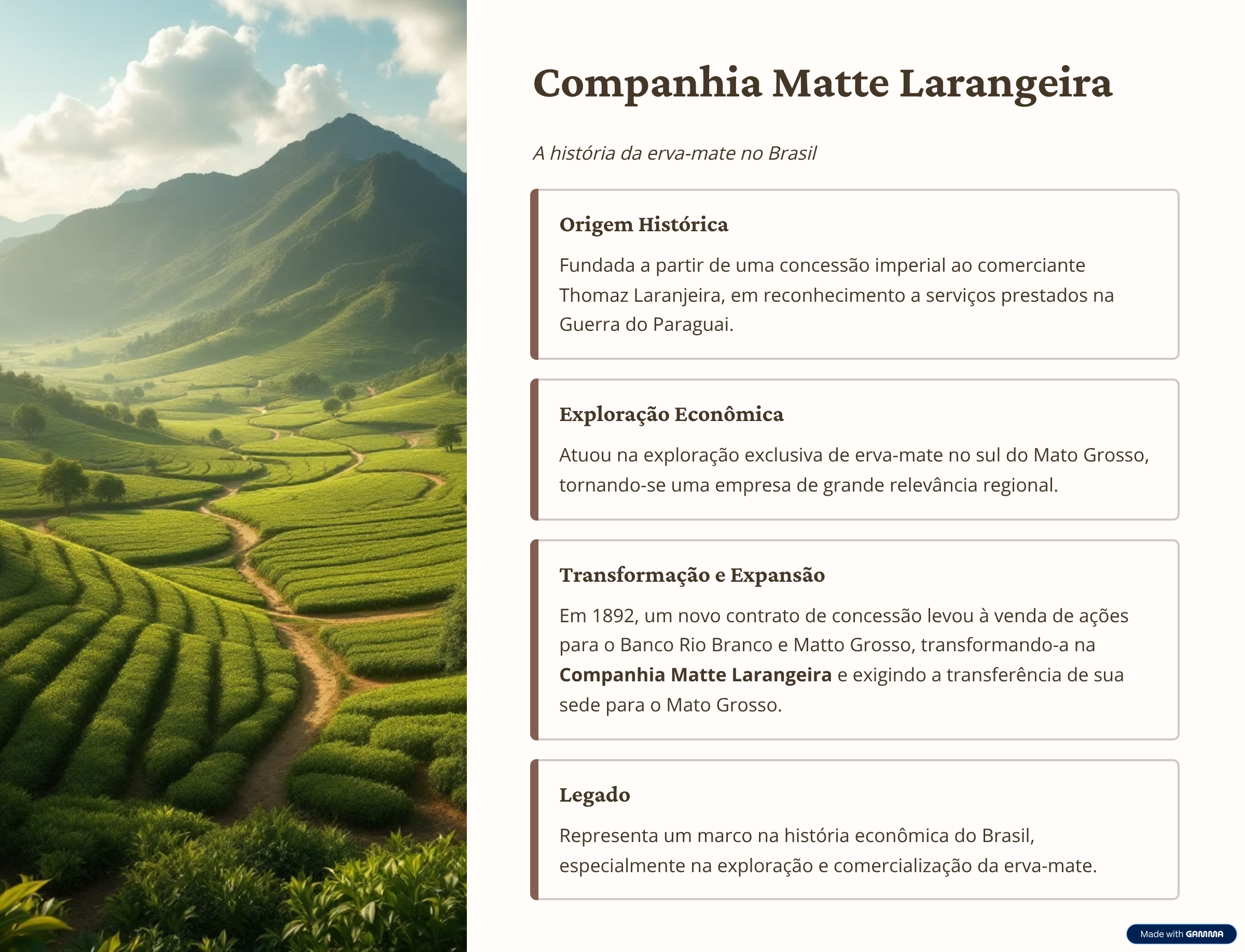 Companhia Matte Larangeira A história da erva-mate no Brasil Origem Histórica Fundada a partir de uma concessão imperial ao comerciante Thomaz Laranjeira, em reconhecimento a serviços prestados na Guerra do Paraguai. Exploração Econômica Atuou na exploração exclusiva de erva-mate no sul do Mato Grosso, tornando-se uma empresa de grande relevância regional. Transformação e Expansão Em 1892, um novo contrato de concessão levou à venda de ações para Banco Rio Branco e Matto Grosso, transformando-a na Companhia Matte Larangeira e exigindo a transferência de sua sede para Mato Grosso. Legado Representa um marco na história econômica do Brasil, especialmente na exploração e comercialização da erva-mate. Made with