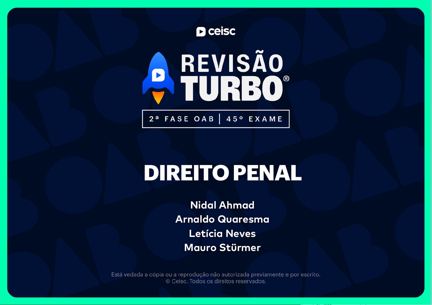 DIREITO PENAL Nidal Ahmad Arnaldo Quaresma Letícia Neves Mauro Stürmer 1. Revisão Turbo - Parte I.............................................................................................. 2. Revisão Turbo - Parte II............................................................................................ 3. Revisão Turbo - Parte III........................................................................................... 12 30 38 Revisão Turbo 2ª FASE OAB | PENAL | 45º EXAME SUMÁRIO Olá, aluno(a). Este material de apoio foi organizado com base nas aulas da Revisão Turbo do curso preparatório para a 2ª Fase OAB. Além disso, recomenda-se que o aluno assista as aulas acompanhado da legislação pertinente. Bons estudos, Equipe Ceisc. Atualizado em janeiro de 2026 Assuntos cobrados no Exame de Ordem Peças Exame Peça 43° 42º 41º 40º 39º 38º 37º 36º 35º XXXIV XXXIII XXXII XXXI XXX XXIX Contrarrazões de Apelação Resposta à Acusação Recurso de Apelação Recurso de Apelação Recurso de Apelação Agravo em Execução Memoriais Resposta à Acusação Apelação Recurso em Sentido Estrito Apelação Memoriais Recurso em Sentido Estrito Recurso de Apelação Agravo em Execução 03 44º Apelação no JECRIM Assuntos cobrados no Exame de Ordem XXVIII XXVII XXVI XXV (POA) XXV XXIV XXIII XXII XXI XX XIX XVIII XVII XVI XV XIV Recurso em Sentido Estrito Contrarrazões de Apelação/Razões do Apelado Memoriais Recurso de Apelação Resposta à Acusação Agravo em Execução Memoriais Recurso de Apelação Resposta à Acusação Memoriais Contrarrazões de Apelação Recurso de Apelação Memoriais Agravo em Execução Queixa-Crime Memoriais Exame Peça 04 Assuntos cobrados no Exame de Ordem XIII XII XI X IX VIII VII VI V IV 2010.3 2010.2 Recurso de Apelação Recurso de Apelação Recurso em Sentido Estrito Revisão Criminal Memoriais Resposta à acusação Apelação como Assistente de Acusação Pedido de Relaxamento de Prisão Recurso de Apelação Recurso de Apelação Recurso em Sentido Estrito Resposta à Acusação Exame Peça 05 Assuntos cobrados no Exame de Ordem Peças 0 2 4 6 8 10 12 14 Apelação Memoriais Recurso em Sentido Estrito Resposta à Acusação Agravo em Execução Contrarrazões de Apelação Queixa-crime Revisão Criminal Relaxamento de Prisão Apelação como Assistente de Acusação 06 Assuntos cobrados no Exame de Ordem Temas cobrados nas peças Quantidade de exames Temas 80 32 32 23 20 15 13 8 7 6 5 4 4 Teoria da Pena Crimes em espécie Tipicidade Princípios Nulidades Lei de Execução Penal – Lei 7.210/84 Extinção da Punibilidade Provas Tribunal do Júri Culpabilidade Lei de Drogas – Lei 11.343/06 Lei de Crimes Hediondos – Lei 8.072/90 Ilicitude 07 Assuntos cobrados no Exame de Ordem Quantidade de exames Temas 2 1 1 Lei Maria da Penha – Lei 11.340/06 Lei do Juizado Especial Criminal – Lei 9.099/95 Ação Penal 08 Assuntos cobrados no Exame de Ordem Temas de questões discursivas Quantidade de exames Temas 40 40 36 29 28 21 20 20 19 18 14 9 8 Crimes em espécie Tipicidade Recursos Teoria da pena Princípios Nulidades Extinção da punibilidade Lei de execução penal Prisão processual Competência Provas Ilicitude Lei de Drogas 09 Assuntos cobrados no Exame de Ordem Quantidade de exames Temas 6 6 5 5 5 4 4 4 2 2 2 2 2 Ações autônomas de impugnação Culpabilidade Lei de Organização Criminosa Lei Maria da Penha Juizado Especial Criminal Escusas Absolutórias Código de Trânsito Brasileiro Ação Penal Crimes contra o Sistema Financeiro Estatuto do Desarmamento Peças de 1º grau Queixa-Crime Citação 10 Assuntos cobrados no Exame de Ordem Quantidade de exames Temas 2 1 1 1 ANPP Procedimento do Júri Lei das Contravenções Penais Classificação dos crimes 11 Revisão Turbo - Parte I Peça: Relaxamento de Prisão Base legal: art. 310, I, CPP e art. 5º, LXV, CF/88 Teses: Buscar no enunciado ilegalidades na prisão. Prisão em Flagrante Ilegal Prisão em Flagrante Legal Peça: Liberdade Provisória Base legal: art. 310, III, CPP; art. 321, CPP; art. 350, CPP; art. 5º, LXVI, CF/88 Teses: Buscar no enunciado a ausência dos requisitos da preventiva (art. 321, CPP); excludente de ilicitude (art. 310, §1º, CPP). Lembre-se do seguimento processual e verifique onde o processo parou! Revisão Turbo: 2ª Fase Penal Pediu pra parar, parou! 12 Prisões Flagrante delito Relaxamento da prisãoPrisão ilegal Liberdade provisóriaPrisão legal Ausência dos requisitos da preventiva - Art. 321, CPP e Excludentes da ilicitude - Art. 310, §1º, CPP Medidas cautelares - Art. 319, CPP Formal ou material habeas corpus Se indeferido, habeas corpus Se indeferido, ROC Se denegado, ROC Se denegado, Quando for o caso de conversão da prisão em flagrante em preventiva não Fase extrajudicial Linha do tempo processual 13 habeas corpus Se indeferido,Prisão ilegal Prisão legal habeas corpus Se indeferido, ROC Se denegado, ROC Se denegado,relaxamento de prisão Pedido de revogação da temporária Pedido de Se o enunciado referir peça privativa de advogado habeas corpus Se indeferido,Prisão ilegal Prisão legal habeas corpus Se indeferido, ROC Se denegado, ROC Se denegado,relaxamento de prisão Pedido de revogação da preventiva Pedido de Juiz decreta a prisão preventiva Juiz decreta a prisão temporária Fase extrajudicial Linha do tempo processual 14 Princípio do Juiz Natural Art. 5º, CF: Inciso XXXVII: não haverá juízo ou tribunal de exceção; Inciso LIII: ninguém será processado nem sentenciado senão pela autoridade competente Lei processual que altera as regras de competência Art. 2º: A lei processual penal aplicar-se-á desde logo, sem prejuízo da validade dos atos realizados sob a vigência da lei anterior. Competência - espécies "Ratione materiae": em razão da matéria. "Ratione personae": em razão da pessoa. "Ratione loci": em razão do local. Jurisdição e competência Revisão Turbo: 2ª Fase Penal 15 Guia d