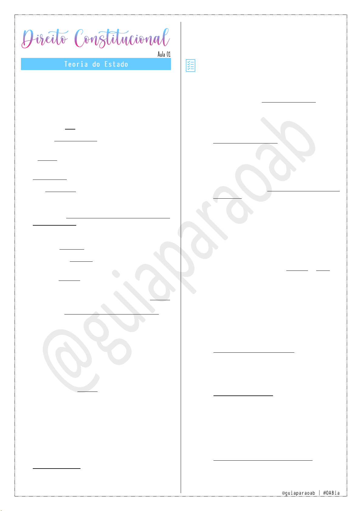 Poder constituinte: É uma teoria para justificar o poder do Estado. Há duas divisões no poder constituinte: I. Poder constituinte originário: É o poder que CRIA a constituição. É o poder inicial ou inaugural, pois é este poder que inaugurará a ordem jurídica. É ilimitado (está no topo da pirâmide, pode criar todos os direitos que desejar). Incondicionado. É um poder de fato (não há nenhuma ordem jurídica que dirá como deve ser a sua atuação). Constituição: possui normas constitucionais originárias, ou seja, que não se submetem ao controle de constitucionalidade. II. Poder constituinte derivado: É um poder secundário, pois derivou-se do poder originário. É um poder LIMITADO, deve observar as condições estabelecidas na constituição. É um poder de direito, pois é regulamentado pela constituição. Ex.: A Constituição possui cláusulas pétreas (CF 60, §4°, I a IV), que são conteúdos indisponíveis, que não podem ser abolidos. Esses direitos fundamentais só podem ser acrescidos, de acordo com o Princípio da Vedação ao Retrocesso Social. Ex’.: para que a CF seja alterada, é necessária votação de 3/5 em 2 turnos, nas 2 casas. Ex’’.: o Estado é proibido de alterar a CF na vigência do Estado de Defesa, Estado de Sítio e Intervenção Federal. → Espécies de poder constituinte derivado: a. Poder reformador (CF 60): É o poder que pode emendar a CF. A Emenda à CF está na mesma hierarquia que a CF. As Emendas Constitucionais estão sujeitas ao controle de constitucionalidade e, logo, podem ser declaradas inconstitucionais. b. Poder decorrente (CF 25): É o poder que os Estados têm, em face da autonomia dos entes federativos (União, Municípios, DF e Estado) de criar uma Constituição Estadual. c. Poder revisor (ADCT, 3°): Após 5 anos da promulgação da CF, este poder pode fazer uma grande revisão da Constituição como um todo. Uma vez exercido, não poderá mais o ser. d. Poder difuso: É o poder de alterar a CF sem alteração formal em seu texto, ou seja, somente através da interpretação constitucional. Quando ocorreria? Quando houver uma mutação constitucional: momento em que a sociedade evolui e a CF precisa acompanhar tal evolução. Ex.: conceito de família que deixou de ser no modelo tradicional. Usa-se o método da hermenêutica, chamada de interpretação conforme a CF. O poder judiciário escolhe um sentido que considera compatível com o texto constitucional. Ex.: ADPF 54 – hipóteses de aborto permitidas: a anencefalia foi incluída como uma hipótese condizente com a CF, mas não está em seu texto legal. Logo, com a inclusão da anencefalia, alterou-se o sentido, sem mudar o texto legal. Consequência Prática: - Neoconstitucionalismo (constitucionalismo contemporâneo): o Os Direitos Fundamentais devem ser concretizados; o Todos os poderes estão vinculados aos Direitos Fundamentais; o A CF é formada por princípios e regras. Os princípios requerem maior interpretação; o A CF tem força normativa; o Judicialização e ativismo (postura mais interventiva/pró ativa do poder judiciário); o Constitucionalização do direito (tudo passa pelo filtro da própria CF). Eficácia das normas constitucionais: Há três tipos de normas constitucionais: 1) Norma de eficácia plena (CF 5°, §1°): Também conhecida como direta e imediata. A norma como está posta na CF, já está apta a produzir seus efeitos diretos e imediatos. 2) Norma de eficácia contida: É plena no sentido de estar apta a produzir efeitos, mas normas infraconstitucionais podem “criar exigências” para o seu exercício. Ex: liberdade de profissão – a norma de eficácia contida cria exigências para o exercício da profissão, como a exigência de carteirinha da OAB para advogar, por exemplo. 3) Norma de eficácia limitada ou programática: É aquela que, para produzir integralmente seus efeitos, necessita do programa normativo (da norma integralizadora), que é uma legislação dizendo como será exercido esse direito. Podem ser atacadas via mandado de injunção, porque ele surge para atacar uma omissão legislativa. Constituições do Brasil: 1. 1824 (Constituição do Império): • 4 poderes (Moderador + 3 poderes) 2. 1891 (Constituição Federalista Republicana): • Federalista; • Separação de Poderes • Criação do STF 3. 1934 (Constituição Getulista): • Direitos Sociais e Trabalhistas; • Evolução do controle de constitucionalidade • Ampliação dos Direitos e Garantias Individuais (habeas corpus, mandado de segurança). 4. 1937 (Constituição Polaca): • O CN faria em última instância o controle de constitucionalidade; • Retirou várias garantias (inclusive o Mandado de Segurança). 5. 1946 (Redemocratização): • Ampliação dos Direitos e Garantias Individuais, Sociais e Controle de Constitucionalidade 6. 1967 (Ditadura): • EC 69: atos institucionais; • Antidemocracia. 7. 1968 (Constituição cidadã): • Ampliação de Direitos Fundamentais e Sociais; • Promulgada; • Formal (documento solene) • Heterodoxa (vários dogmas) • Amplia o controle e participação popular. • Remédios constitucionais (habeas corpus, habeas data). • Dirigente/ compromissária; • Rígida: só pode ser alterada mediante Emenda. Divisão interna da Constituição: Preâmbulo: parte inaugural; O STF decidiu que o preâmbulo não tem força normativa, porque continha a palavra (sobre a proteção de Deus) e o Brasil possui um Estado laico. Assim, o STF “resolveu o problema” decidindo que o preâmbulo não possui força normativa e, portanto, não pode ser base para a declaração de inconstitucionalidade de uma norma. Corpo: regras e princípios; ADCT (Ato das Disposições Constitucionais Transitórias). 1ª – Direitos Civis e Políticos: Surge no período pós Revoluções Liberais (Revolução Americana de 1776 e Revolução Francesa de 1789). A 1ª geração é marcada por: • Titularidade individual