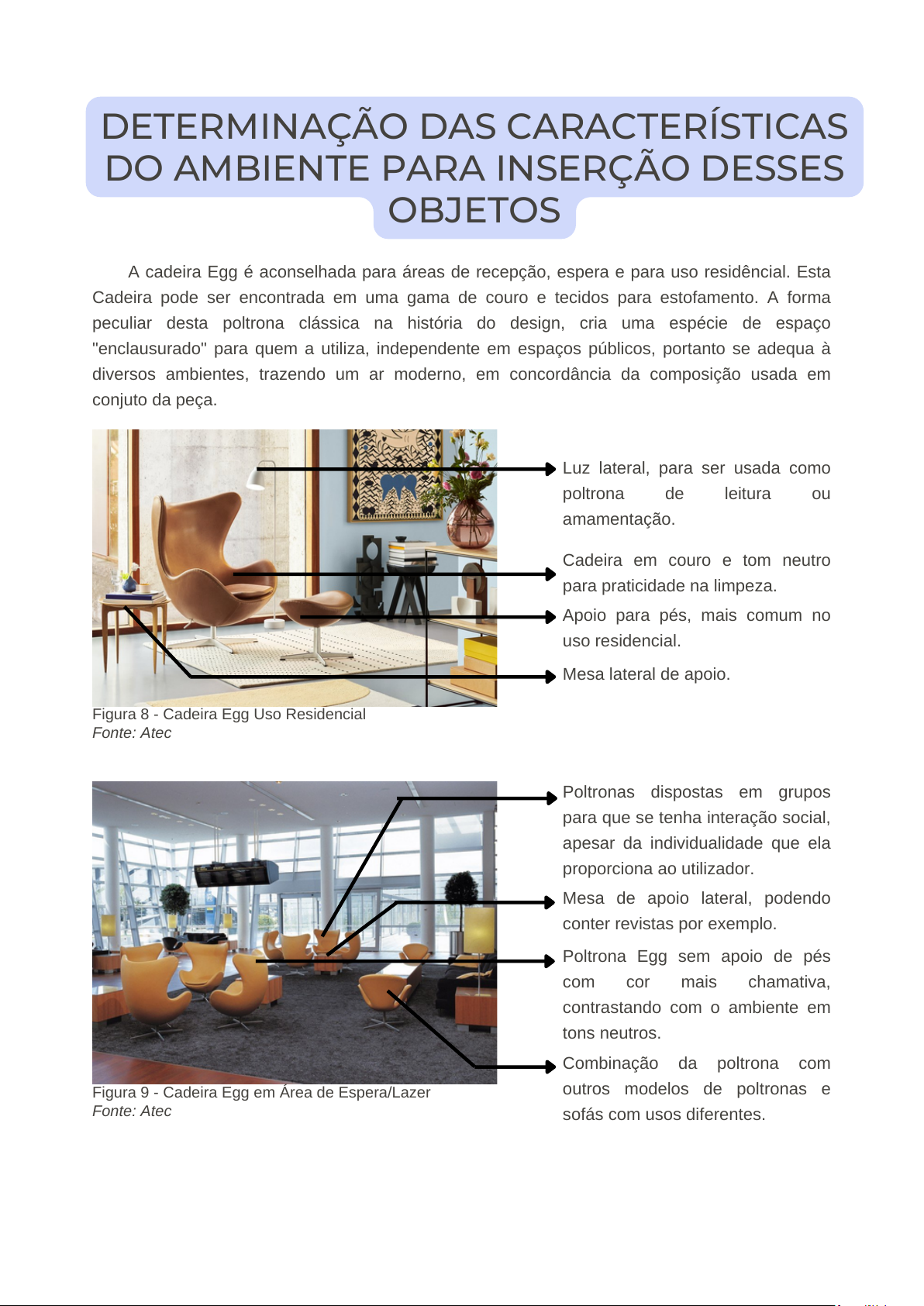 A cadeira Egg é aconselhada para áreas de recepção, espera e para uso residêncial. Esta Cadeira pode ser encontrada em uma gama de couro e tecidos para estofamento. A forma peculiar desta poltrona clássica na história do design, cria uma espécie de espaço "enclausurado" para quem a utiliza, independente em espaços públicos, portanto se adequa à diversos ambientes, trazendo um ar moderno, em concordância da composição usada em conjuto da peça. Figura 8 - Cadeira Egg Uso Residencial Fonte: Atec Cadeira em couro e tom neutro para praticidade na limpeza. Luz lateral, para ser usada como poltrona de leitura ou amamentação. Apoio para pés, mais comum no uso residencial. Mesa lateral de apoio. Figura 9 - Cadeira Egg em Área de Espera/Lazer Fonte: Atec Poltrona Egg sem apoio de pés com cor mais chamativa, contrastando com o ambiente em tons neutros. Mesa de apoio lateral, podendo conter revistas por exemplo. Combinação da poltrona com outros modelos de poltronas e sofás com usos diferentes. Poltronas dispostas em grupos para que se tenha interação social, apesar da individualidade que ela proporciona ao utilizador. DETERMINAÇÃO DAS CARACTERÍSTICAS DO AMBIENTE PARA INSERÇÃO DESSES OBJETOS A cadeira Swan assim como a poltrona Egg foi projetada para uso comercial para as áreas de espera e lounge do Royal Hotel de Copenhague, em 1958 para lobbies, áreas de estar, e atualmente até mesmo em residências como peça chave sem item independente ou como um par, combinando com uma mesa lateral ou como uma cadeira individual. Figura 10 - Cadeira Swan Uso Residencial Fonte: Clique Arquitetura Cadeira Swan como ponto de destaque nesta sala de jantar, trazendo cor ao ambiente e muito conforto. Mesa com pés semelhantes ao da cadeira para criar a impressão de conjunto. Figura 11 - Cadeira Swan Lobby do SAS Royal Hotel Fonte: Essência móveis Cadeira Swan presente até hoje no lobby do SAS Royal Hotel, ficando à disposição do público. Mesa central na mesma tonalidade das cadeira. Restante do salão com poucos itens, trazendo maior destaque para as cadeiras e levando as pessoas à utilizá-las. Figura 12 - Cadeira Swan Quarto 606 do SAS Royal Hotel Fonte: Essência móveis Cadeira Swan em tom pastel, contrastando com as tonalidades do ambiente. Combinação de estofados, incluindo a cadeira Egg, todos na mesma cor. Sempre com mesa de apoio pois é uma cadeira muito versátil, podendo ser usada para descanso, leitura, reuniões, refeições, etc. https://www.atec.com.br/produtos/egg-lounge-chair DETERMINAÇÃO DAS CARACTERÍSTICAS DO AMBIENTE PARA INSERÇÃO DESSES OBJETOS A cadeira Swan assim como a poltrona Egg foi projetada para uso comercial para as áreas de espera e lounge do Royal Hotel de Copenhague, em 1958 para lobbies, áreas de estar, e atualmente até mesmo em residências como peça chave sem item independente ou como um par, combinando com uma mesa lateral ou como uma cadeira individual. Mesa com pés semelhantes ao da cadeira para criar a impressão de conjunto. Cadeira Swan como ponto de destaque nesta sala de jantar, trazendo cor ao ambiente e muito conforto. Figura 10 - Cadeira Swan Uso Residencial Fonte: Clique Arquitetura Figura 11 - Cadeira Swan Lobby do SAS Royal Hotel Fonte: Essência móveis Restante do salão com poucos itens, trazendo maior destaque para as cadeiras e levando as pessoas à utilizá-las. Mesa central na mesma tonalidade das cadeira. Cadeira Swan presente até hoje no lobby do SAS Royal Hotel, ficando à disposição do público. Figura 12 - Cadeira Swan Quarto 606 do SAS Royal Hotel Fonte: Essência móveis Sempre com mesa de apoio pois é uma cadeira muito versátil, podendo ser usada para descanso, leitura, reuniões, refeições, etc. Cadeira Swan em tom pastel, contrastando com as tonalidades do ambiente. Combinação de estofados, incluindo a cadeira Egg, todos na mesma cor.