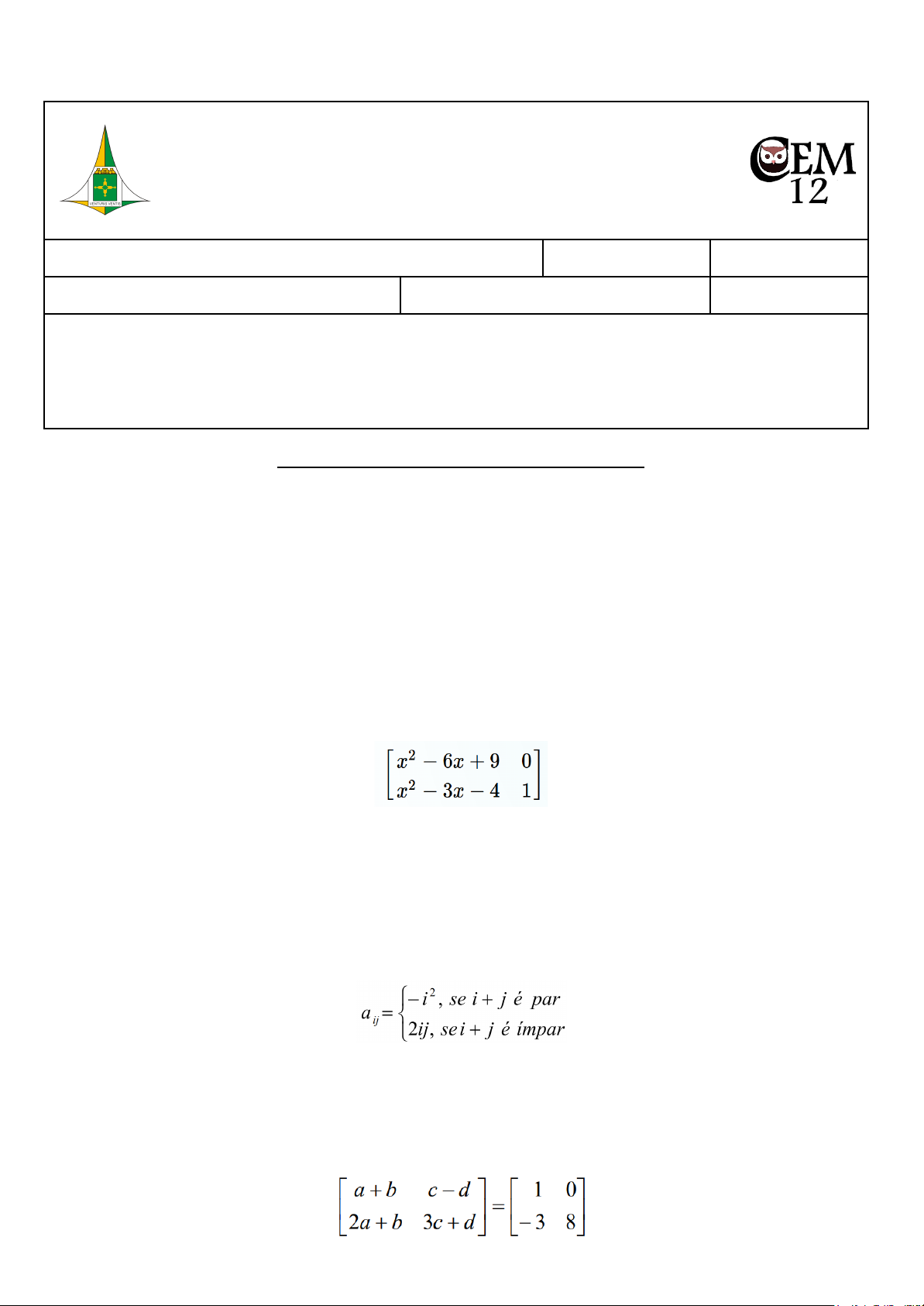 ATIVIDADE DE SALA - 1º BIMESTRE 1. Uma matriz é considerada matriz identidade se: a) os elementos da diagonal principal forem iguais a 1 e os demais elementos forem diferentes de 1. b) os elementos da diagonal principal forem iguais a 0 e os demais elementos forem iguais a 1. c) os elementos da diagonal principal forem diferentes de 0 e os demais elementos forem iguais a 1. d) os elementos da diagonal principal forem iguais a 1 e os demais elementos iguais a 0. 2. Sendo a matriz igual à matriz identidade de ordem 2, qual é o valor de ? 2𝑥 3. Uma matriz possui lei de formação . Qual é a soma dos termos da diagonal principal? 𝐴 5𝑥5 𝑎 𝑖𝑗 = 5𝑖 − 𝑗2 4. Dada a matriz tal que 𝐴 = (𝑎 𝑖𝑗 ) 3𝑥2 Determine: a) . b) . 𝑎 32 + 𝑎 42 𝐴𝑡 5. Determine , , e , sabendo que 𝑎 𝑏 𝑐 𝑑 Governo do Distrito Federal Secretaria de Estado de Educação Coordenação Regional de Ensino de Ceilândia Centro de Ensino Médio 12 Estudante: Série: 3ª Turma: Professor: Lucas Santos Un. Curricular: Matemática Data: ● Leia com atenção os enunciados. ● Verifique se seu trabalho está completo. ● Use caneta AZUL ou PRETA. ● Cuide da apresentação e organização do seu trabalho (evite rasuras). ● Lembre-se: ESSE É UM MOMENTO ÚNICO EM SEUS ESTUDOS. APROVEITE-O. BOM TRABALHO.