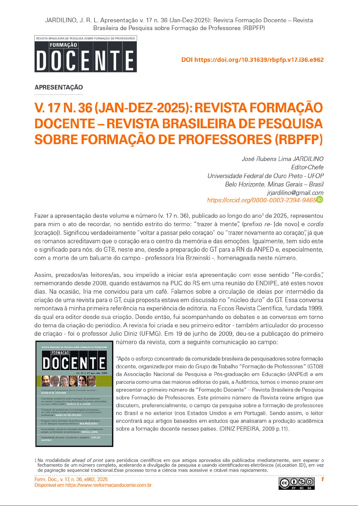 JARDILINO, J.R. L. Apresentação V. 17 n. 36 (Jan-Dez-2025): Revista Formação Docente Revista Brasileira de Pesquisa sobre Formação de Professores (RBPFP) REVISTA BRASILEIRA DE PESQUISA SOBRE FORMAÇÃO DE PROFESSORES FORMAÇÃO DOCENTE DOI https://doi.org/10.31639/rbpfp.v17.i36.e962 APRESENTAÇÃO V. 17 N.36 (JAN-DEZ-2025): REVISTA FORMAÇÃO DOCENTE REVISTA BRASILEIRA DE PESQUISA SOBRE FORMAÇÃO DE PROFESSORES (RBPFP) José Rubens Lima JARDILINO Editor-Chefe Universidade Federal de Ouro Preto UFOP Belo Horizonte, Minas Gerais Brasil jrjardilino@gmail.com https://orcid.org/0000-0003-2394-9465 Fazer a apresentação deste volume e número (v. 17 n. 36), publicado ao longo do ano¹ de 2025, representou para mim 0 ato de recordar, no sentido estrito do termo: "trazer à mente", (prefixo re- [de novo] e cordis [coração]). Significou verdadeiramente "voltar a passar pelo coração" ou "trazer novamente ao já que os romanos acreditavam que coração era centro da memória e das emoções. Igualmente, tem sido este 0 significado para nós, do GT8, neste ano, desde a preparação do GT para a RN da ANPED e, especialmente, com a morte de um baluarte do campo - professora Iria Brzeinski -, homenageada neste número. Assim, prezados/as leitores/as, sou impelido a iniciar esta apresentação com esse sentido "Re-cordis", rememorando desde 2008, quando estávamos na PUC do RS em uma reunião do ENDIPE, até estes novos dias. Na ocasião, Iria me convidou para um café. Falamos sobre a circulação de ideias por intermédio da criação de uma revista para GT, cuja proposta estava em discussão no "núcleo duro" do GT. Essa conversa remontava à minha primeira referência na experiência de editoria, na Eccos Revista Científica, fundada 1999, da qual era editor desde sua criação. Desde então, fui acompanhando os debates e as conversas em torno do tema da criação do periódico. A revista foi criada e seu primeiro editor também articulador do processo de criação foi professor Julio Diniz (UFMG). Em 19 de junho de 2009, deu-se a publicação do primeiro número da revista, com a seguinte comunicação ao campo: REVISTA PROFESSORES FORMACAO DOCENTE "Após esforço concentrado da comunidade brasileira de pesquisadores sobre formação docente, organizada por meio do Grupo de Trabalho "Formação de Professores" (GT08) 01 2009 da Associação Nacional de Pesquisa e Pós-graduação em Educação (ANPEd) e em parceria como uma das maiores editoras do país, a Autêntica, temos imenso prazer em Uma de pera formação apresentar primeiro número da "Formação Docente" Revista Brasileira de Pesquisa ZEICHNER produção sobre formação sobre Formação de Professores. Este primeiro número da Revista reúne artigos que um estudo das dissertações nos 1990 2000 MARLI discutem, preferencialmente, o campo da pesquisa sobre a formação de professores Formação um other sobre função professor conhecimento profissional MARIA DO no Brasil e no exterior (nos Estados Unidos e em Portugal). Sendo assim, o leitor sobre formação profissionals educação encontrará aqui artigos baseados em estudos que analisaram a produção acadêmica no histórica de educação problems do sobre a formação docente nesses países. (DINIZ PEREIRA, 2009 p.11). de professores MENGA A constantes CARLOS MARCELO 1 Na modalidade ahead of print para periódicos científicos em que artigos aprovados são publicados imediatamente, sem esperar o fechamento de um número completo, acelerando a divulgação da pesquisa e usando identificadores eletrônicos (eLocation ID), em vez de paginação sequencial tradicional.Esse processo torna a ciência mais acessível e citável mais rapidamente. Form. Doc., V. 17, n. 36, e962, 2025 1 Disponível em BY NC SAREVISTA BRASILEIRA DE PESQUISA SOBRE FORMAÇÃO DE PROFESSORES FORMAÇÃO DOCENTE DOI https://doi.org/10.31639/rbpfp.v17.i36.e962 professor Diniz-Pereira realizou a tarefa com afinco e maestria, como fazem os scholars de um campo, desbravando e consolidando os passos para a constituição do campo de pesquisa que vínhamos construindo e pleiteando ao longo de nossa experiência nas ANPED. Em 2012, com a revista já se consolidando desde primeiro número, que contava com publicações de autores de reconhecida trajetória no vol.1, n.1 publicaram- se artigos de cientistas bastante reconhecidos na área de formação docente no Brasil, como Íria Brzezinski, Marli André, Menga Ludke (GT8ANPED/Brasil) e internacionalmente, como Carlos Marcelo (US Espanha) Maria do Céu Roldão (U.C-Santarém Portugal) e Kenneth M. Zeichner com afinco e enfrentando asdificuldades de consolidação de uma nova revista no espaço científico, Diniz se dedicou quatro anos com exímio rigor e grande acuidade editorial, exigida a um editor acadêmico, publicando parte relevante da produção nacional e internacional sobre a formação de professores. Ao final de 2012, anunciou sua saída como editor-chefe da revista. 0 GT 08 indica, então, meu nome para a continuidade da empreitada, na qual permaneci por longos treze (13) anos. É chegada também a minha hora de passar o bastão. Por isso, transformo este editorial em um memorial, pouco alongado é certo, dadas as exigências do gênero textual que sempre abre esta revista. No volume 5, n. 8 de 2013², na continuidade do labor do professor Diniz Pereira. assumi FORMAÇÃO a chefia da editoria da Revista Brasileira de Pesquisa sobre Formação de Professores, DOCENTE até então conhecida com o seu nome abreviado de "Formação Docente". Nesse número, tive a oportunidade de ser editor de textos de importantes intelectuais do GT08 e de outros campos, tais como Marta Nörnberg (UFPel), atual coordenadora do GT08-Formação de Samuel Souza Neto (Unesp), Comitê Científico GT8/Anped;Rita Buzzi Rausch (GT8/FURB); Dário Fiorentini (Unicamp);Vera Maria Nigro de Souza Placco (PUC-SP), Regina Magna Bonifácio de Araujo (UFOP), dentre outros colegas. Sigo c
